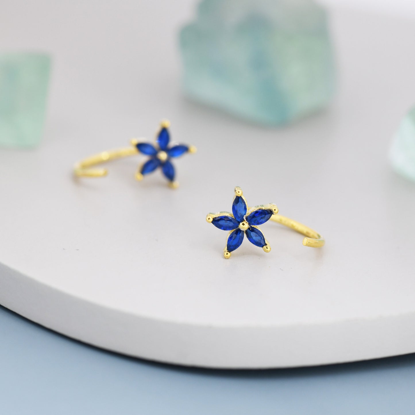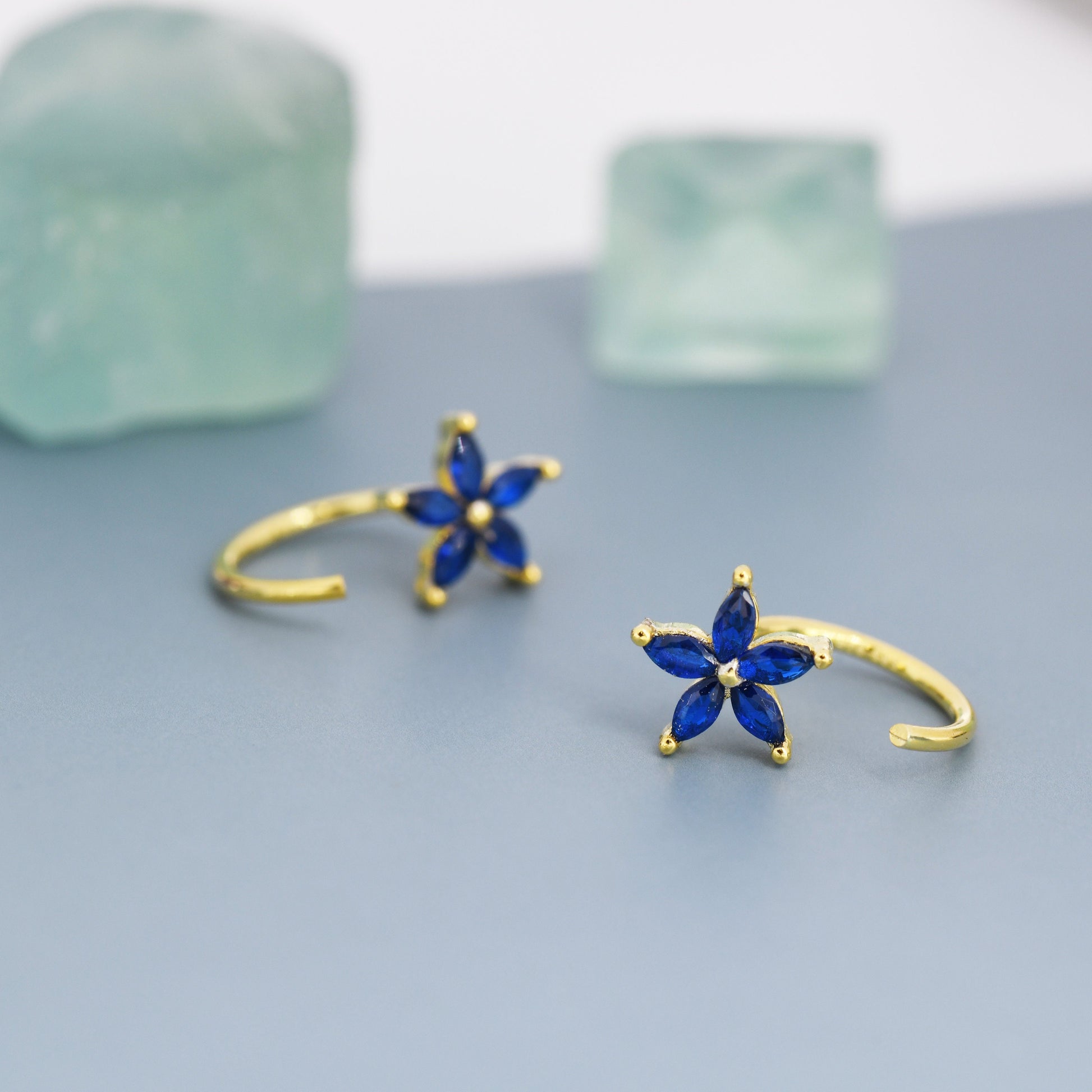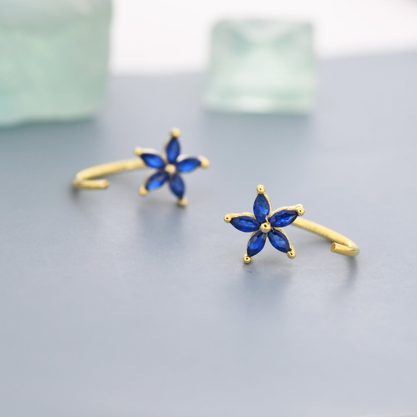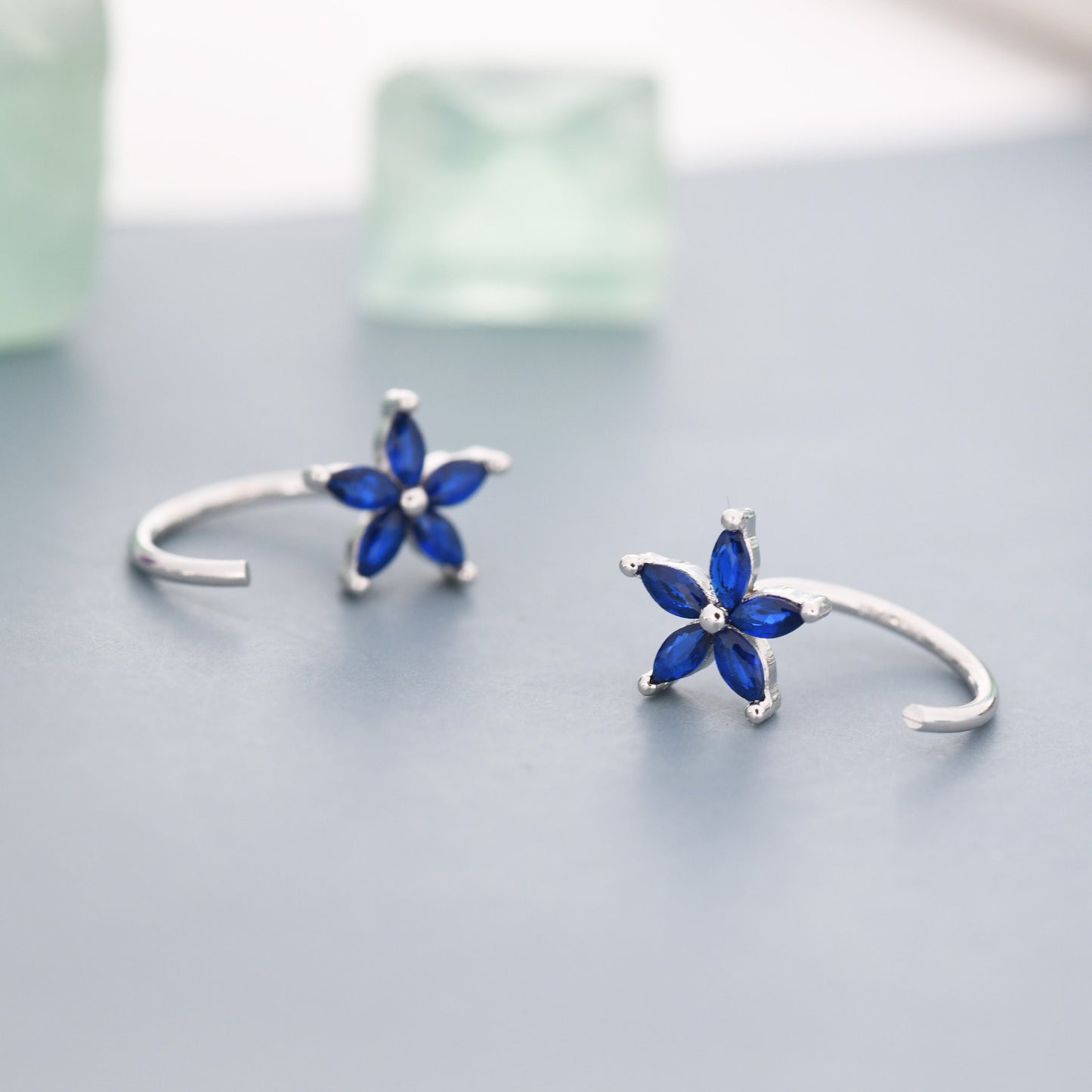 Sapphire Blue CZ Flower Huggie Hoop Earrings in Sterling Silver, Gold or Silver, Marquise CZ Flower Threader Hoop Earrings, Pull Through