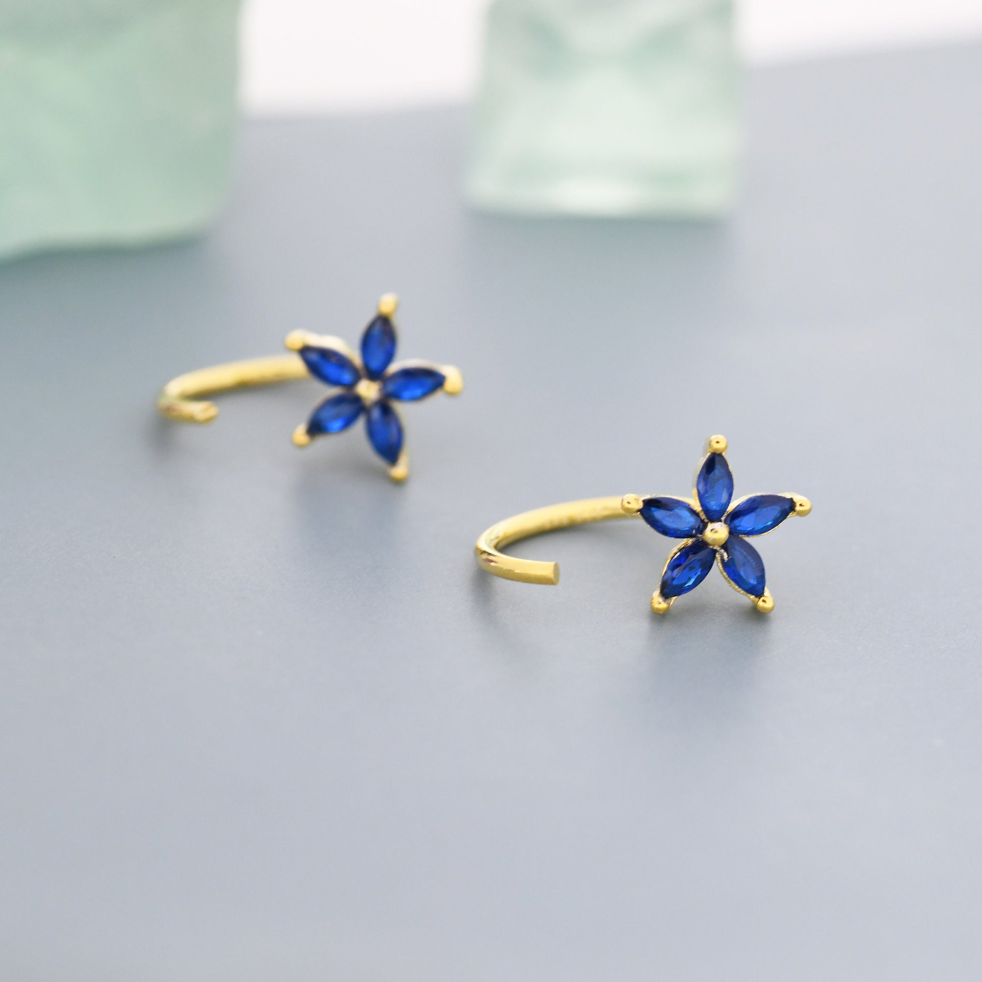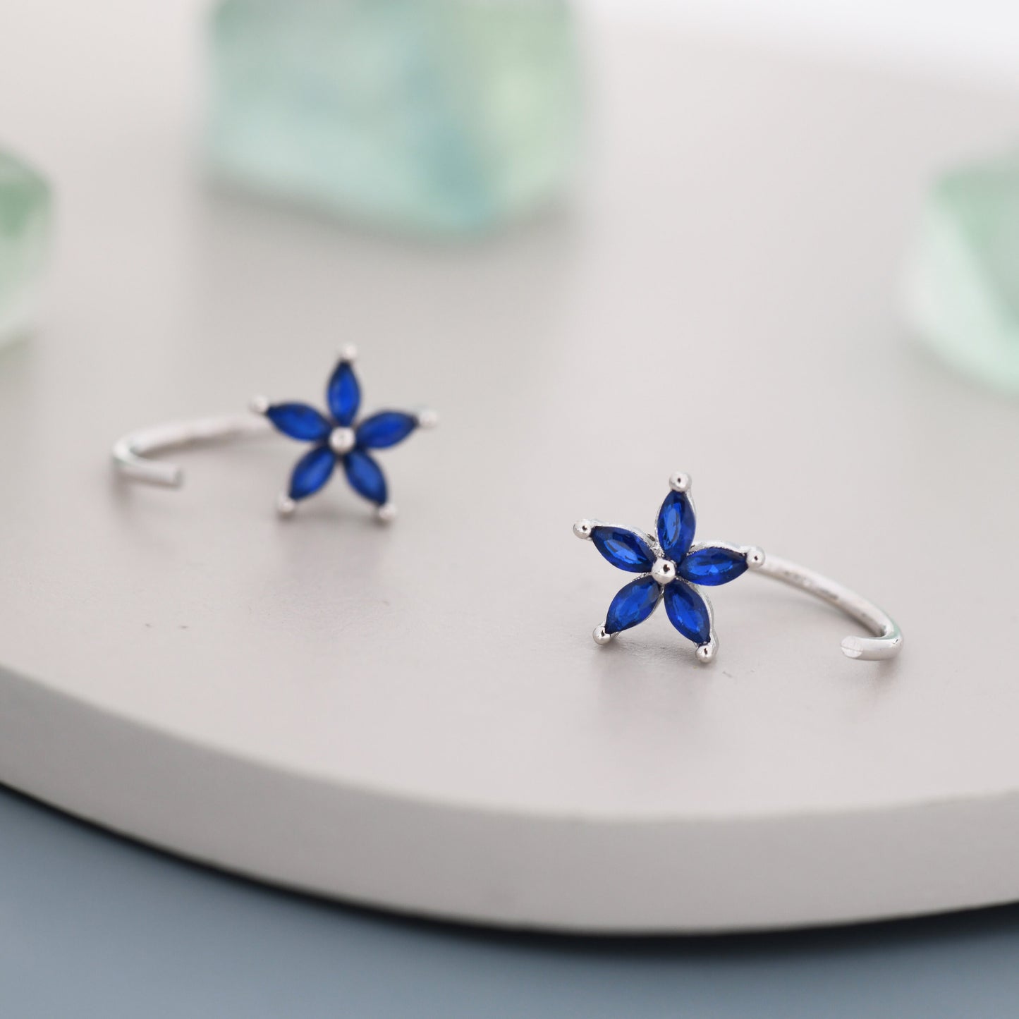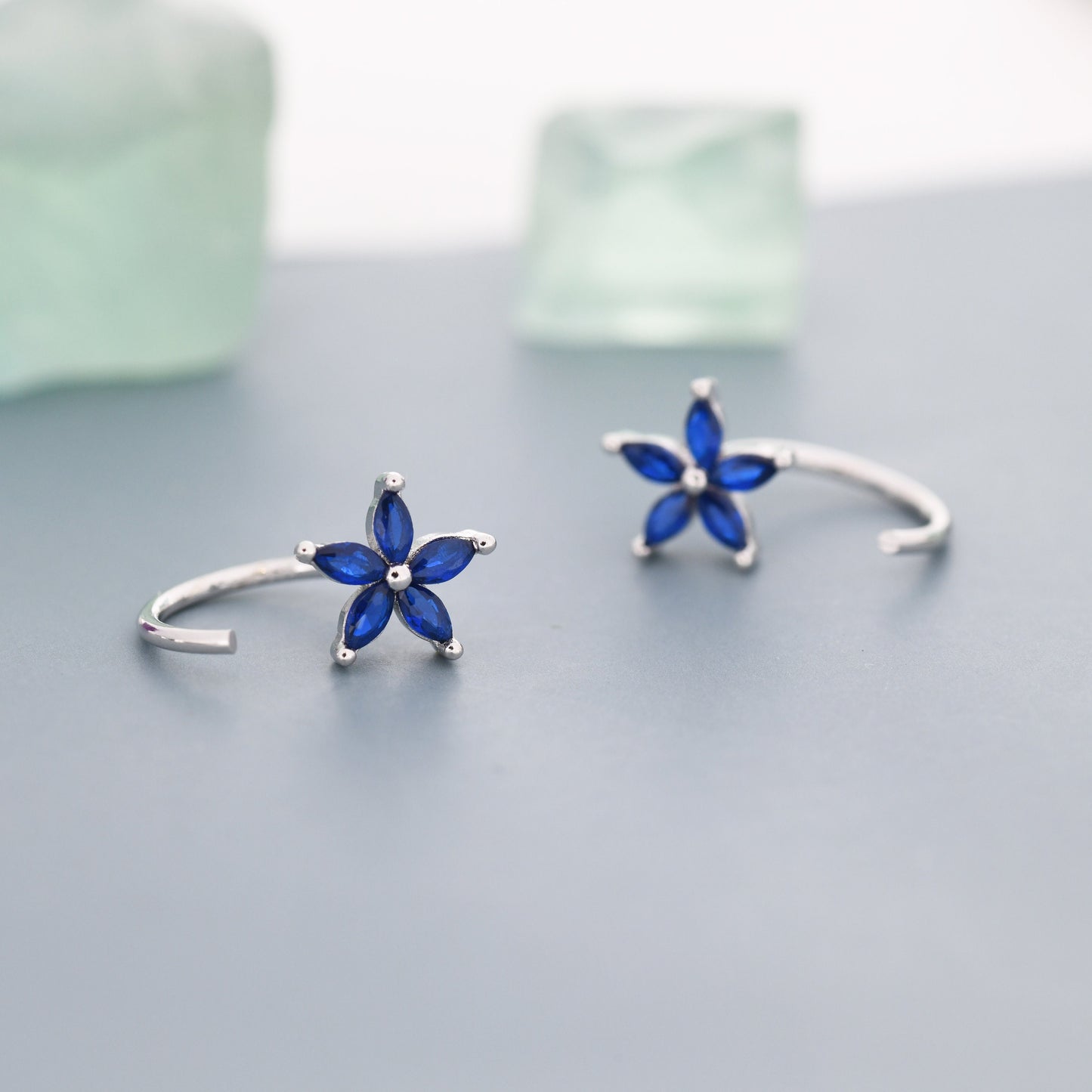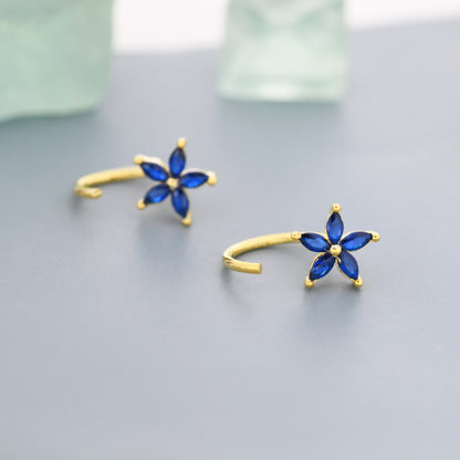 Sapphire Blue CZ Flower Huggie Hoop Earrings in Sterling Silver, Gold or Silver, Marquise CZ Flower Threader Hoop Earrings, Pull Through