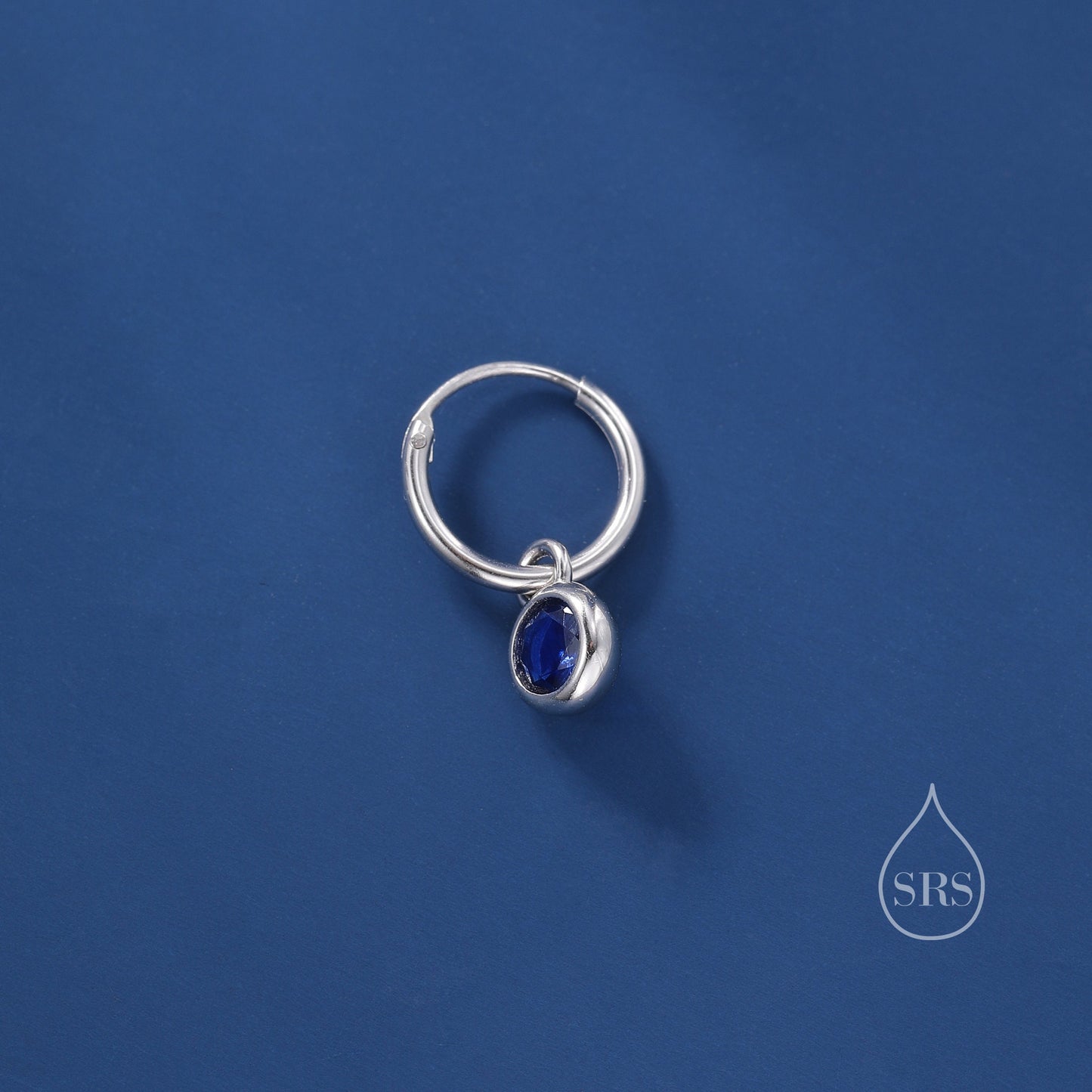 Sapphire Blue CZ Huggie Hoop Earrings in Sterling Silver with Sleeper Hoops, Detachable, Silver or Gold or Rose Gold, CZ Skinny Hoops Dimensions: Hoops measure 8mm inner diameter. 6mm stones.