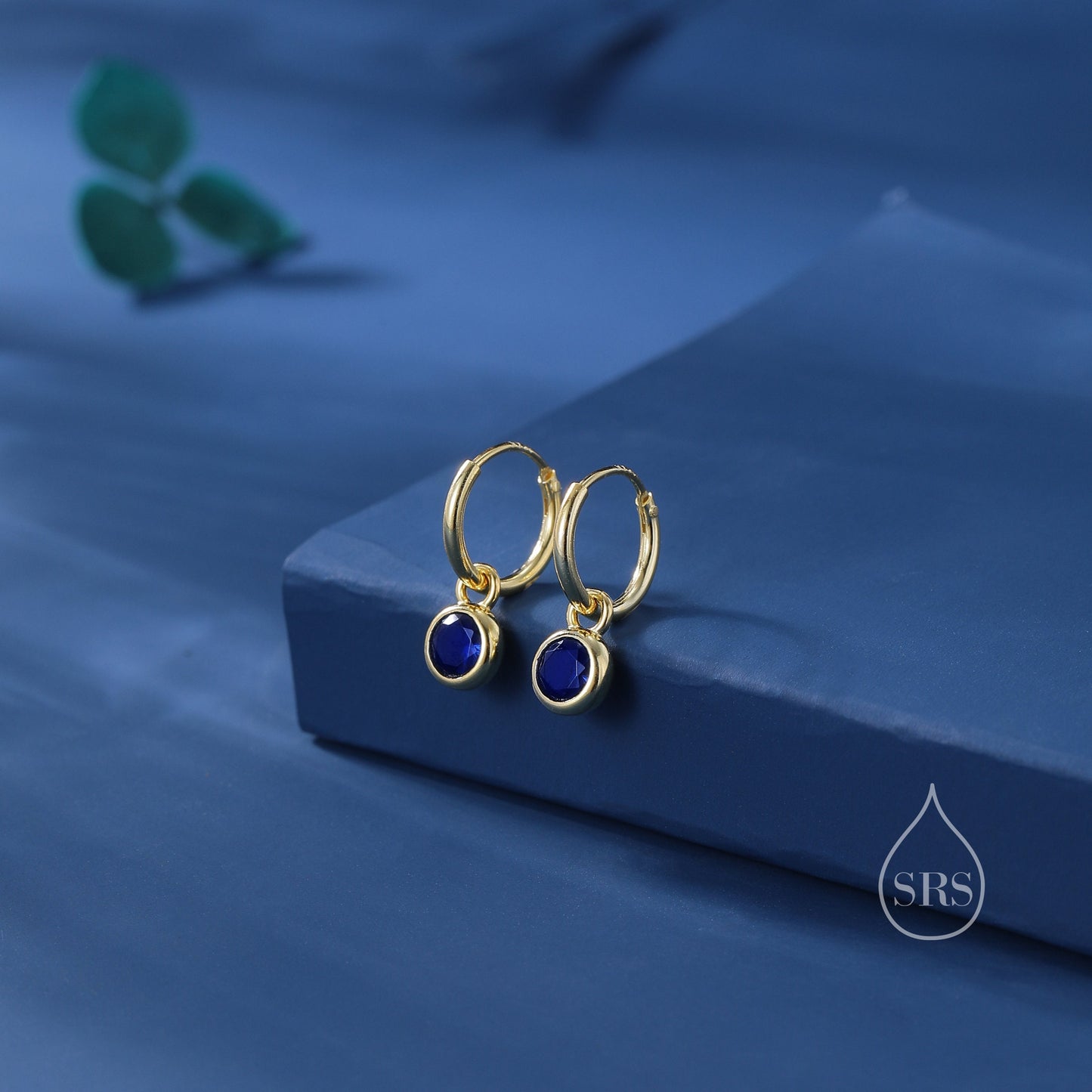 Sapphire Blue CZ Huggie Hoop Earrings in Sterling Silver with Sleeper Hoops, Detachable, Silver or Gold or Rose Gold, CZ Skinny Hoops