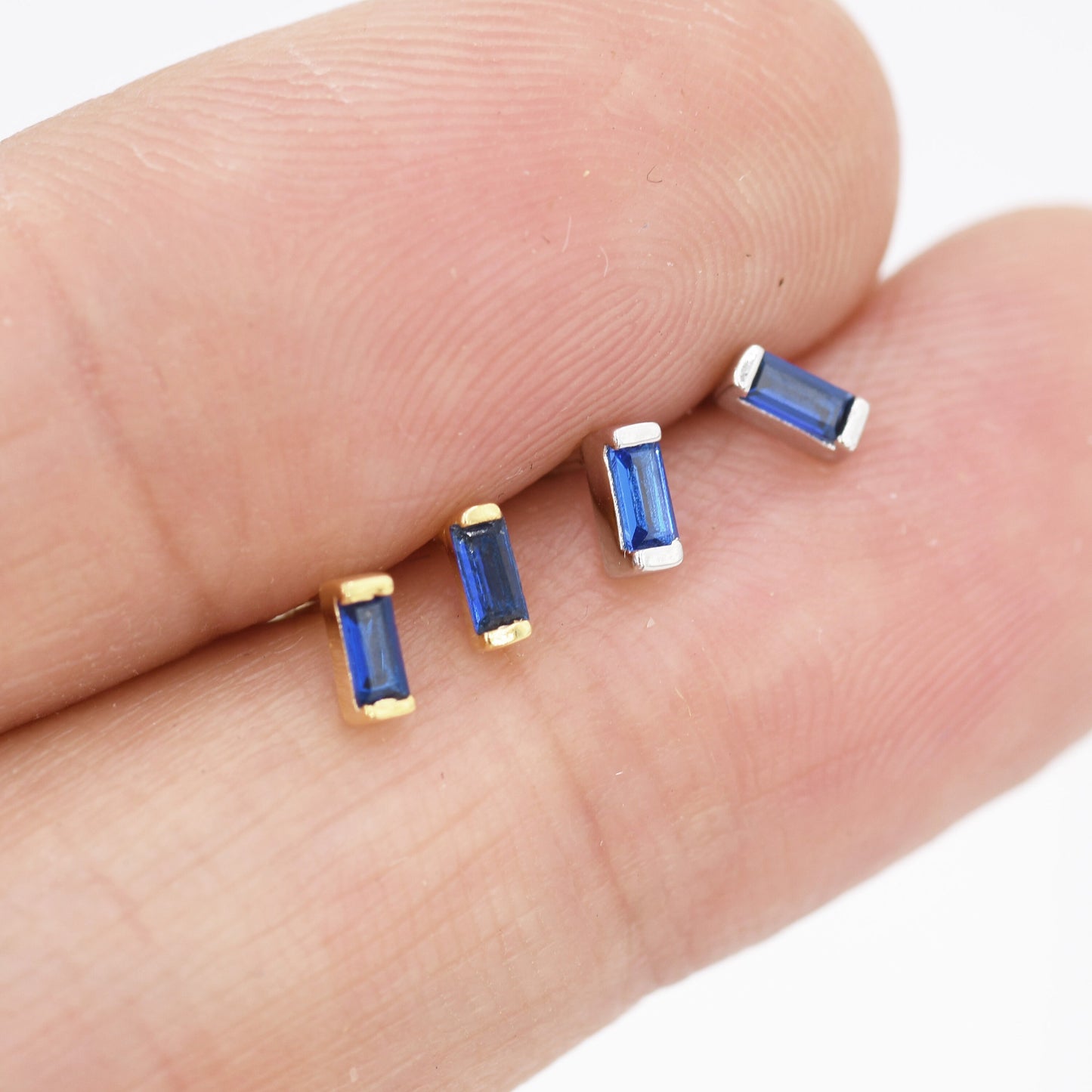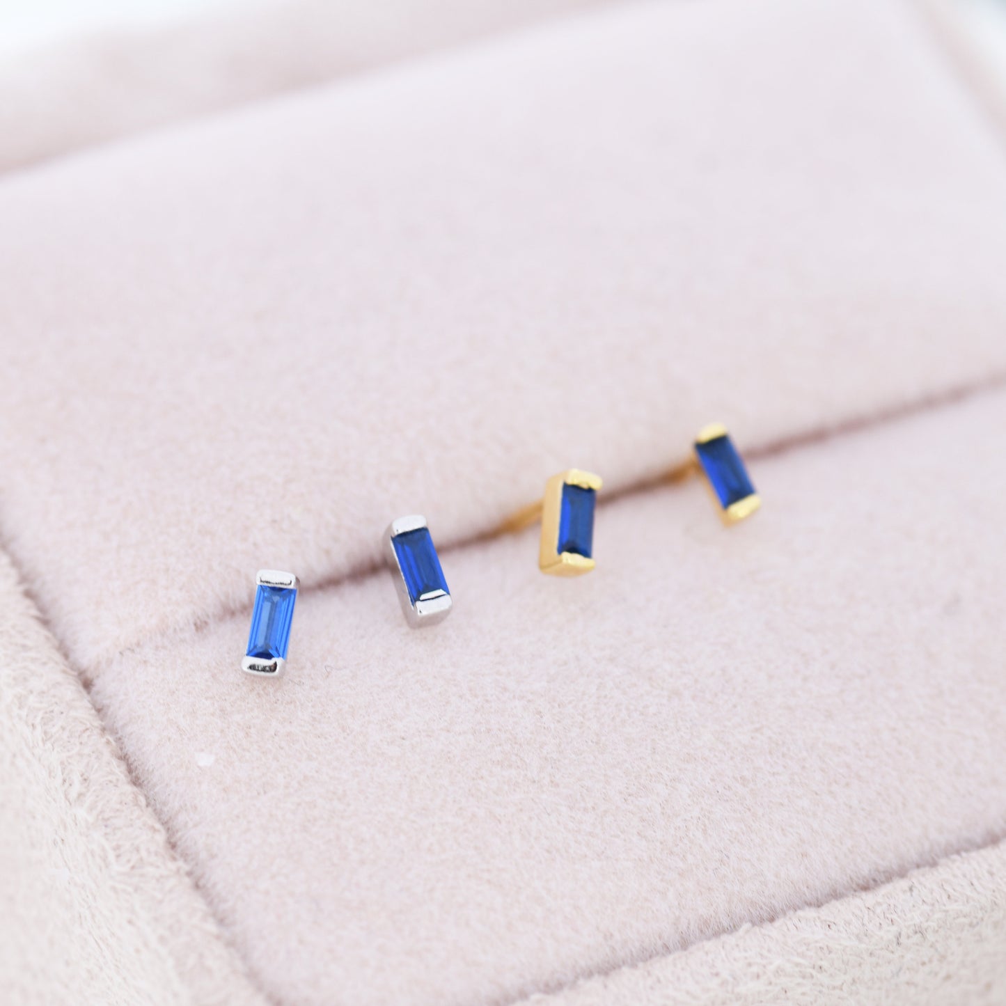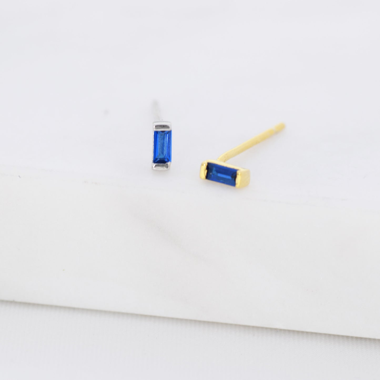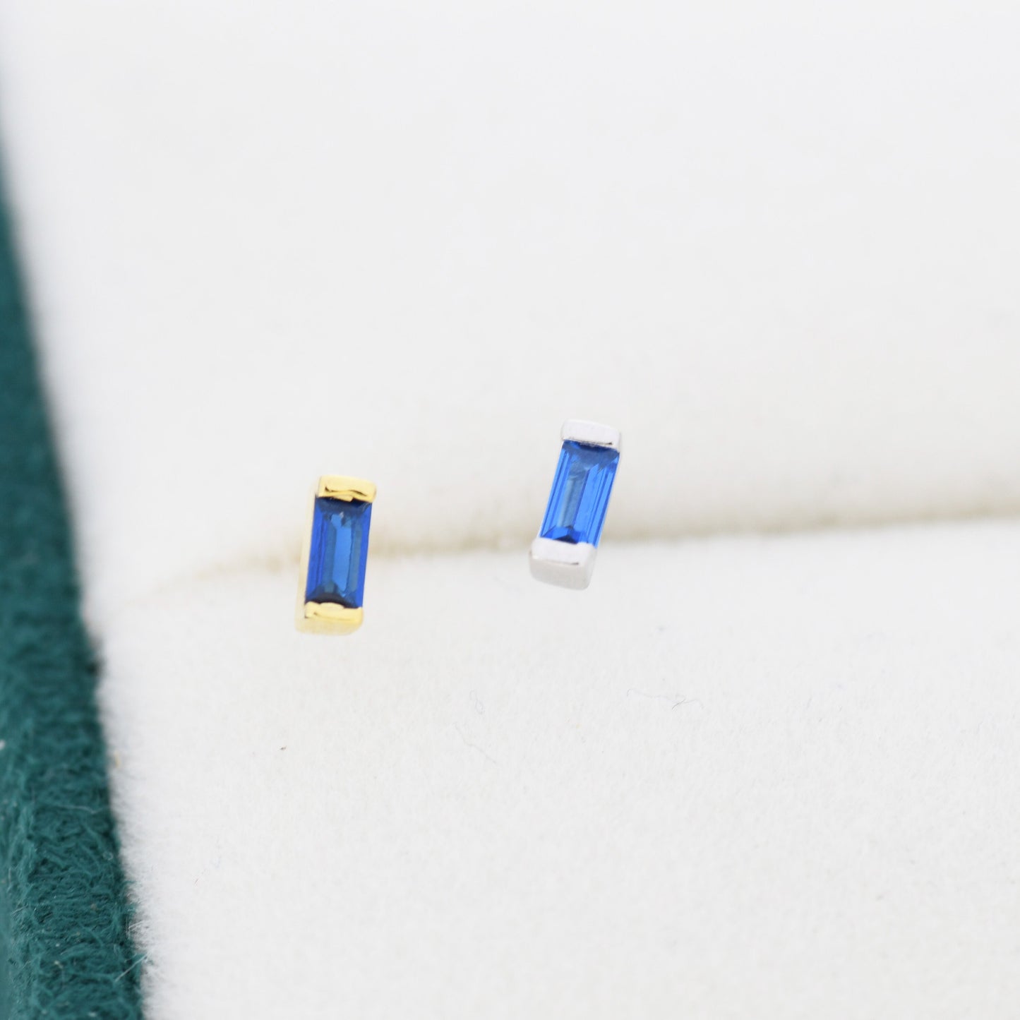 Sapphire Blue Tiny Baguette CZ Stud Earrings in Sterling Silver, Silver or Gold, Geometric Tiny CZ Earrings, Stacking Earrings