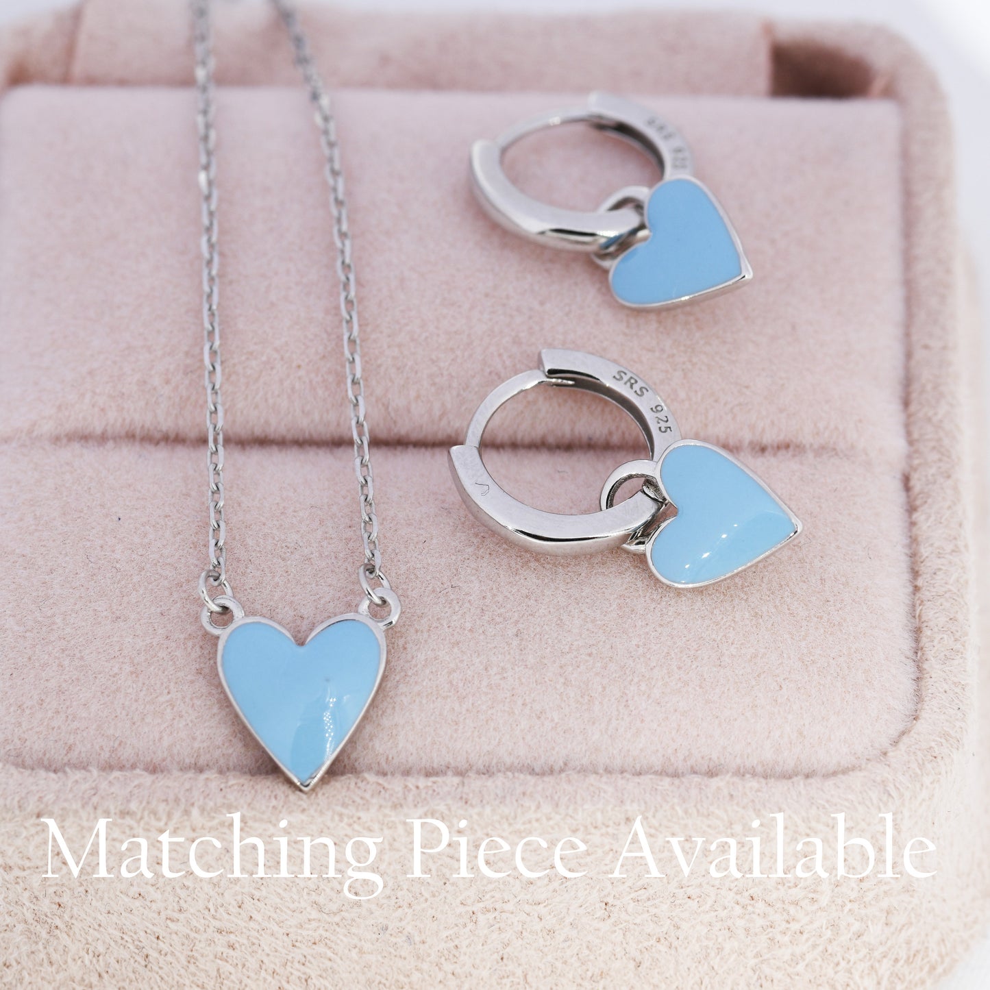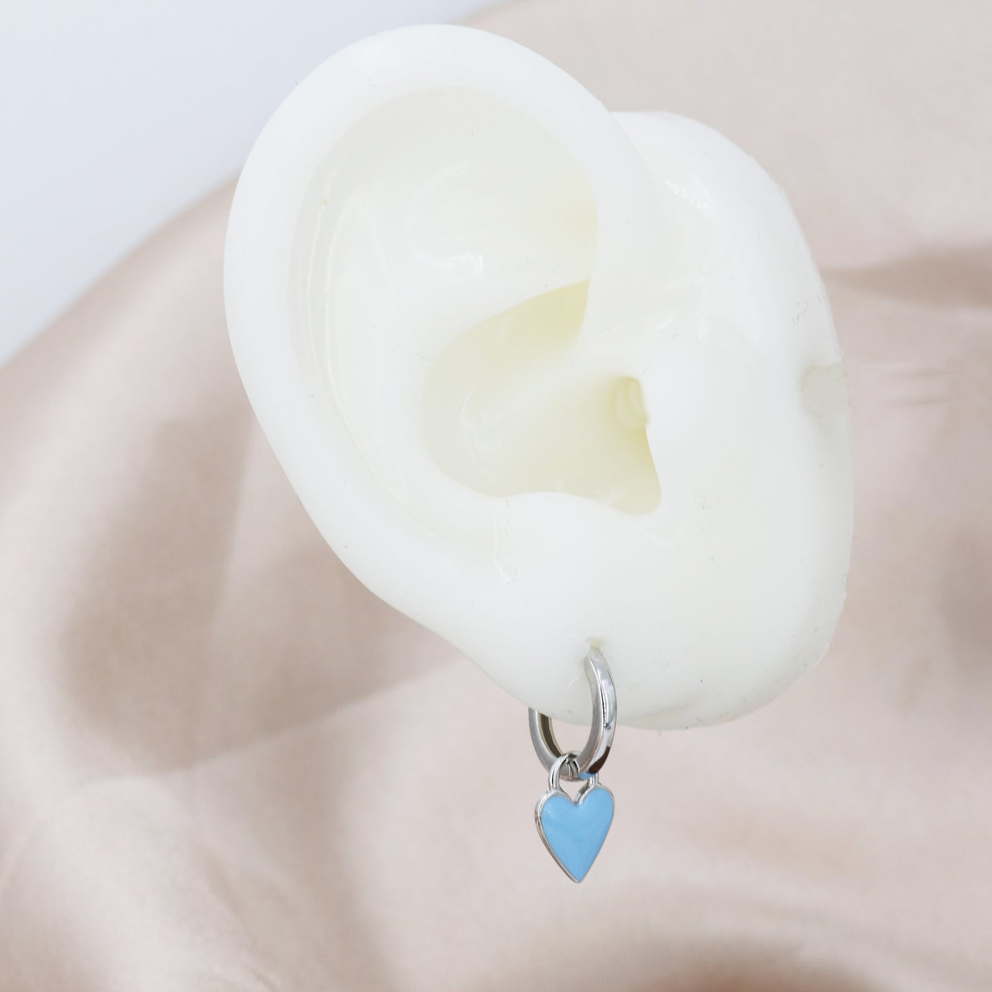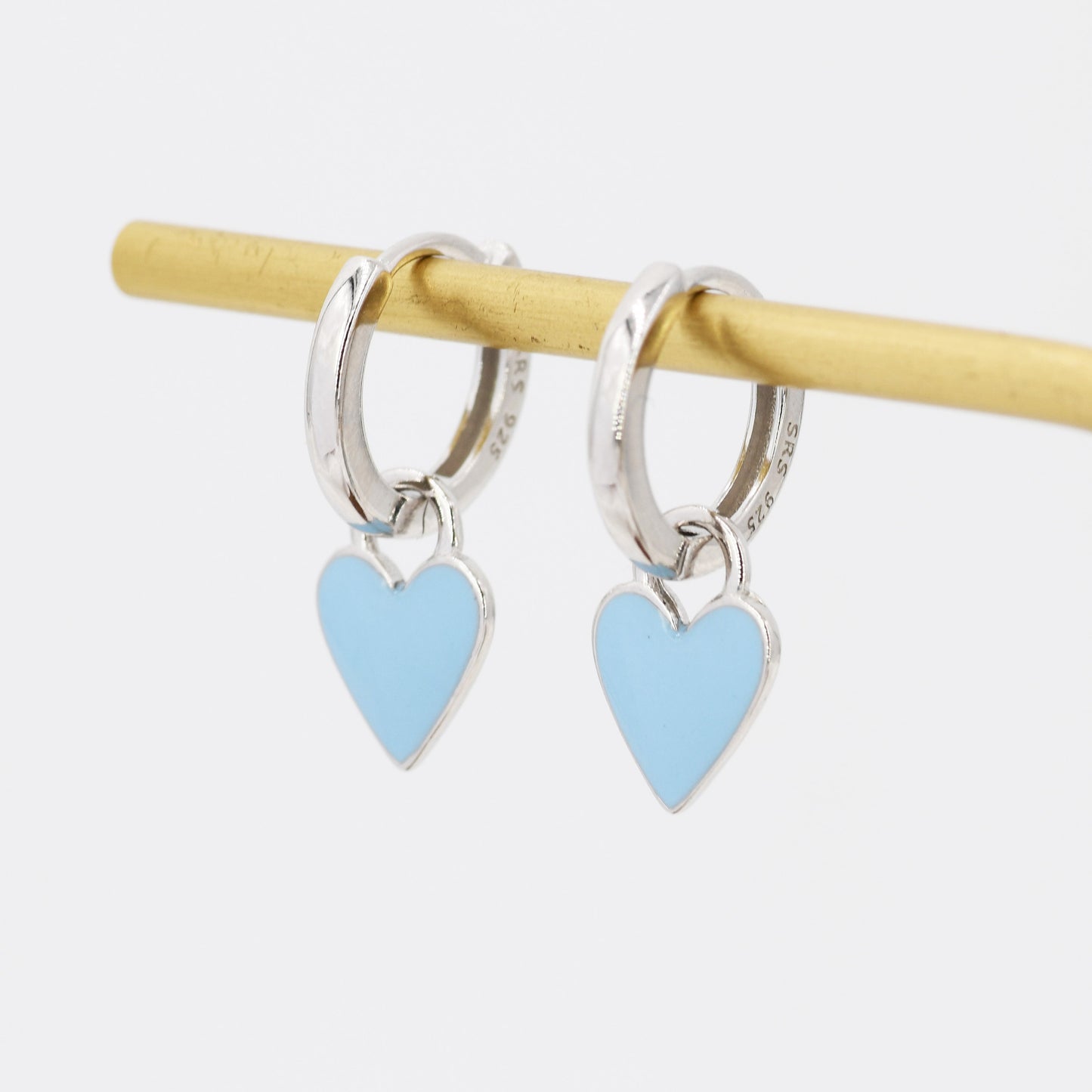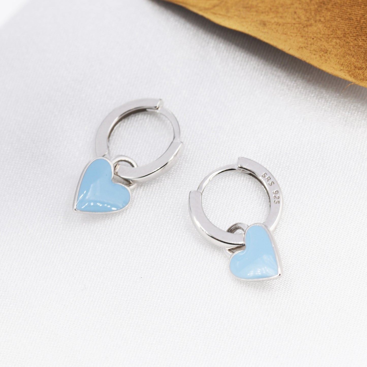 Sky Blue Enamel Heart Earrings in Sterling Silver, Detachable Heart Charm Dangle Hoop Earrings, Interchangeable