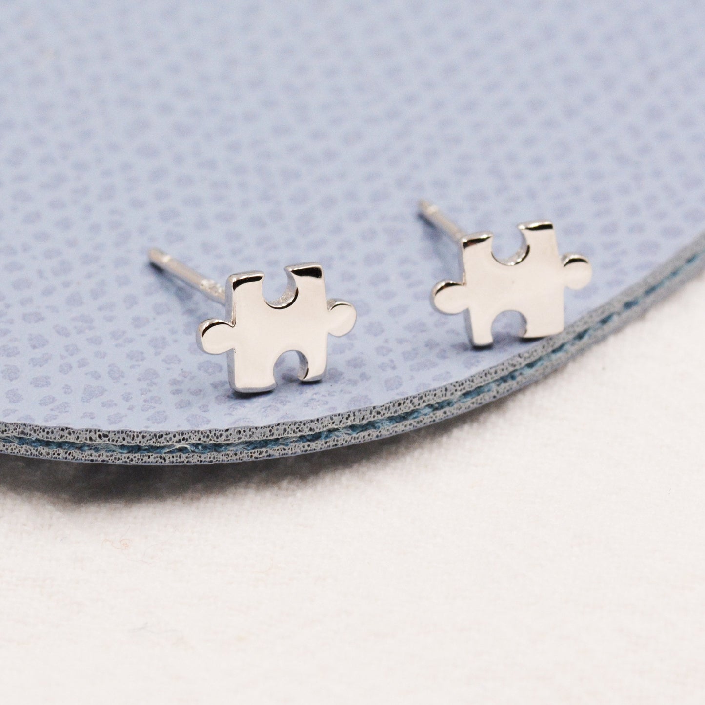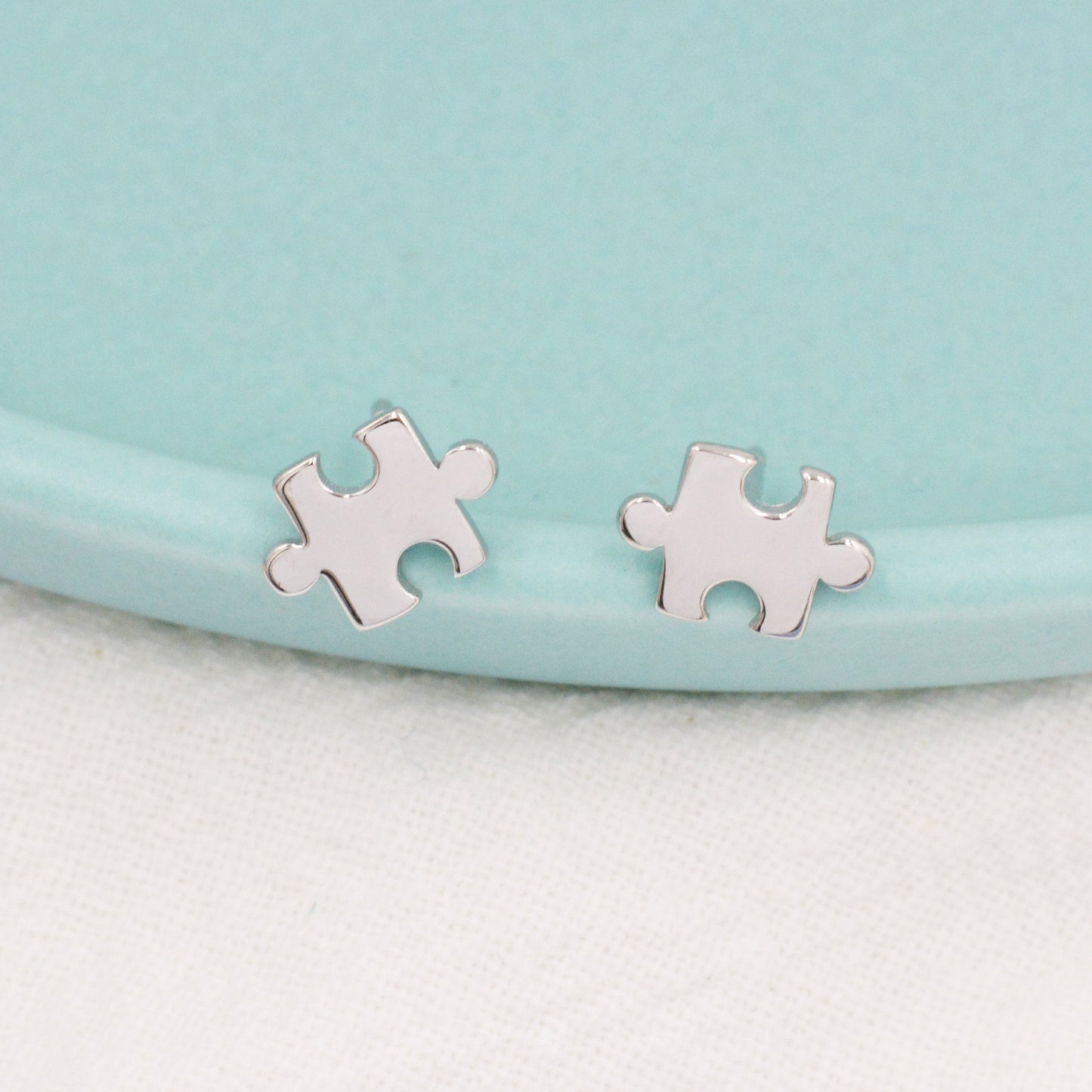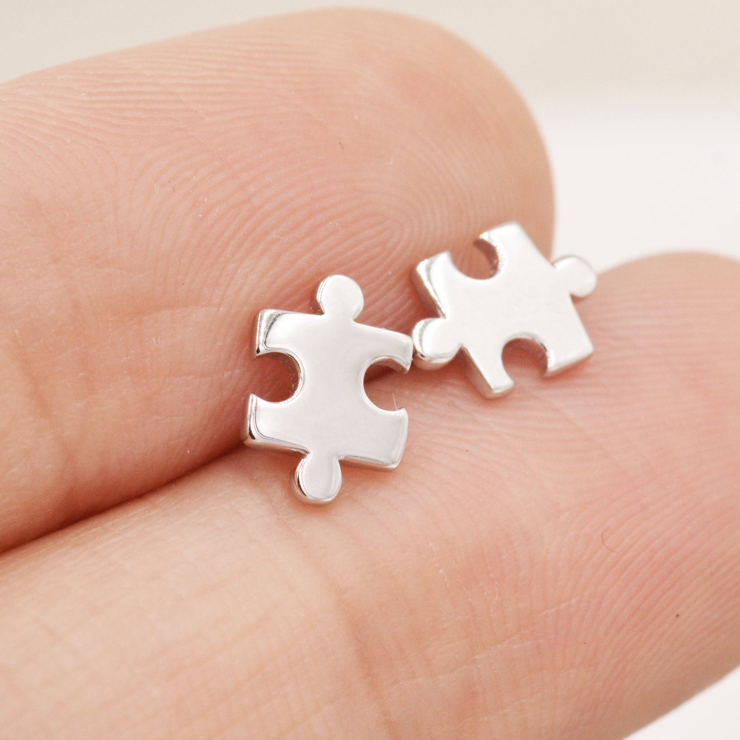 Small Jigsaw Stud Earrings in Sterling Silver, Silver Jigsaw Piece Earrings