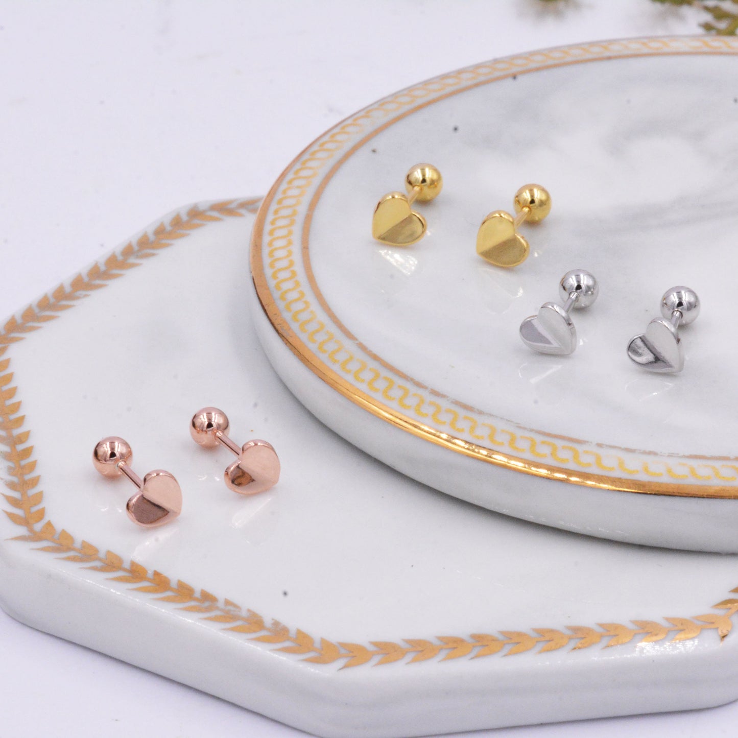 Small Pair of Folded Heart ball back Earrings in Sterling Silver, Rose Gold, Silver, Screw Back Earrings - helix, cartilage, conch, tragus