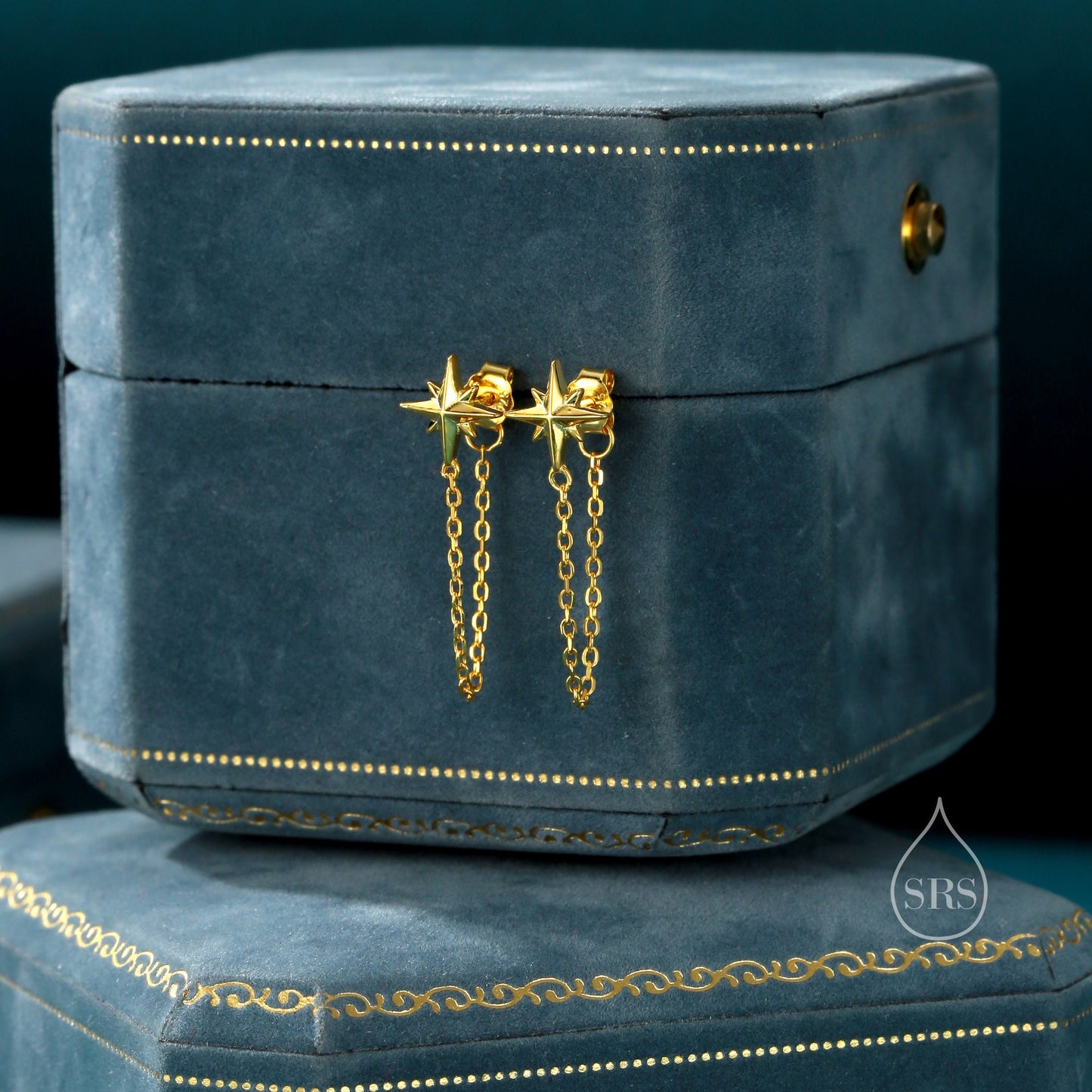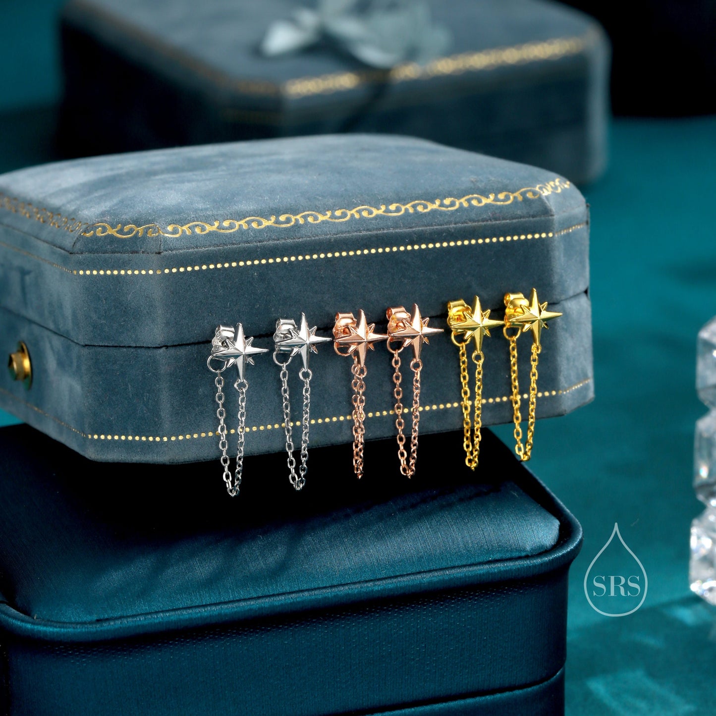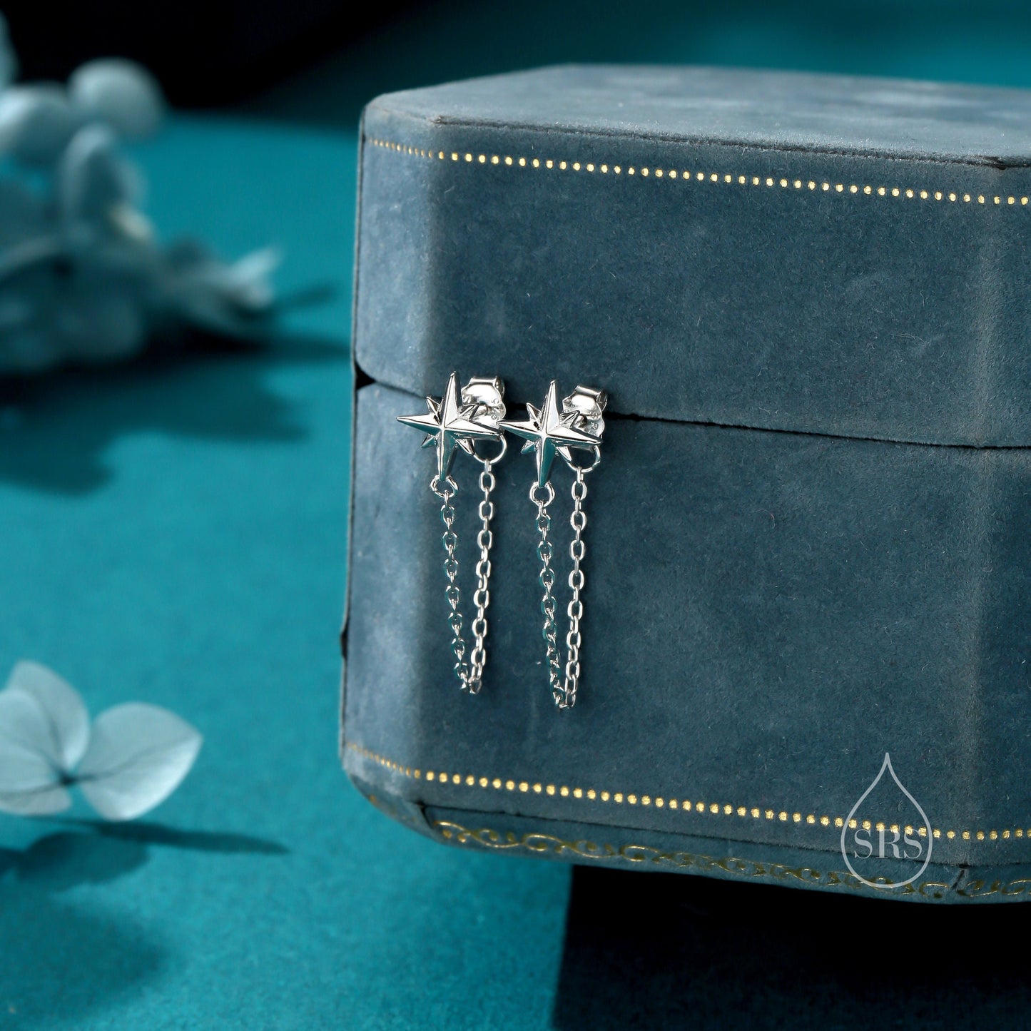 Starburst Dangle Chain Stud Earrings in Sterling Silver, Silver, Gold or Rose Gold, North Star Earrings, Star Ear Jacket, Star Earrings