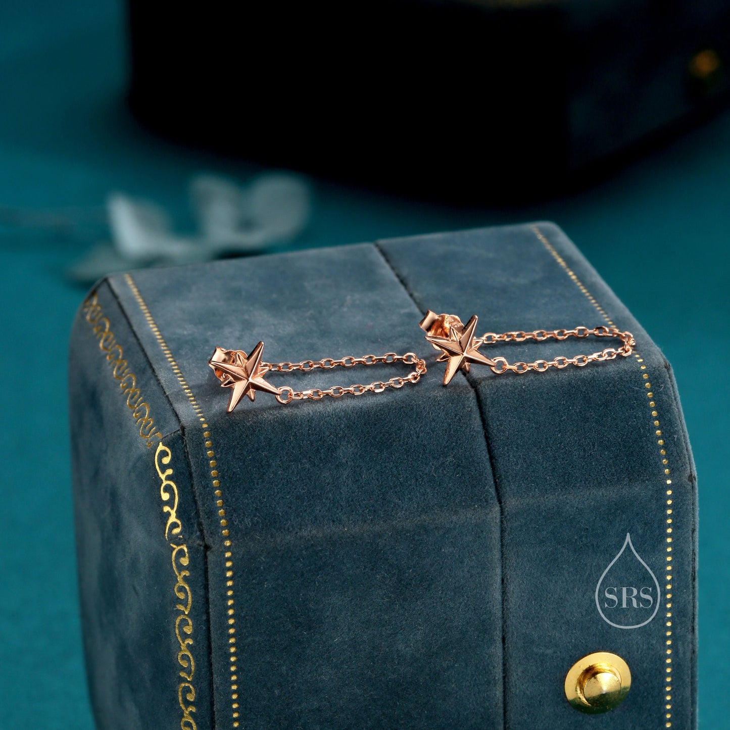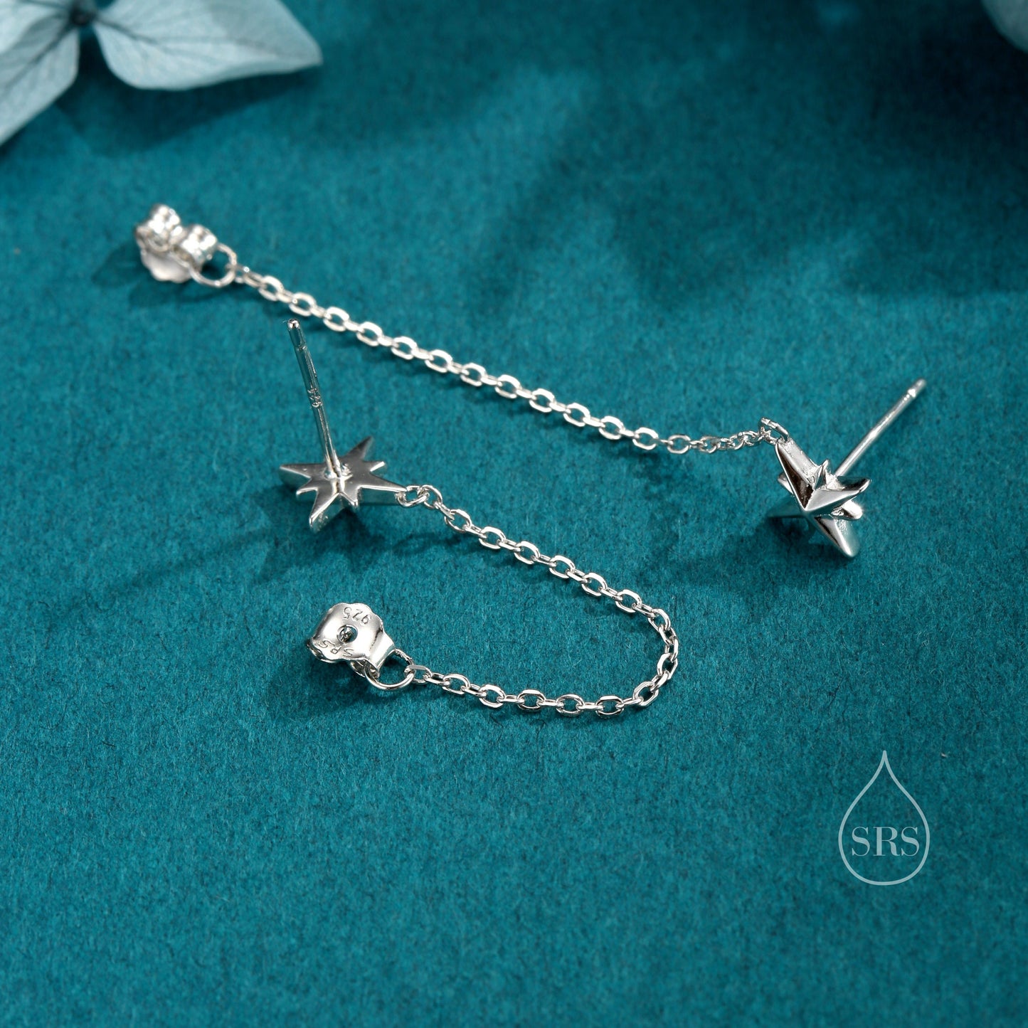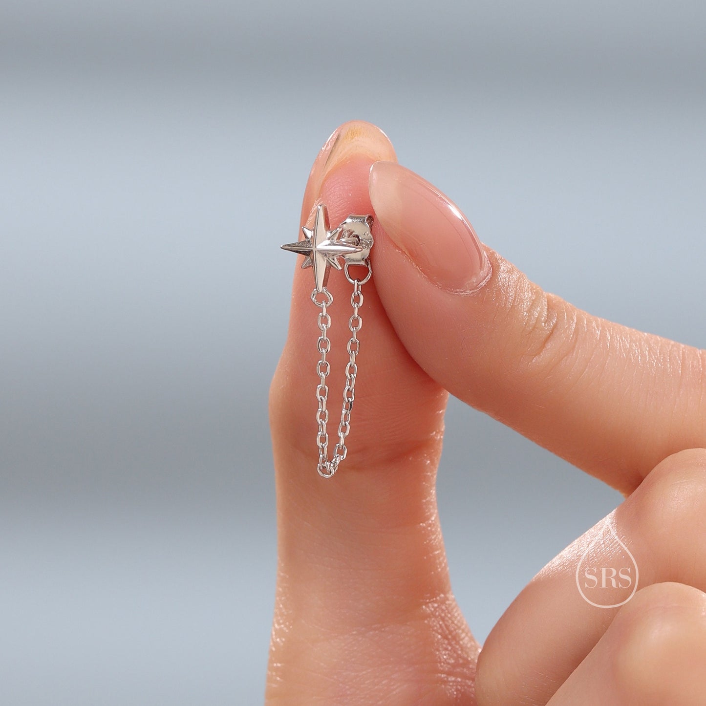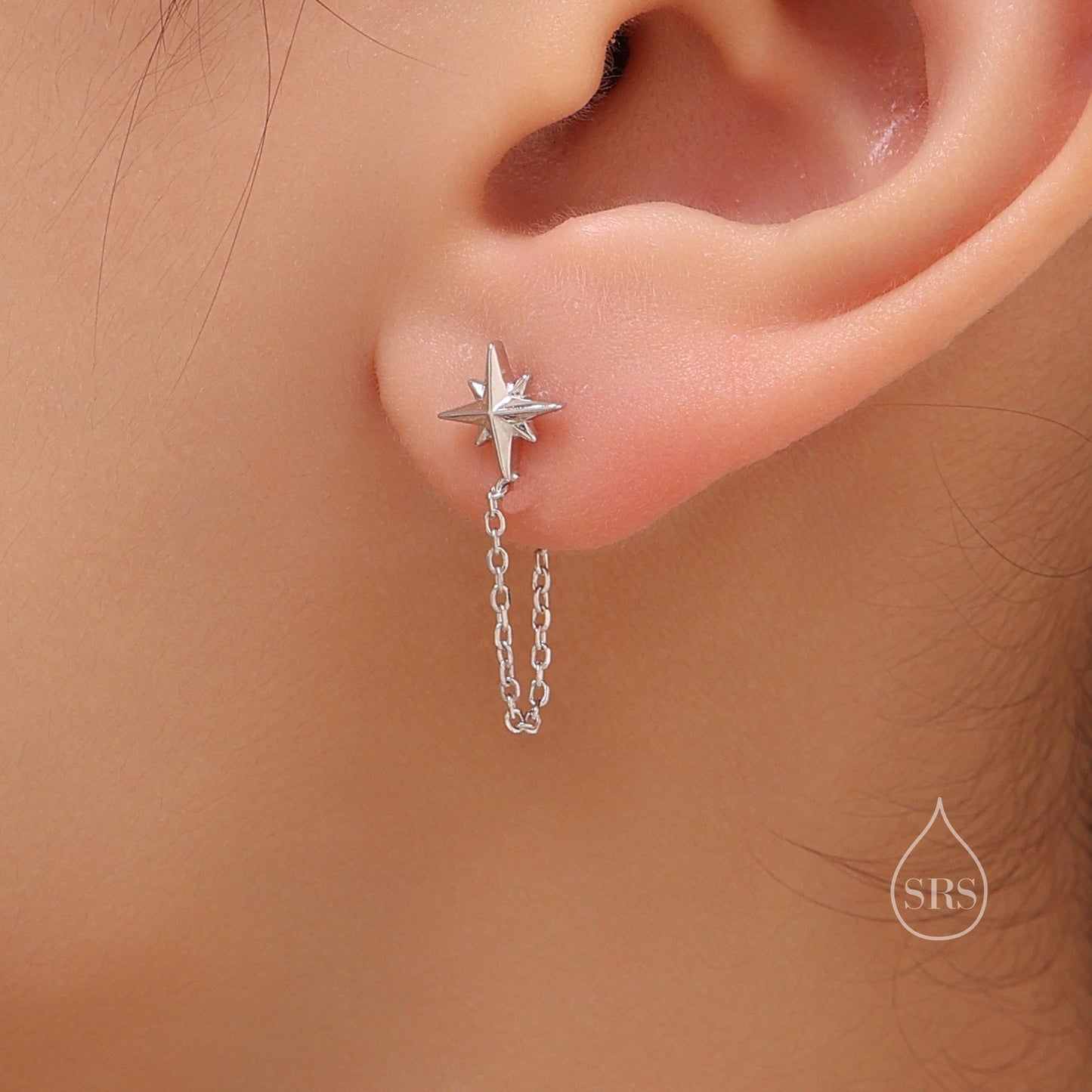 Starburst Dangle Chain Stud Earrings in Sterling Silver, Silver, Gold or Rose Gold, North Star Earrings, Star Ear Jacket, Star Earrings