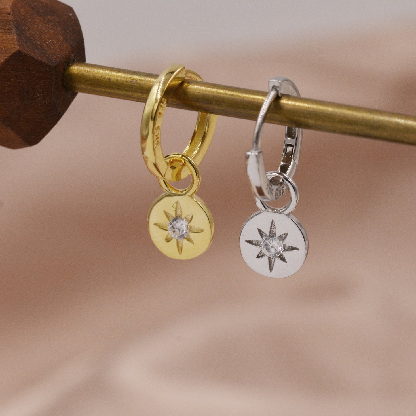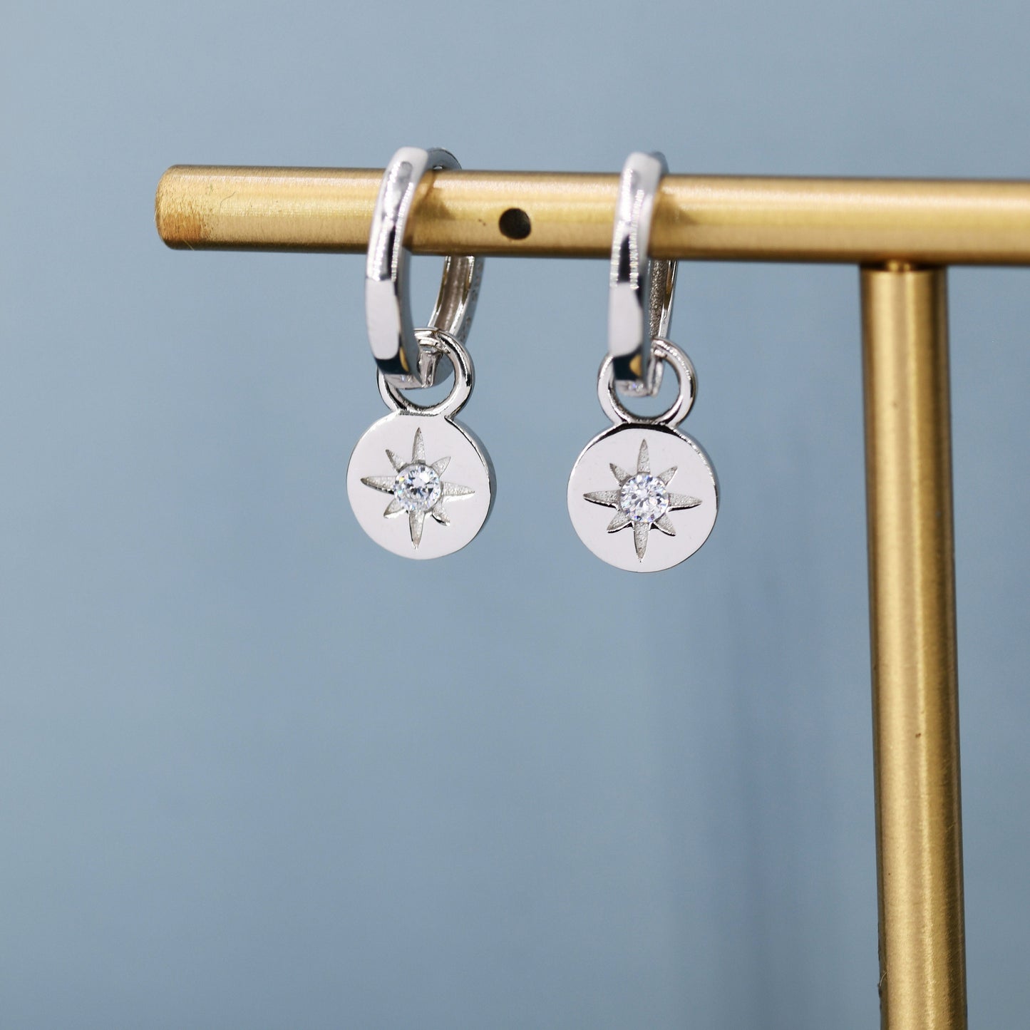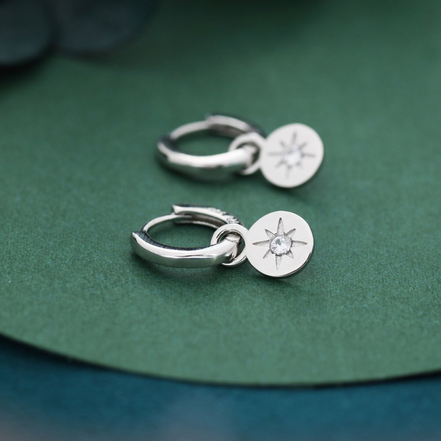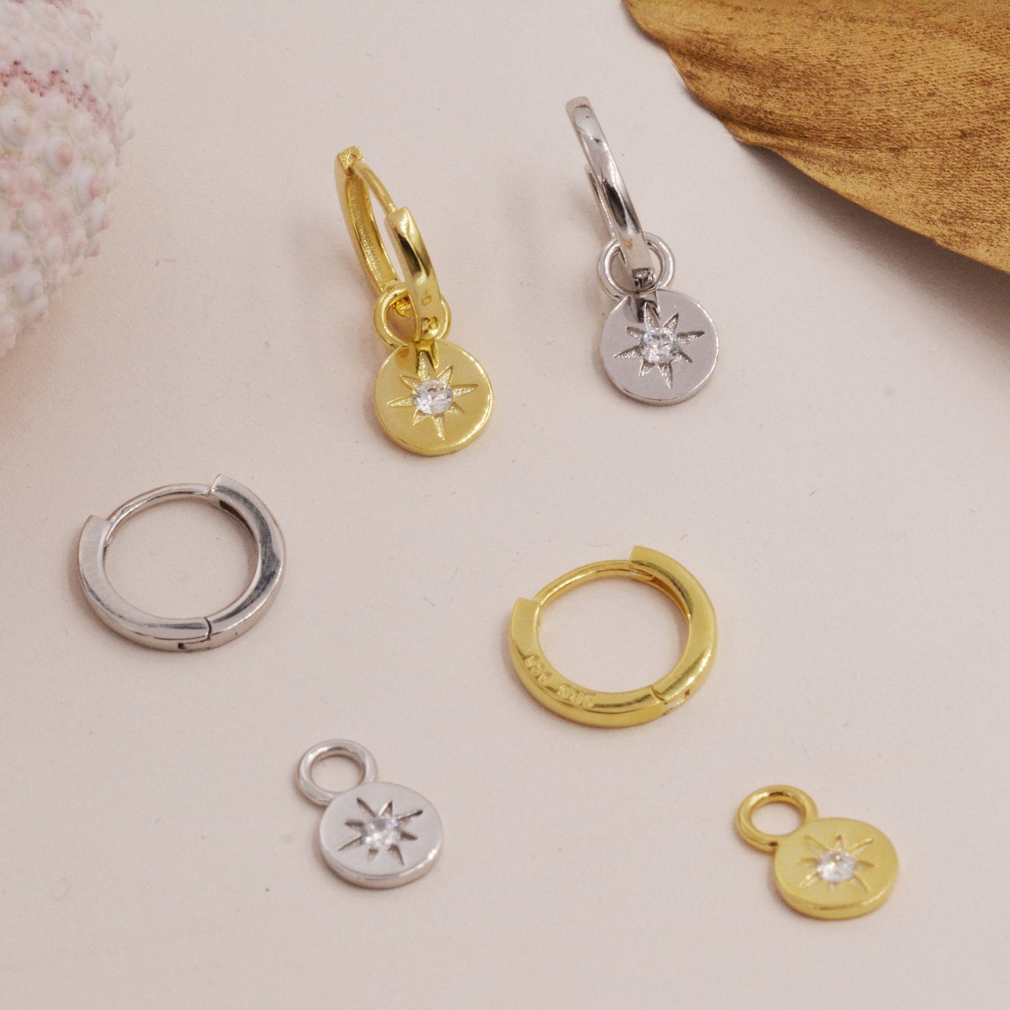 Starburst Disk Charm Huggie Hoop Earrings in Sterling Silver with Detachable Coin Charms, North Star Celestial Geometric Design
