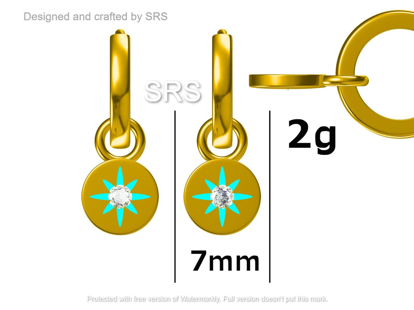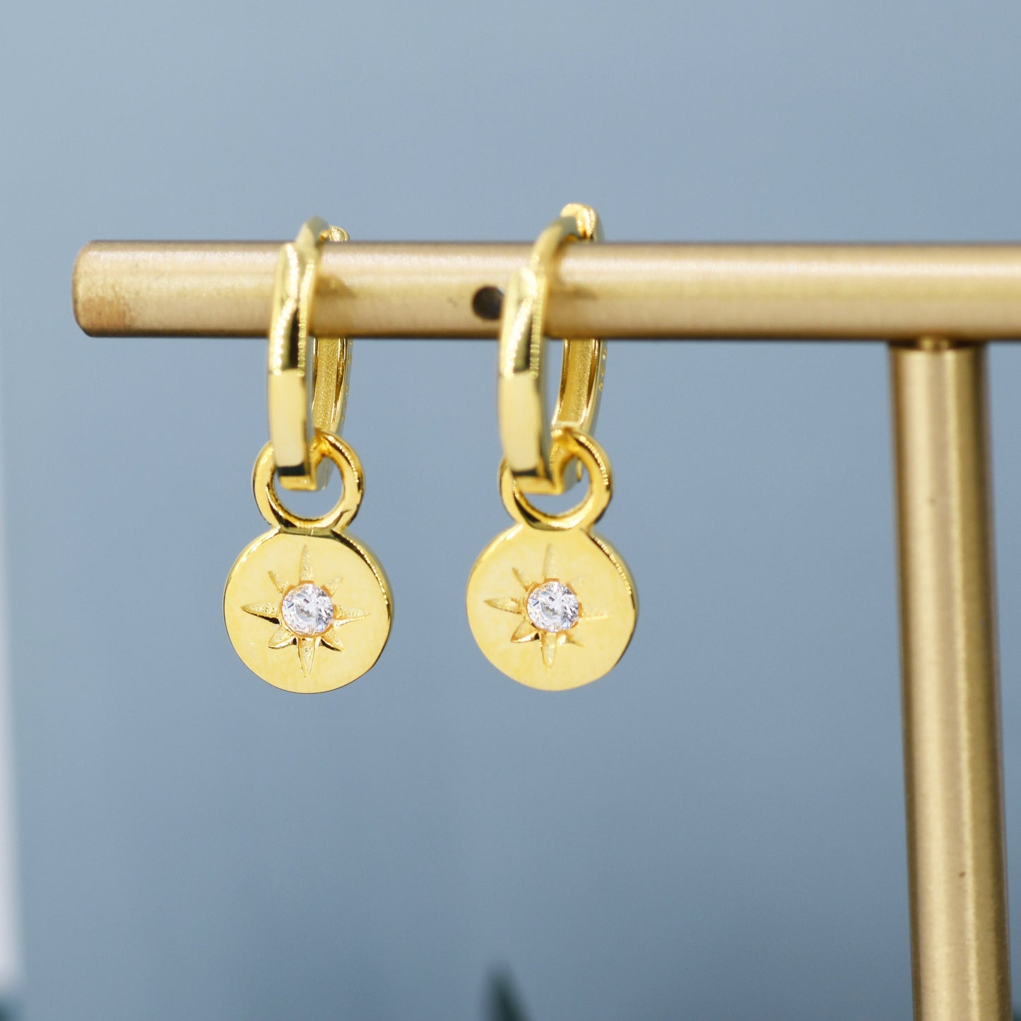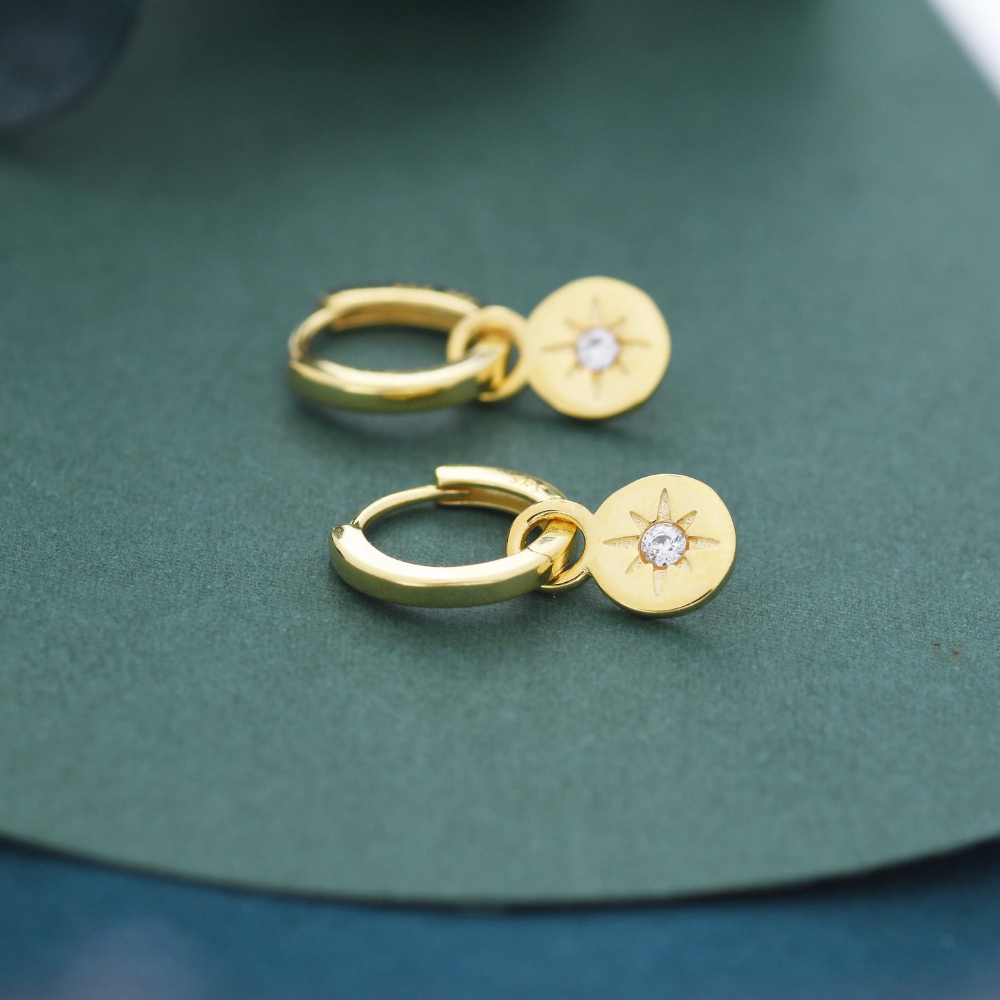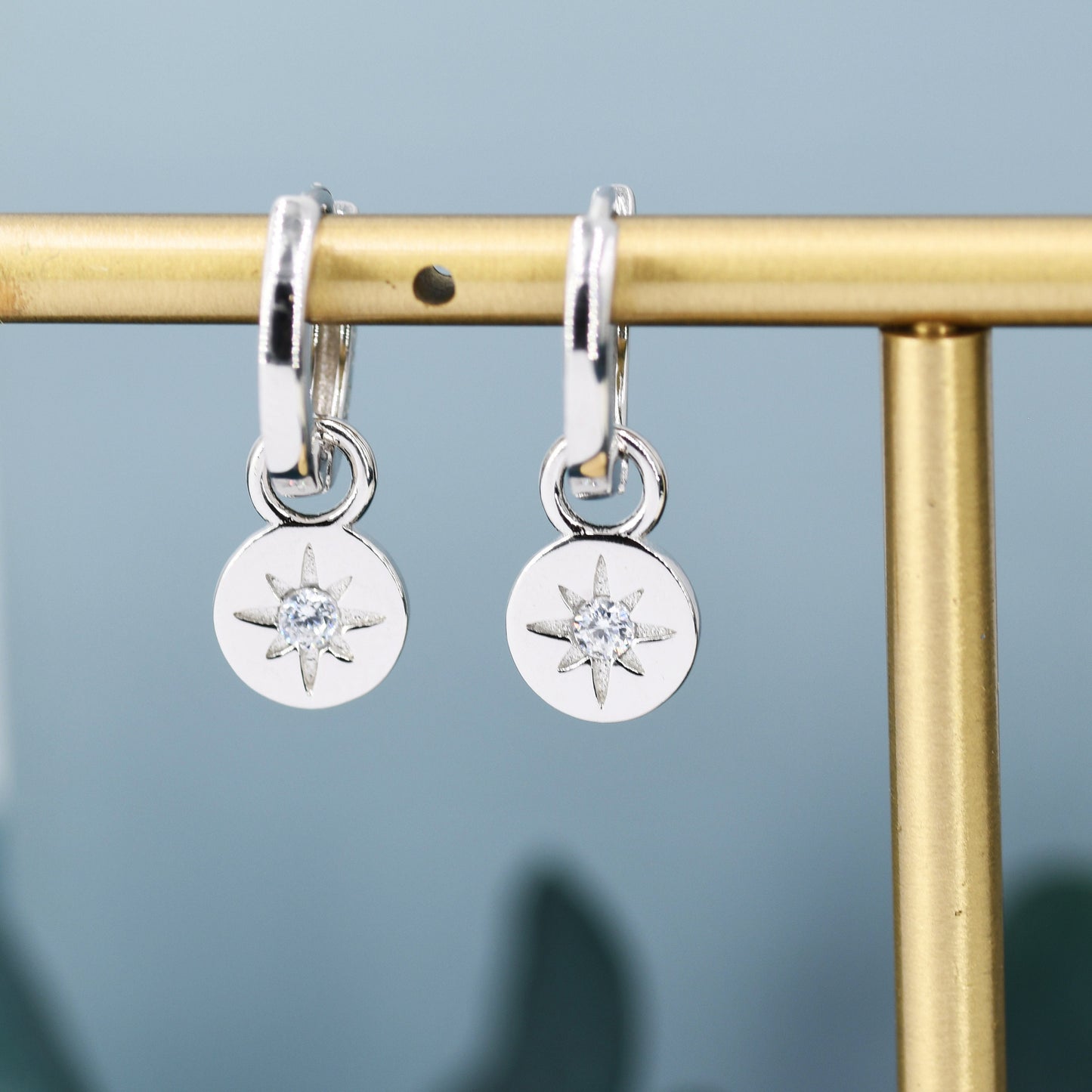 Starburst Disk Charm Huggie Hoop Earrings in Sterling Silver with Detachable Coin Charms, North Star Celestial Geometric Design