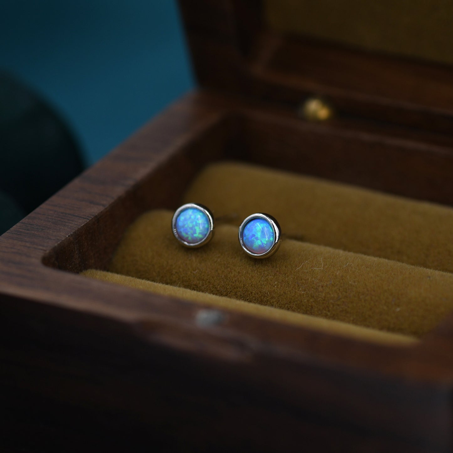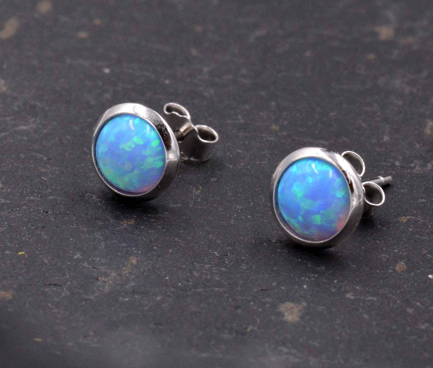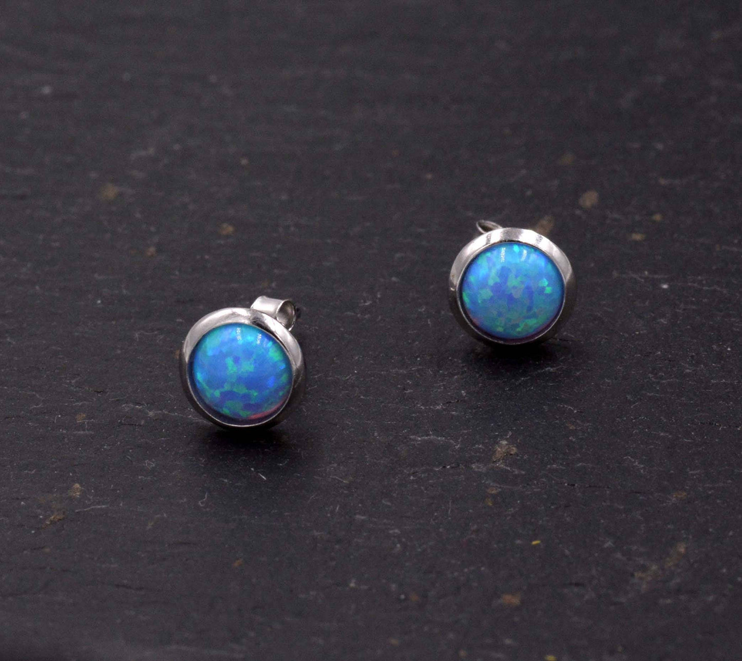 Sterling Silver Blue Opal White Opal Stone Crystal Stud Earrings. Round Minimalist Dot Geometric Design. bridesmaid jewellery.