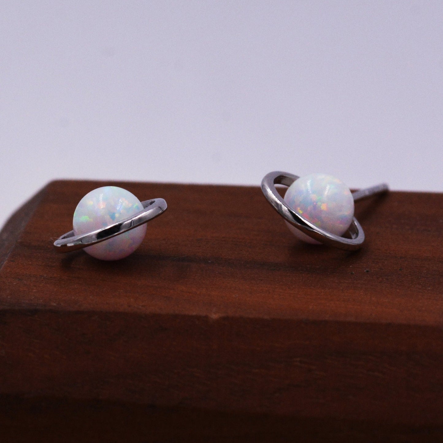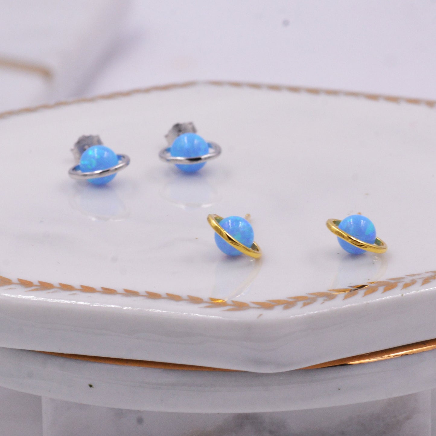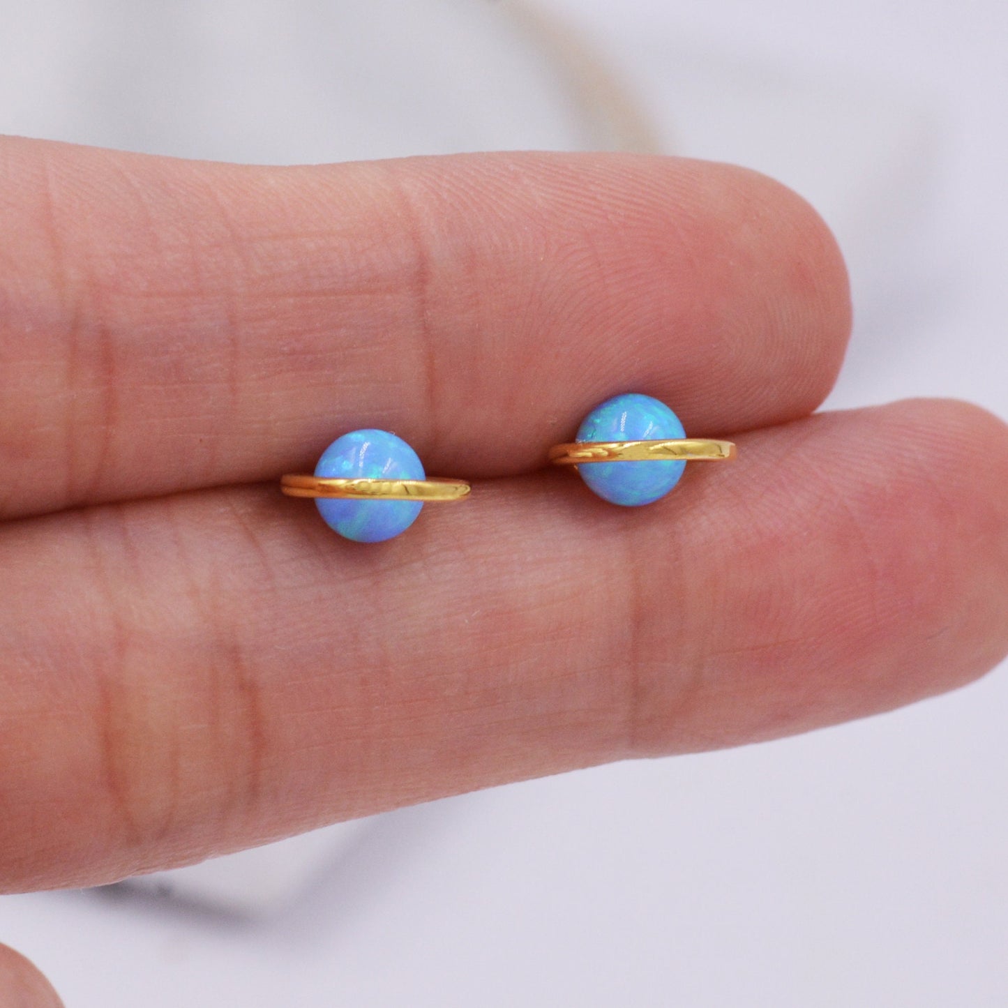 Sterling Silver Blue Planet Opal Stud Earrings, Saturn Earrings, Halo Opal Bead Stud, Blue and White , Gold or Silver Minimalist Geometric