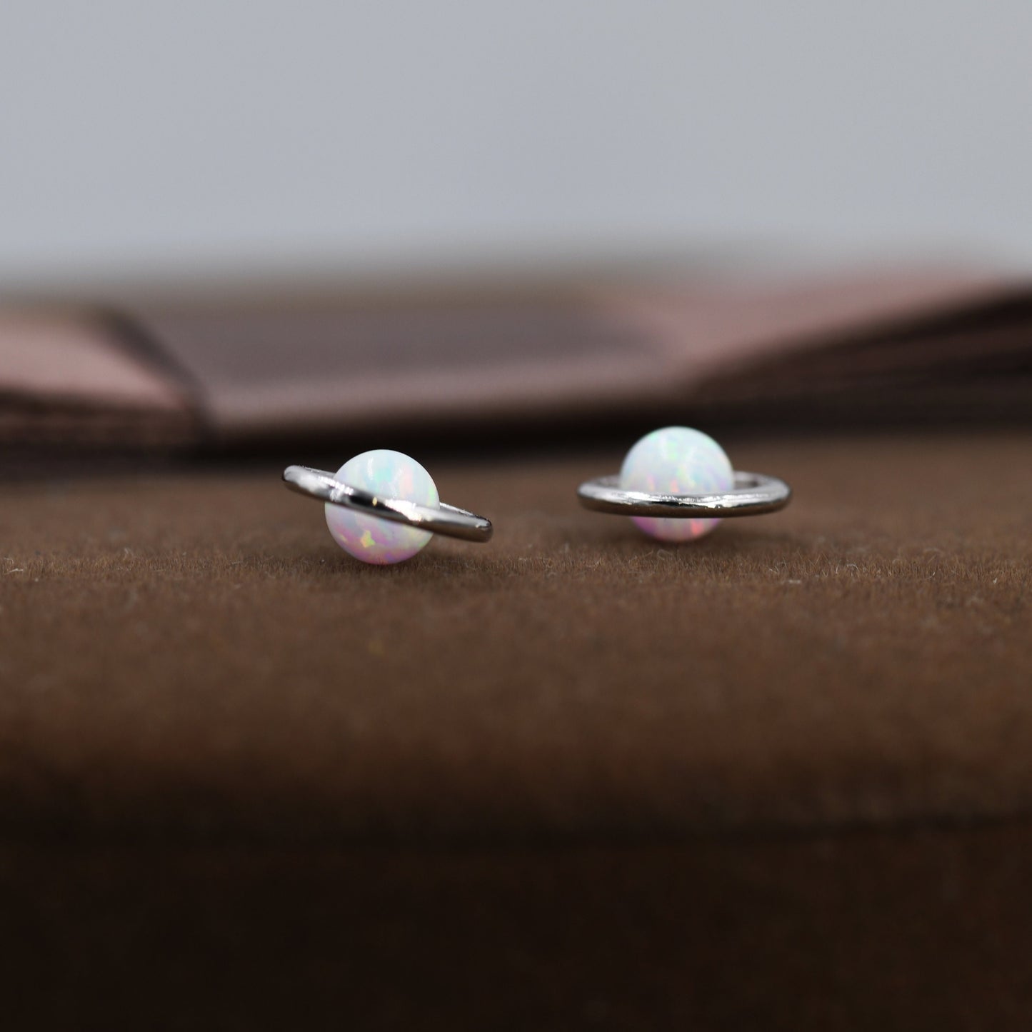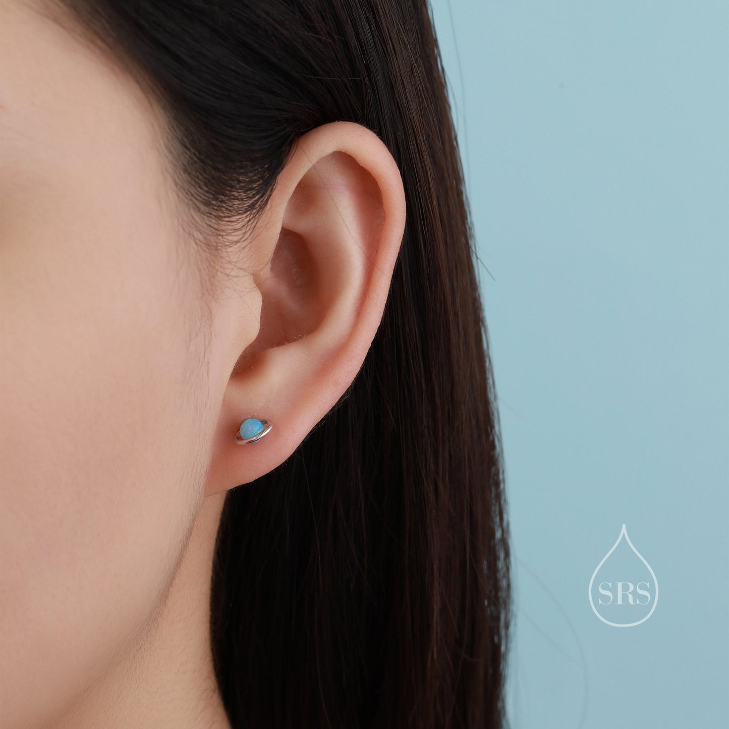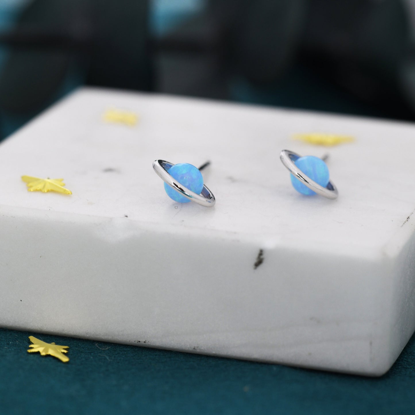 Sterling Silver Blue Planet Opal Stud Earrings, Saturn Earrings, Halo Opal Bead Stud, Blue and White , Gold or Silver Minimalist Geometric