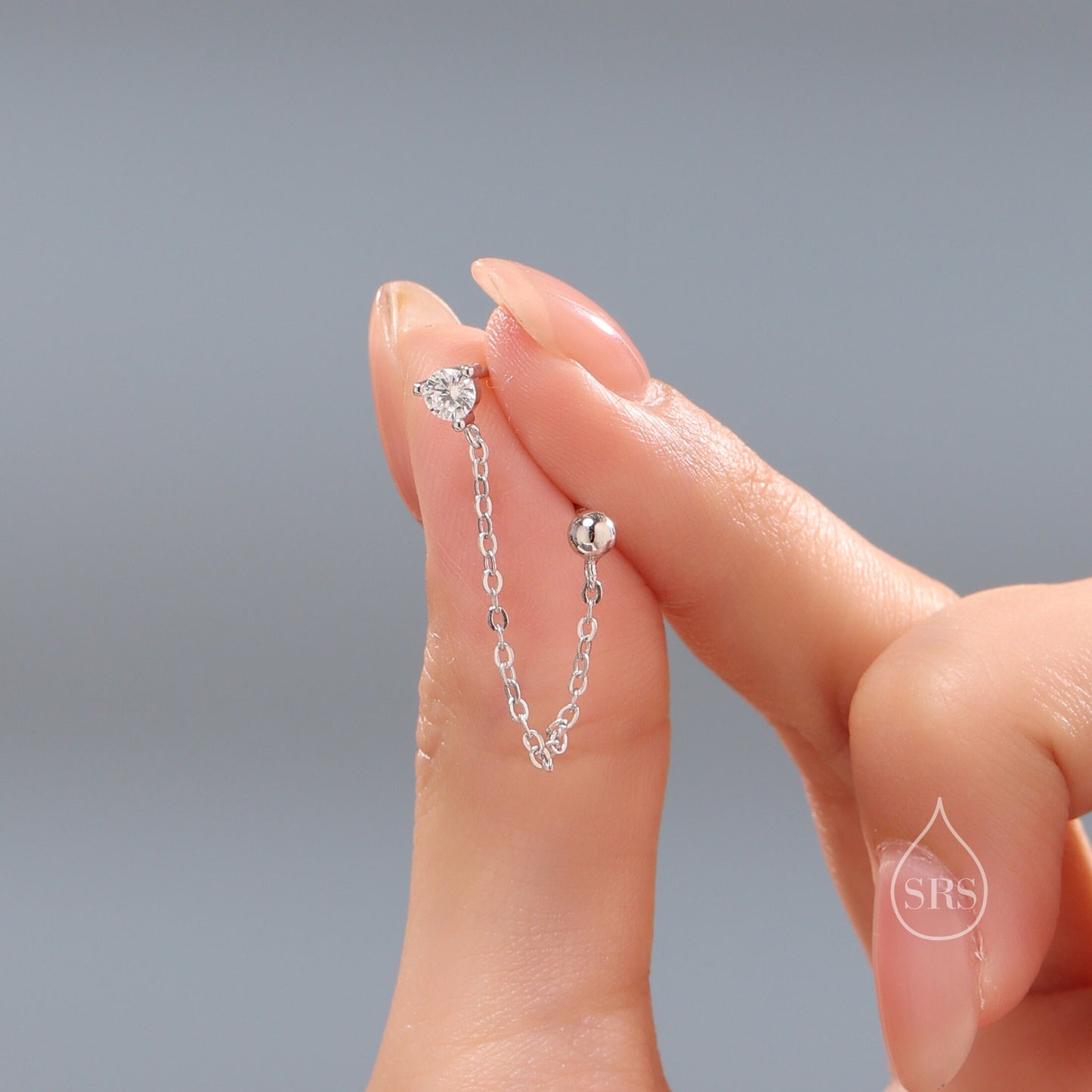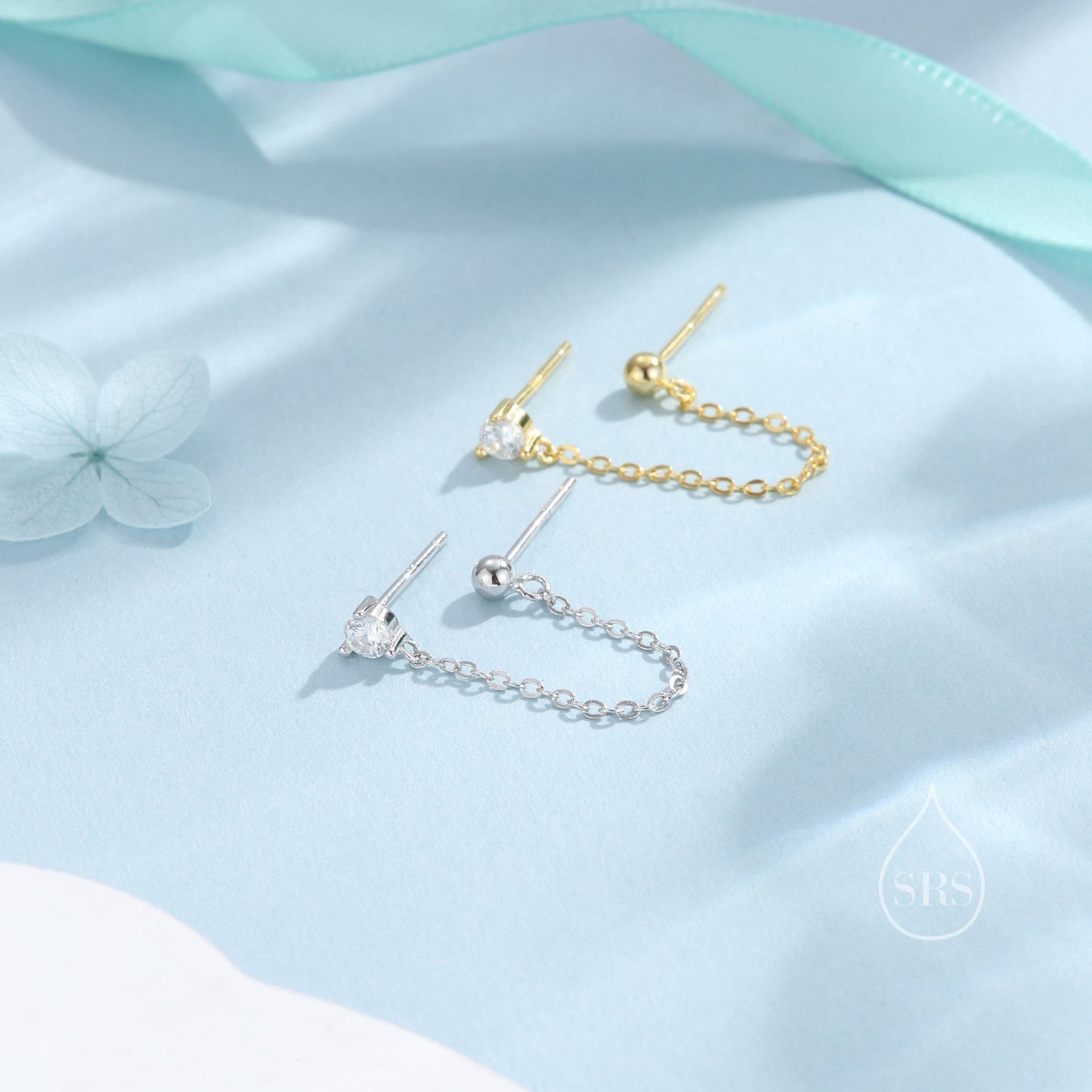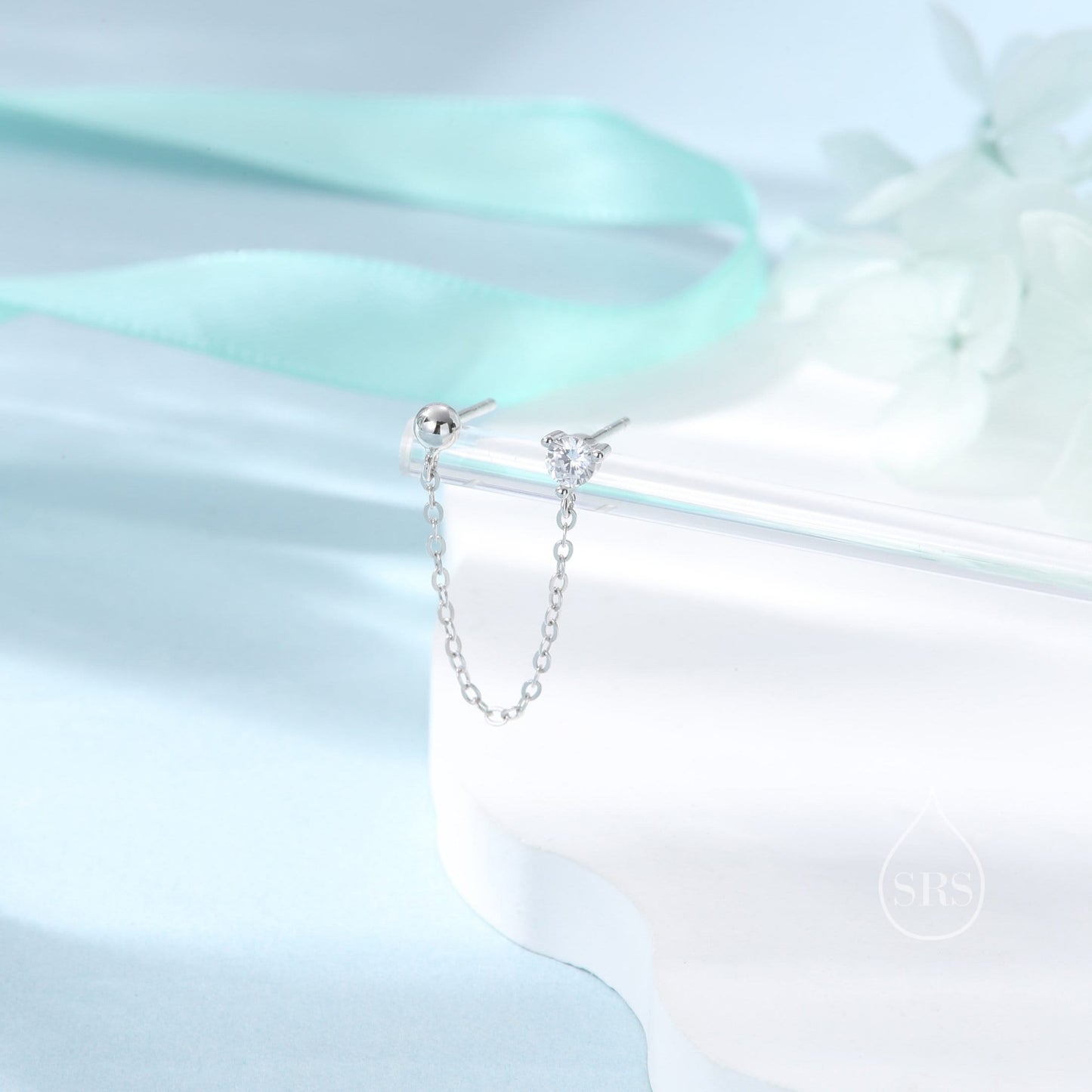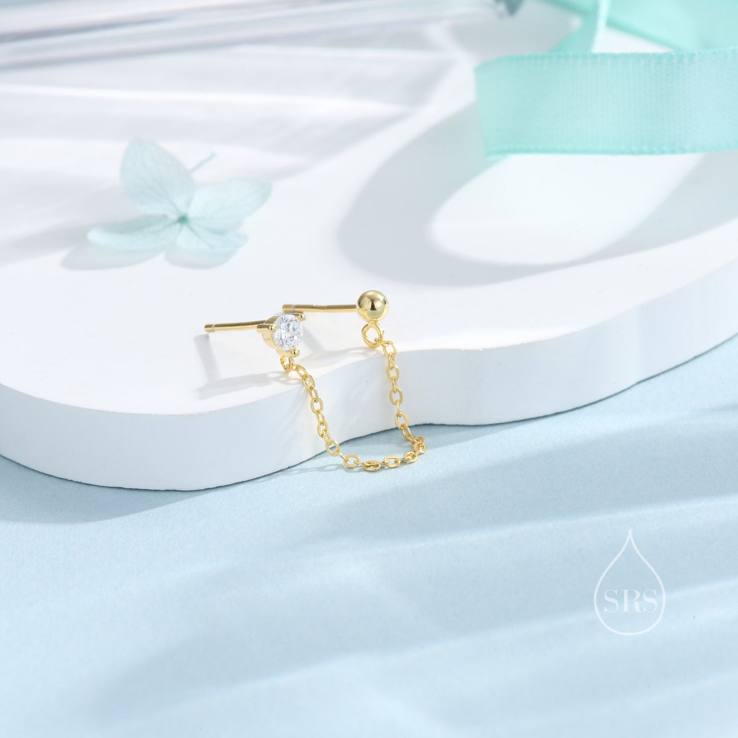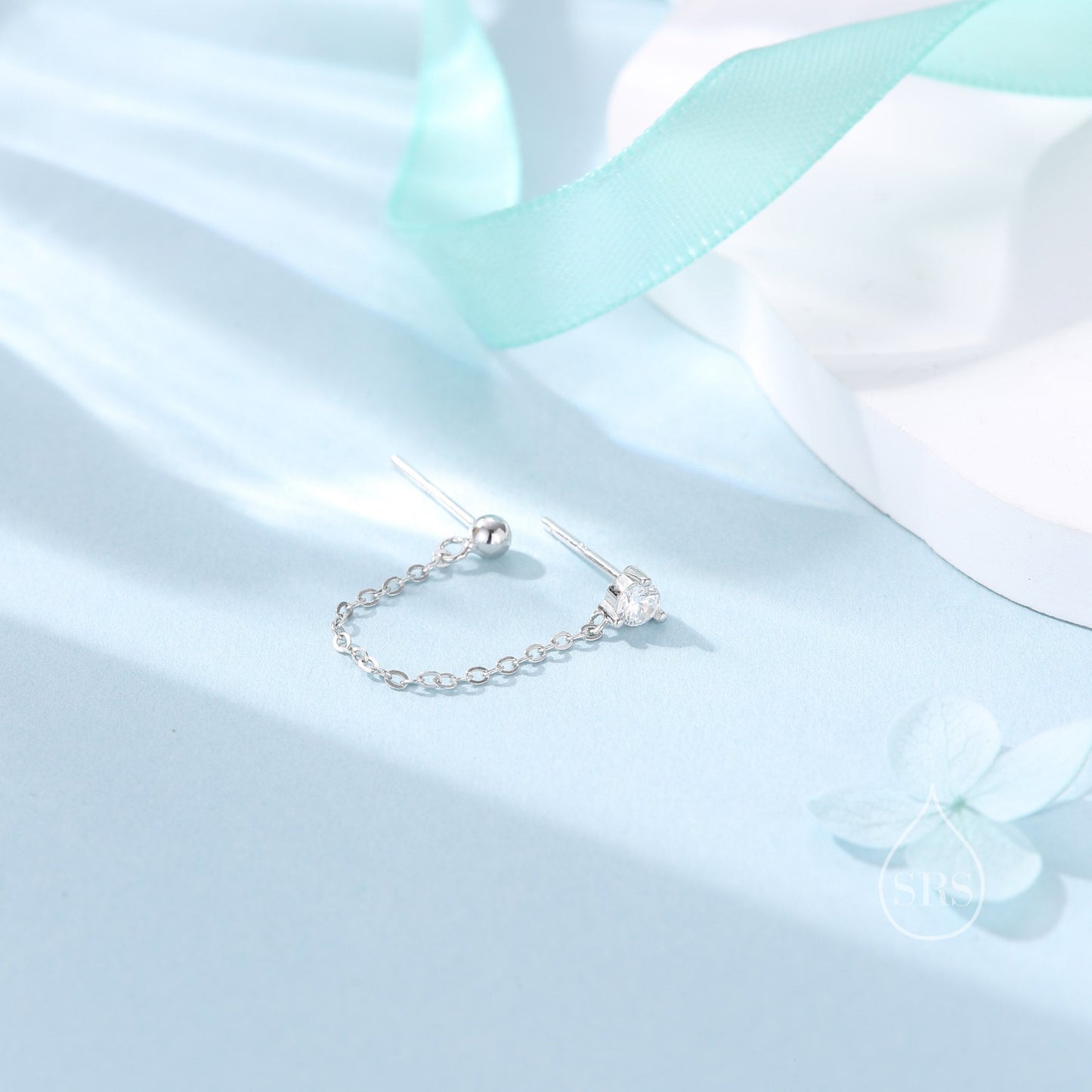 Sterling Silver Chained Earrings for Double Piercings, Silver or Gold, Ball and CZ Chained Earrings, Asymmetric Stacking Earrings