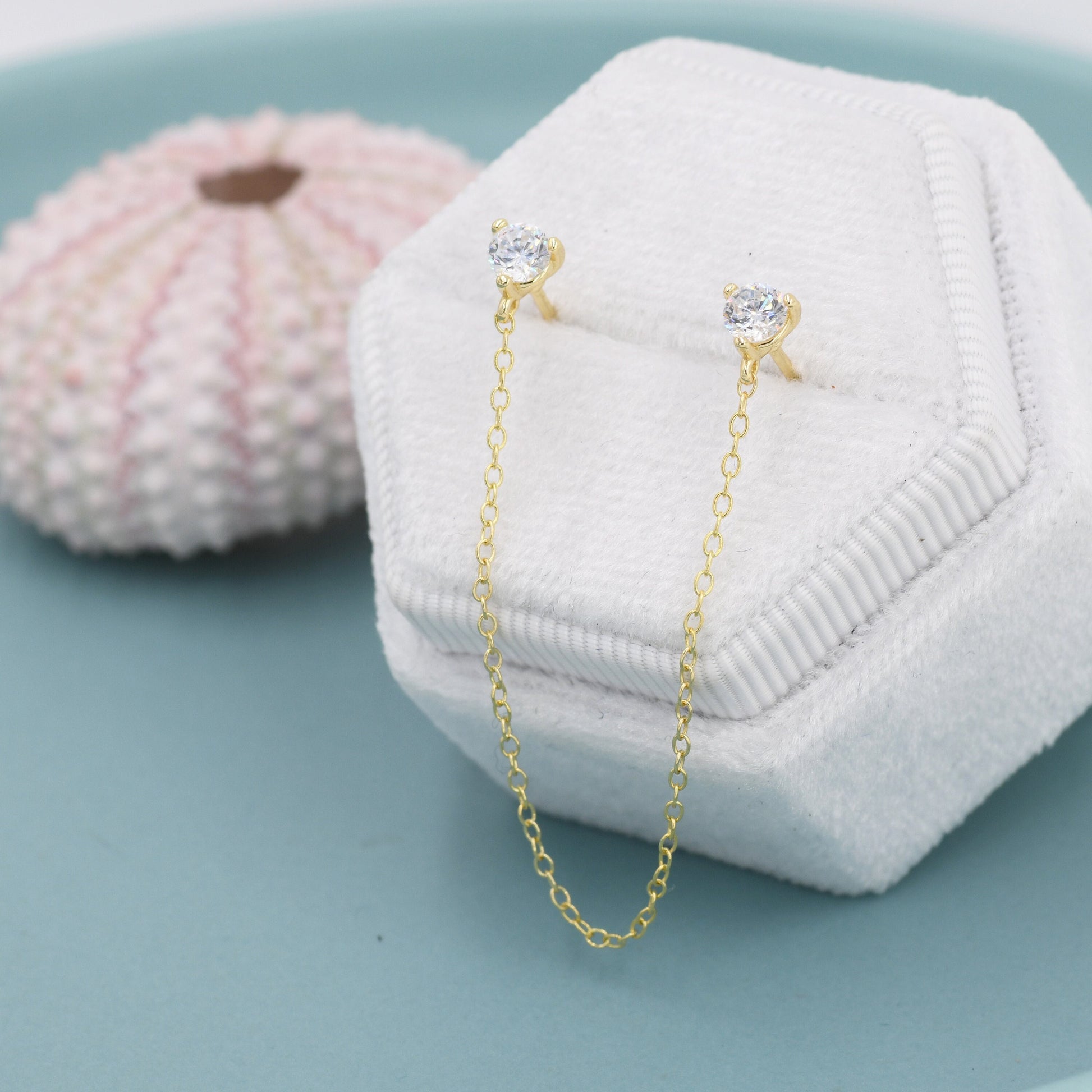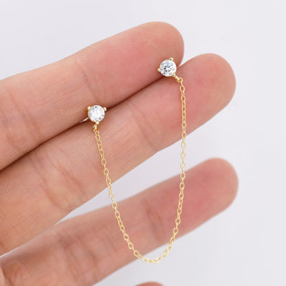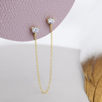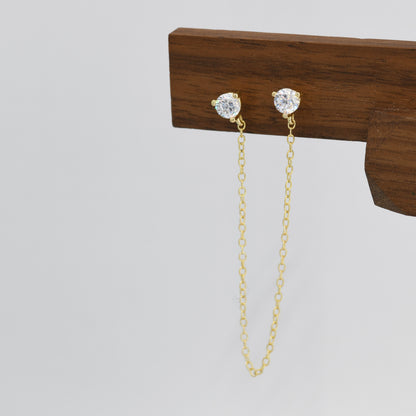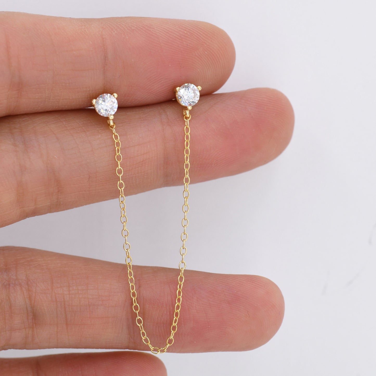 Sterling Silver Chained Earrings for Multiple Piercings, Silver or Gold, Double CZ Chained Earrings, Stacking Earrings
