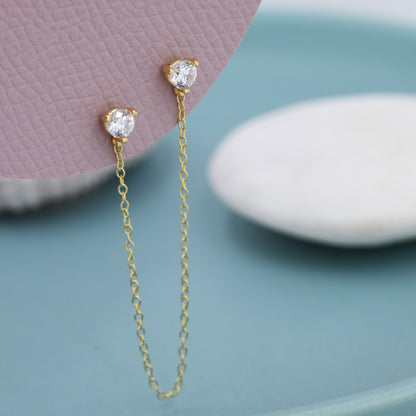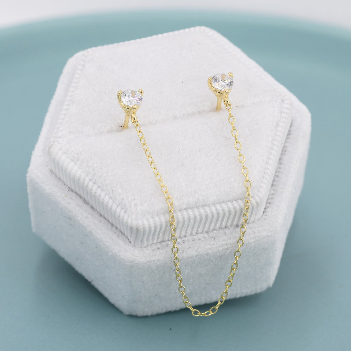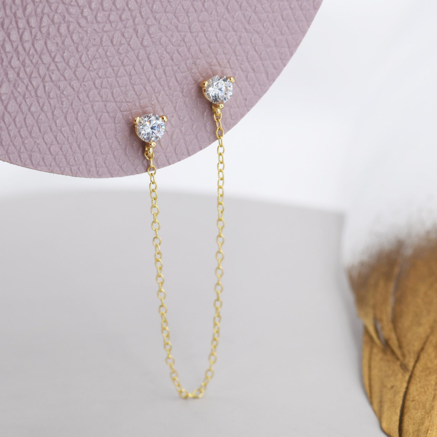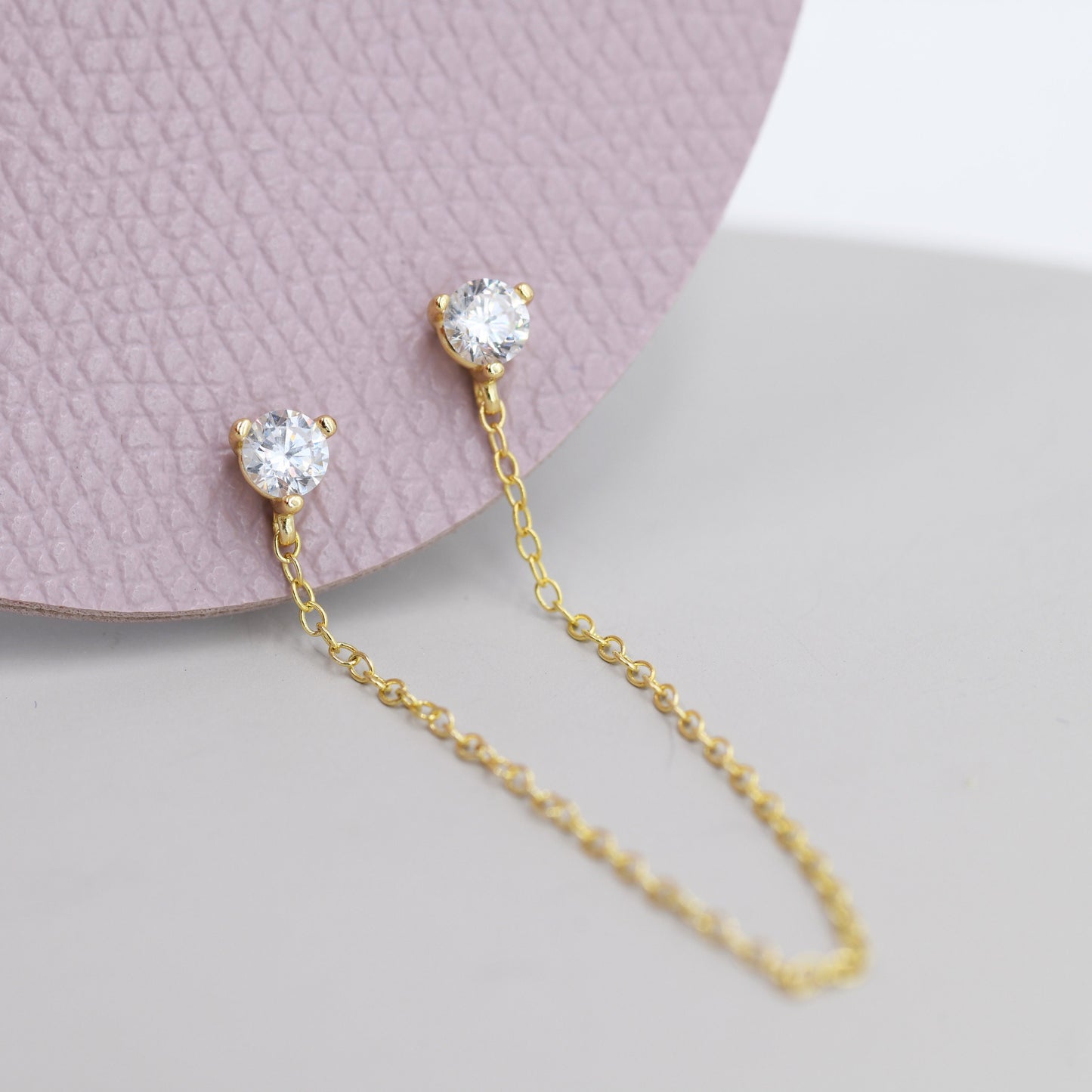 Sterling Silver Chained Earrings for Multiple Piercings, Silver or Gold, Double CZ Chained Earrings, Stacking Earrings