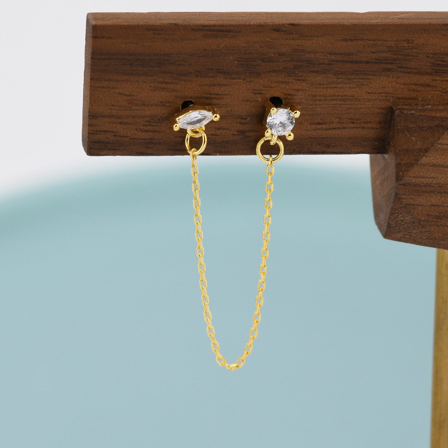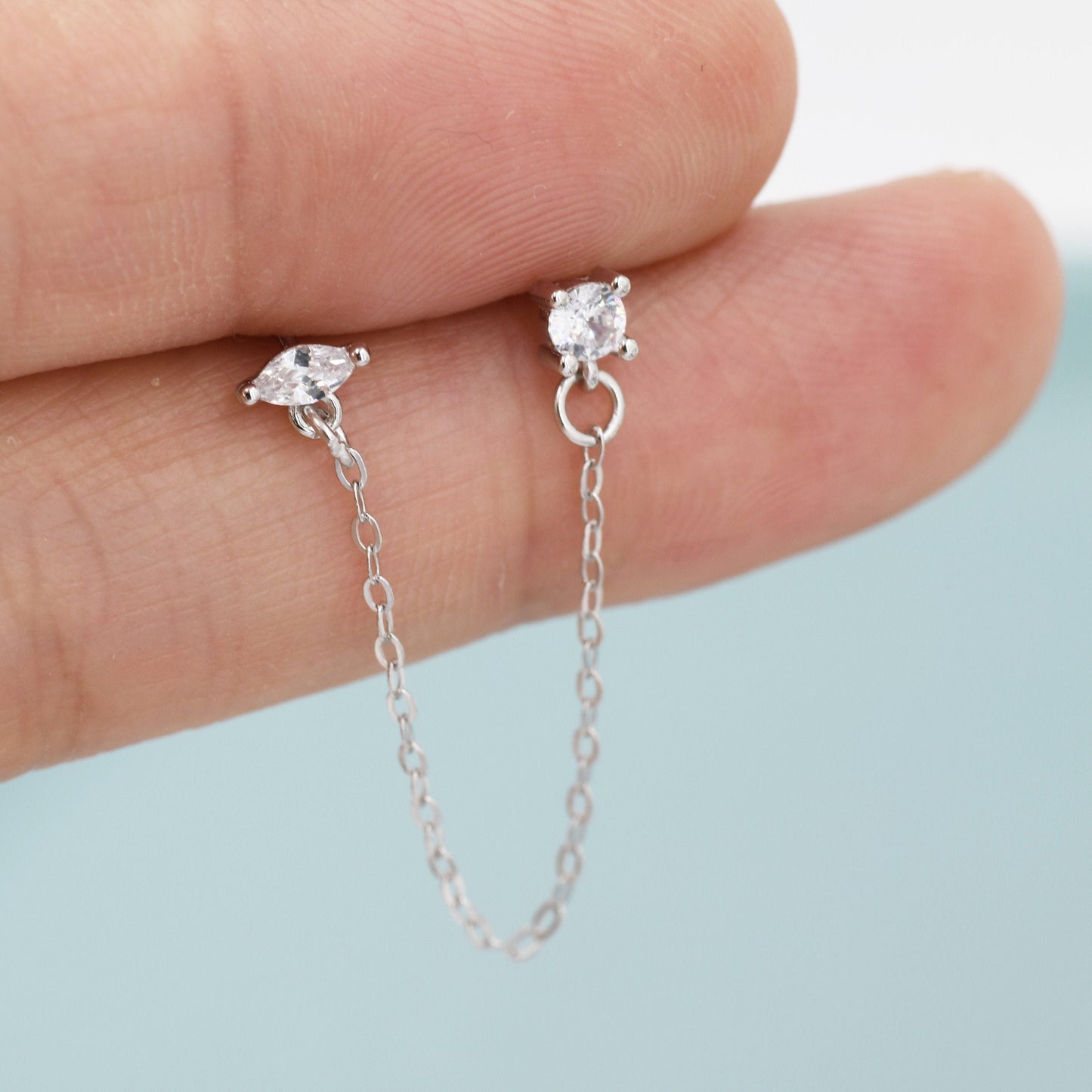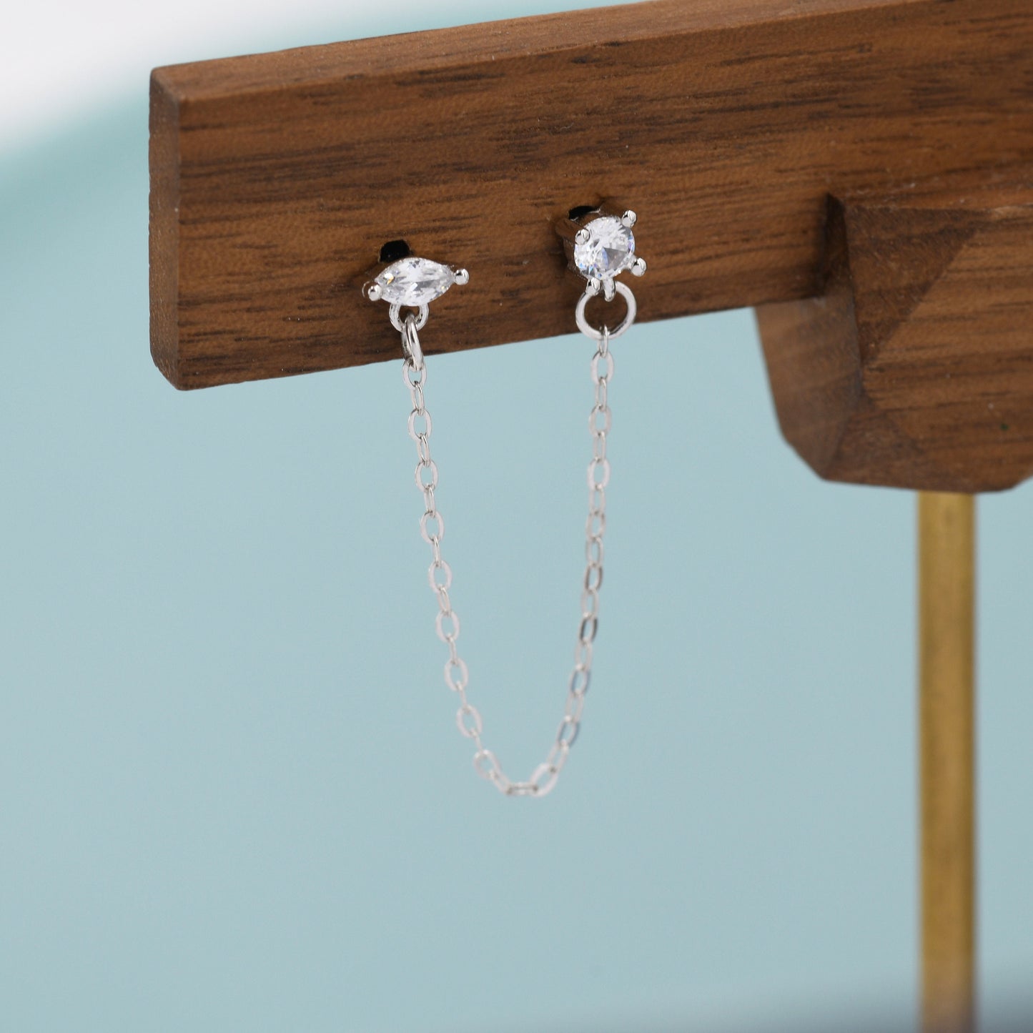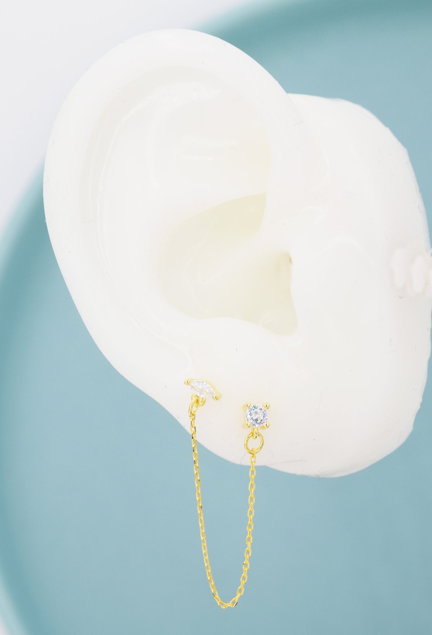 Sterling Silver Chained Earrings for Multiple Piercings, Silver or Gold, Marquise and Diamond Cut CZ Earrings, Asymmetric Stacking Earrings
