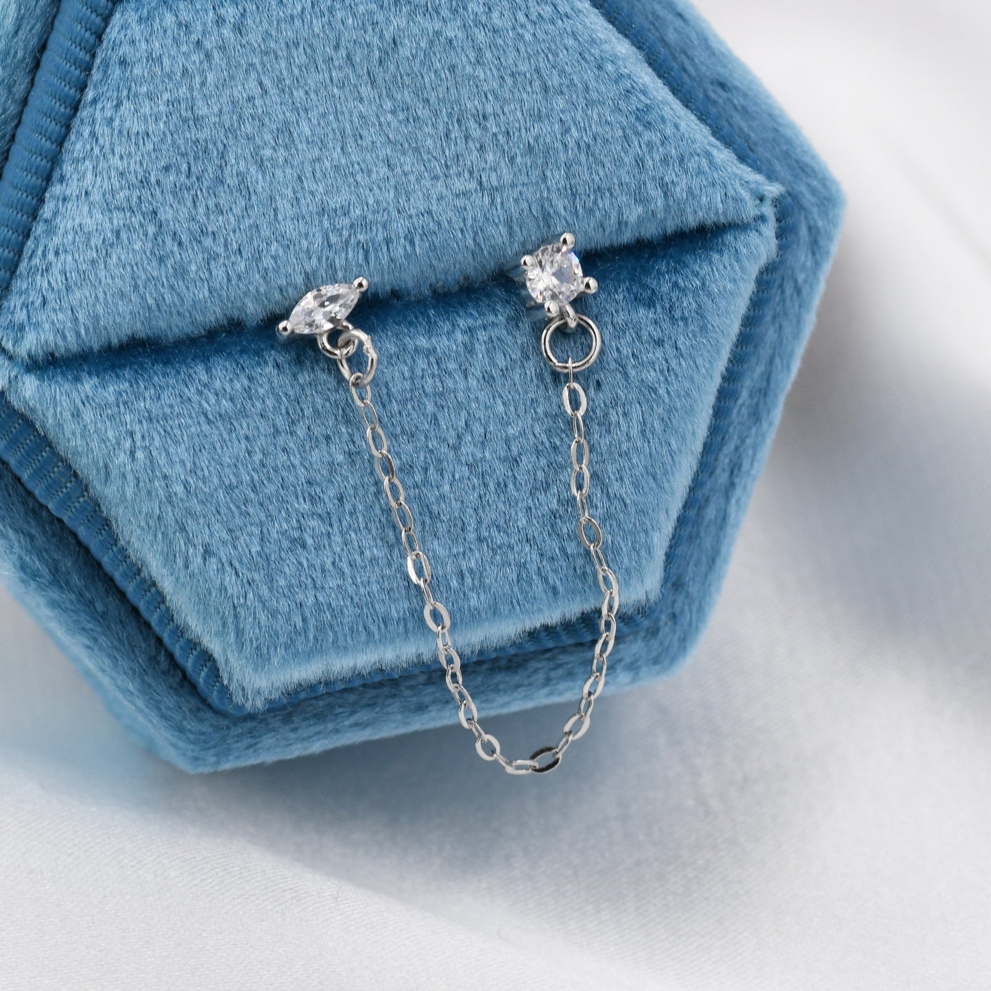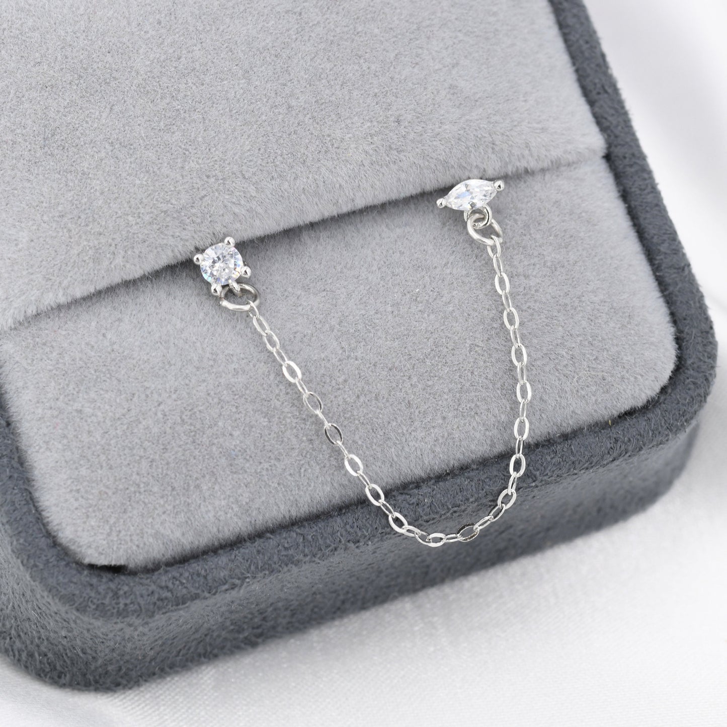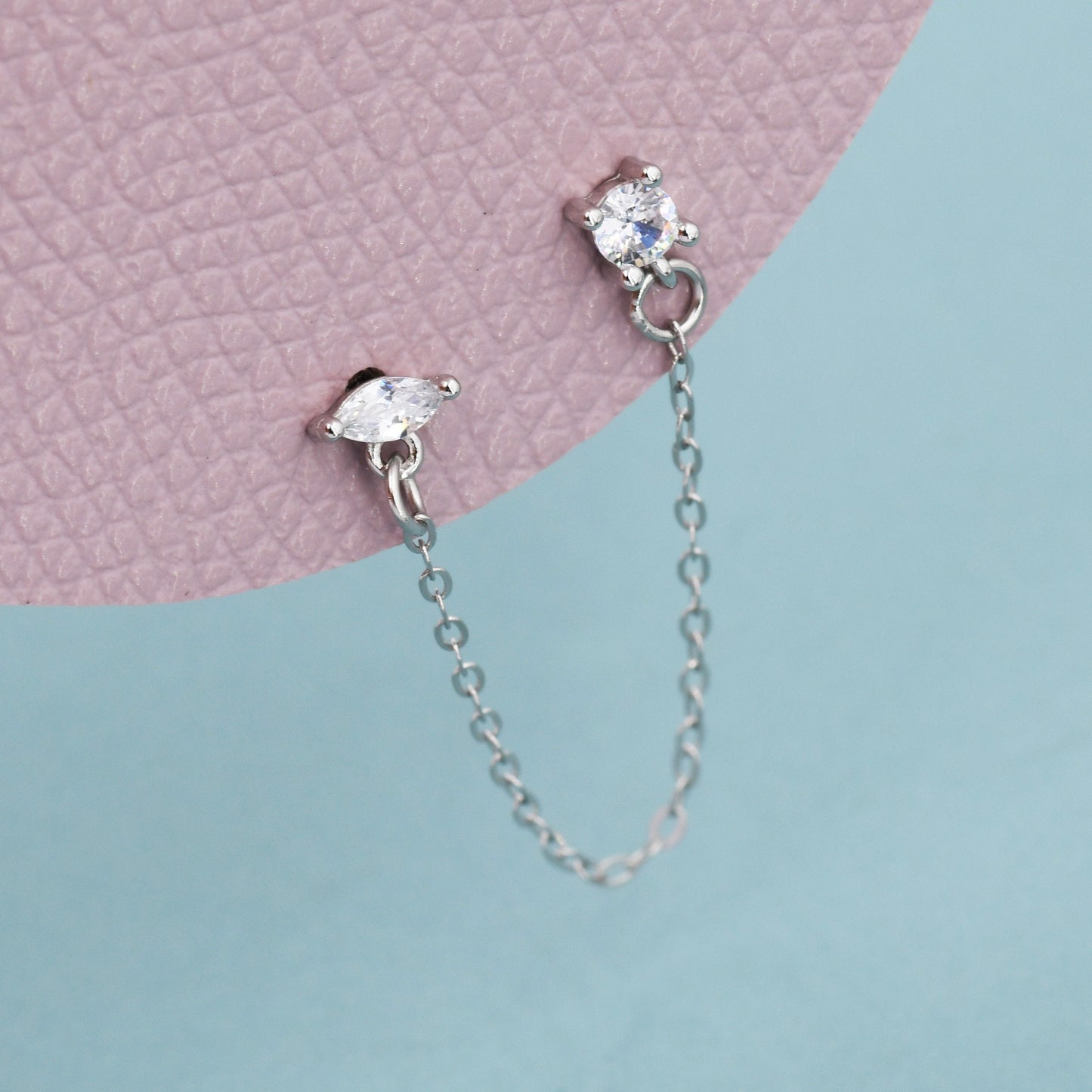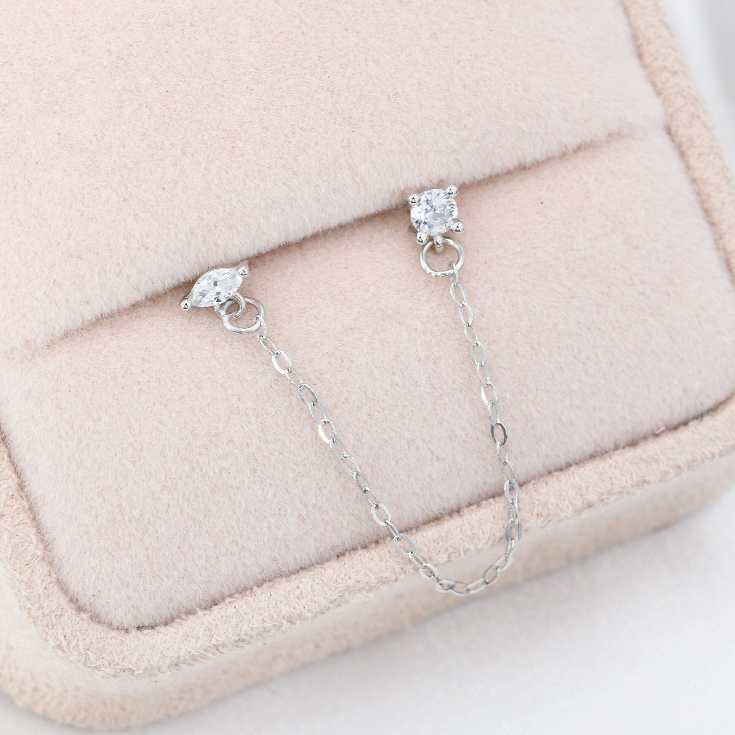 Sterling Silver Chained Earrings for Multiple Piercings, Silver or Gold, Marquise and Diamond Cut CZ Earrings, Asymmetric Stacking Earrings
