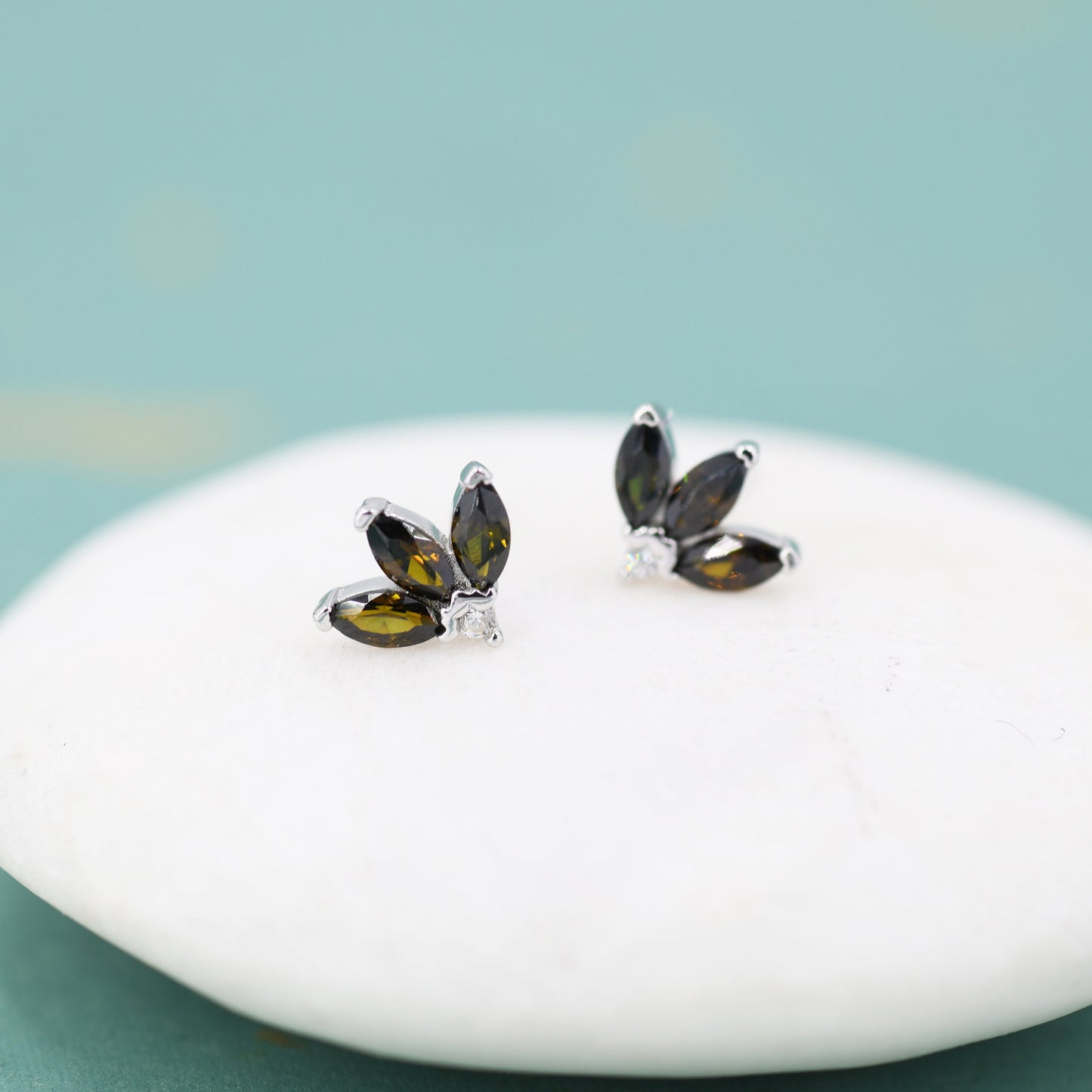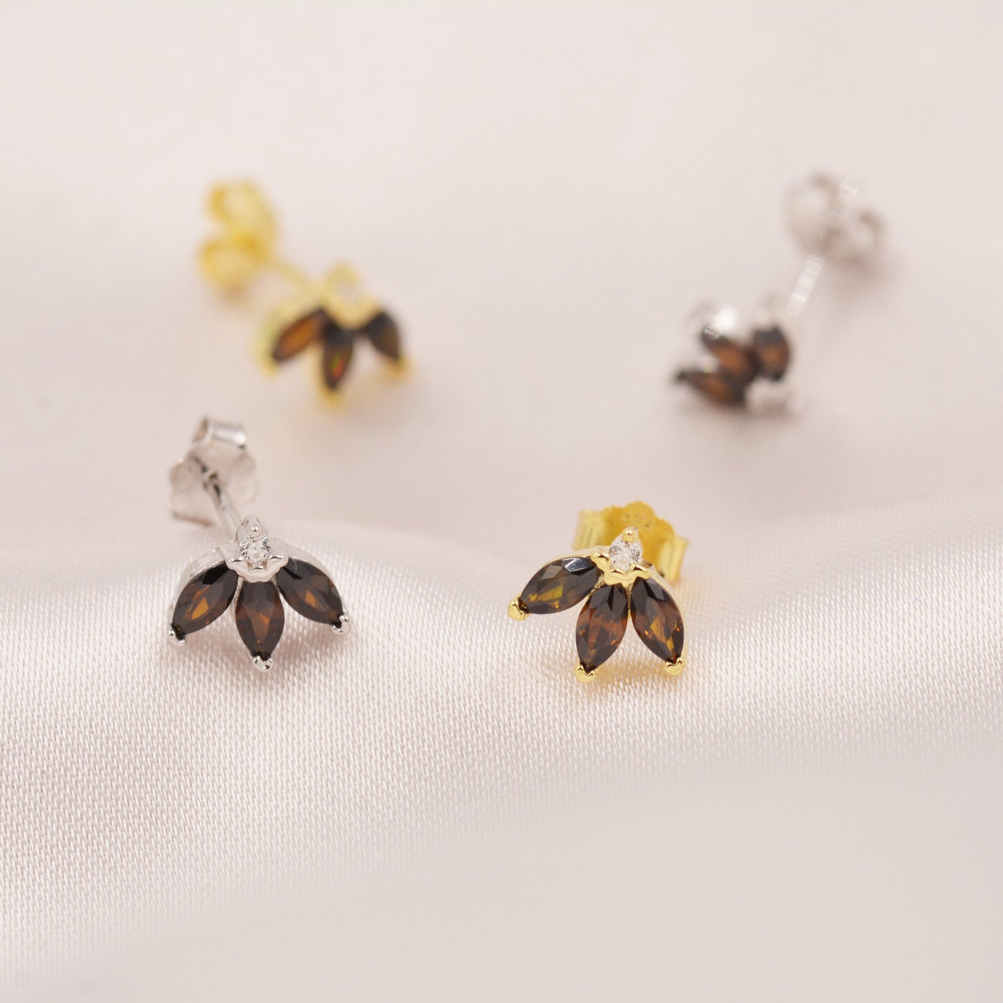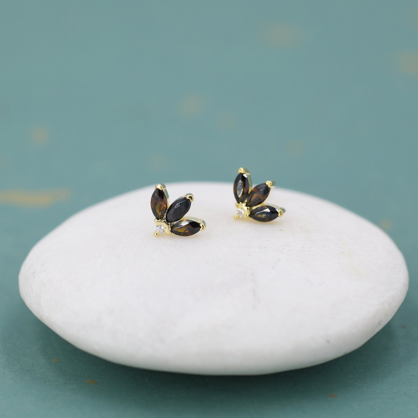 Sterling Silver Tiny Coffee CZ Marquise Cluster Stud Earrings, Gold or Silver, Marquise Fan Stud, CZ Crown Stud, Three Marquise Stud