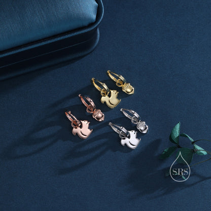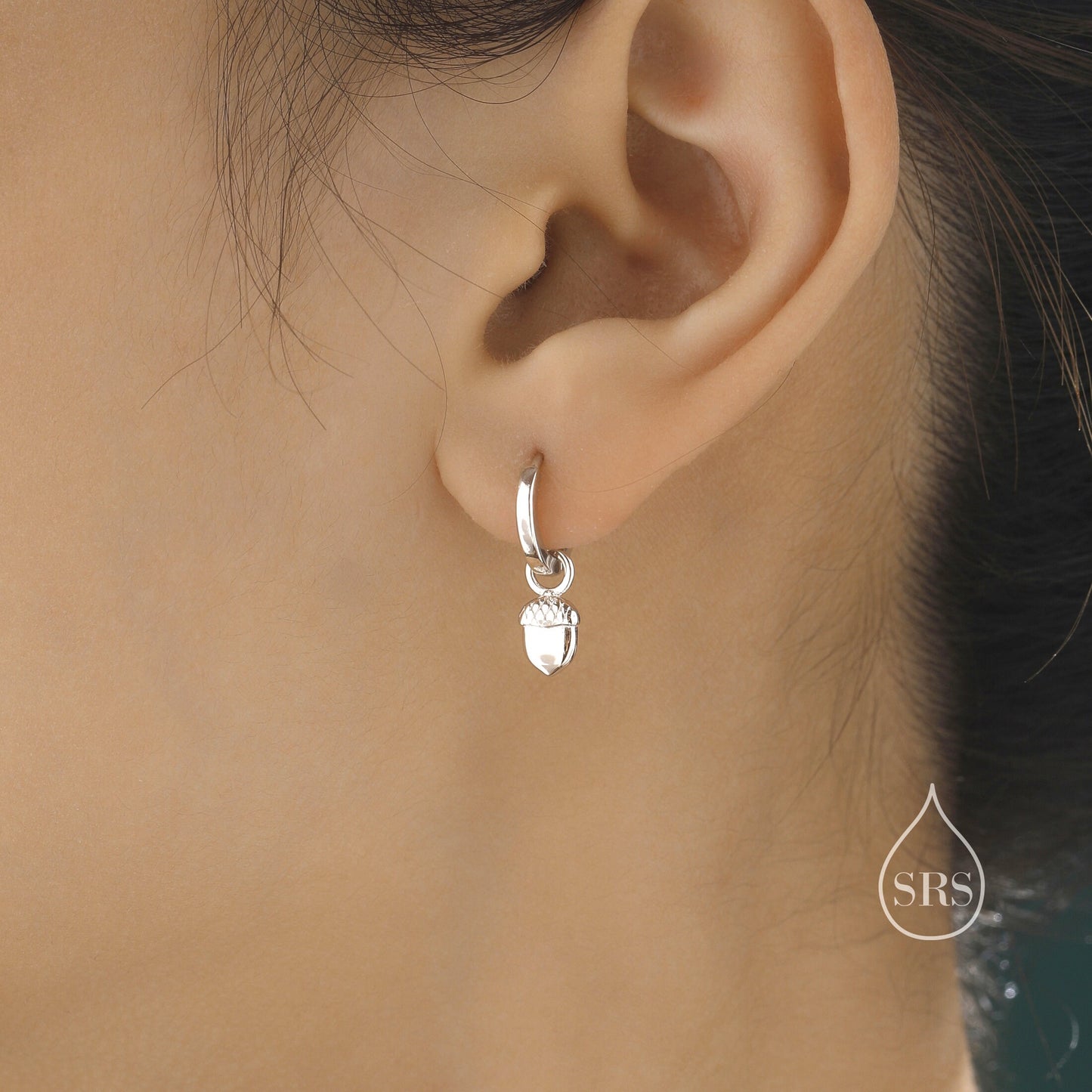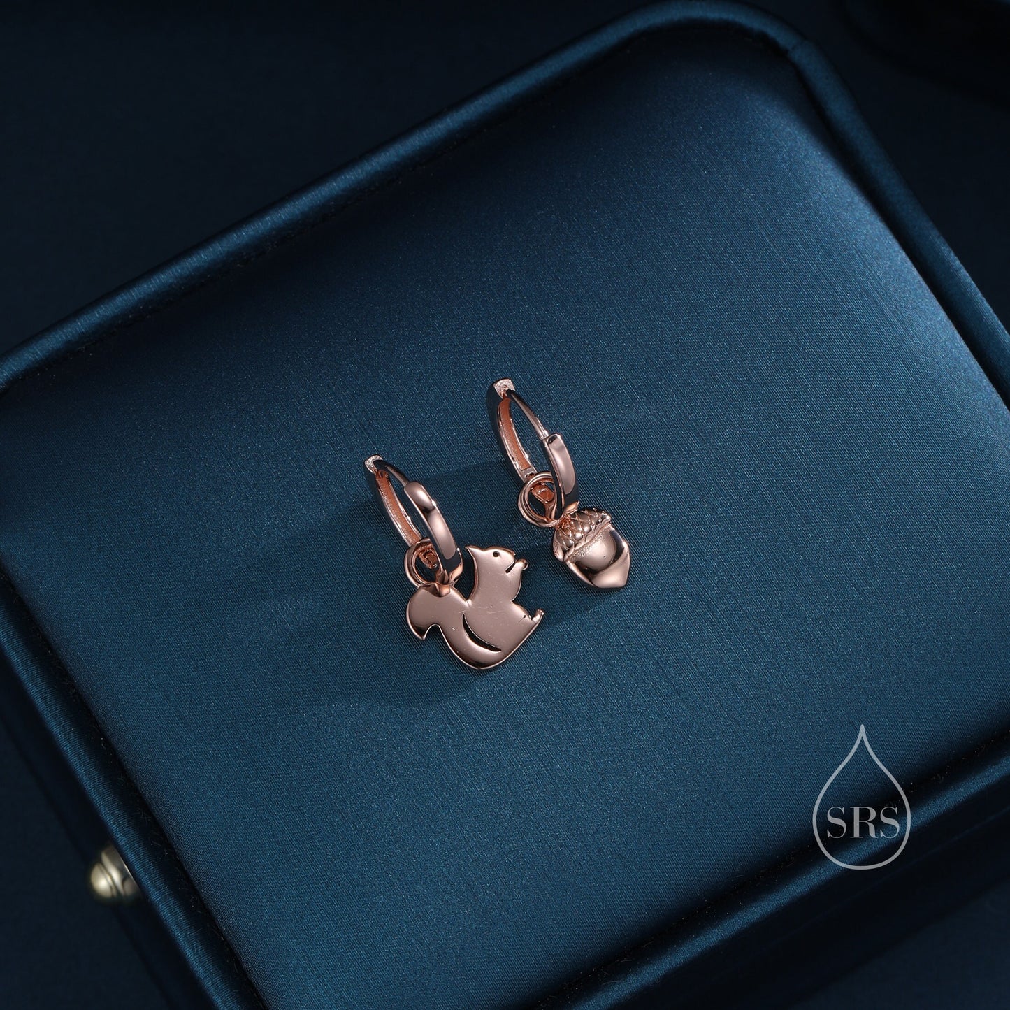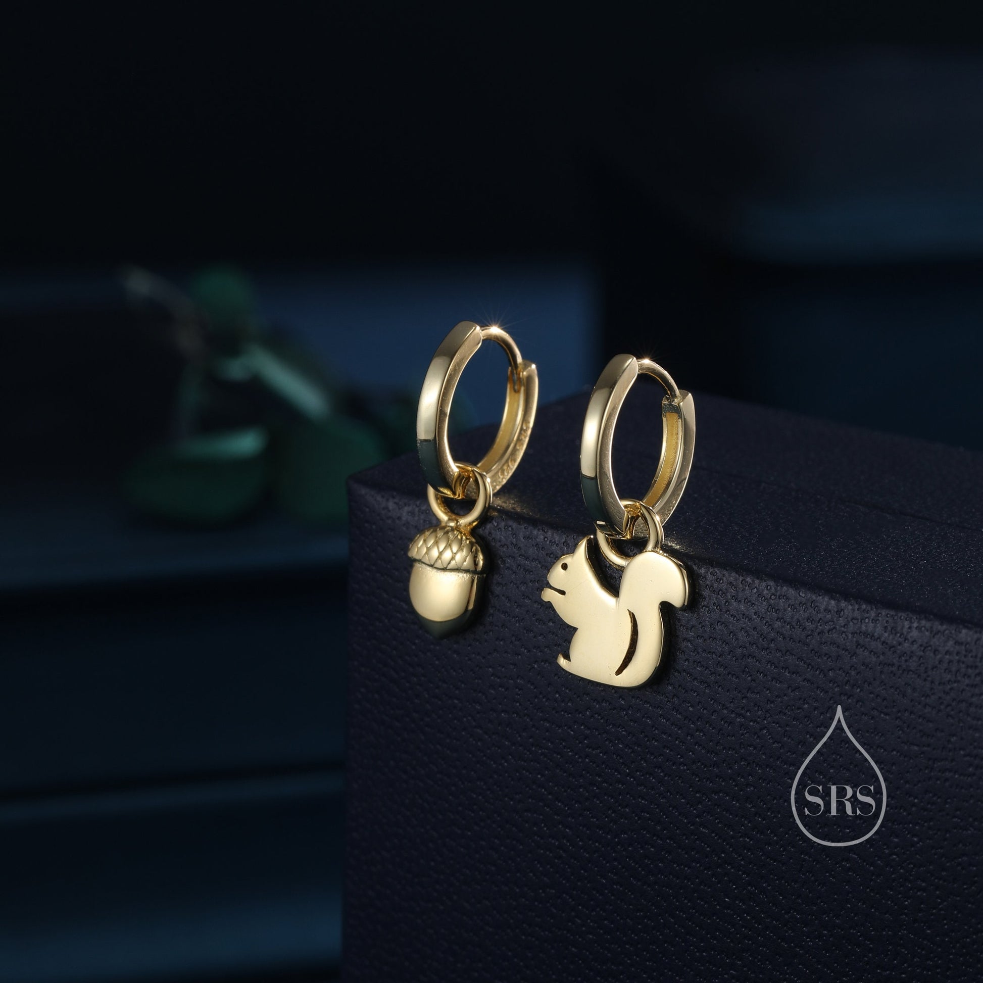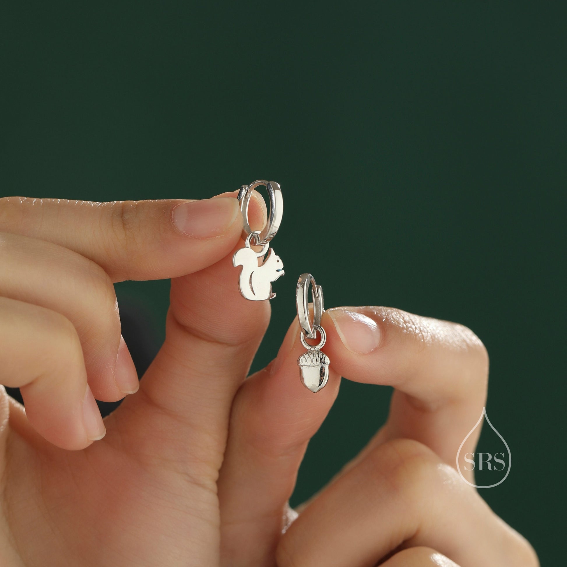 Sterling Silver Cute Squirrel and Acorn Dangle Huggie Hoops, Detachable Squirrel Hoop Earrings, Dainty Dangle Earrings, Squirrel Earrings