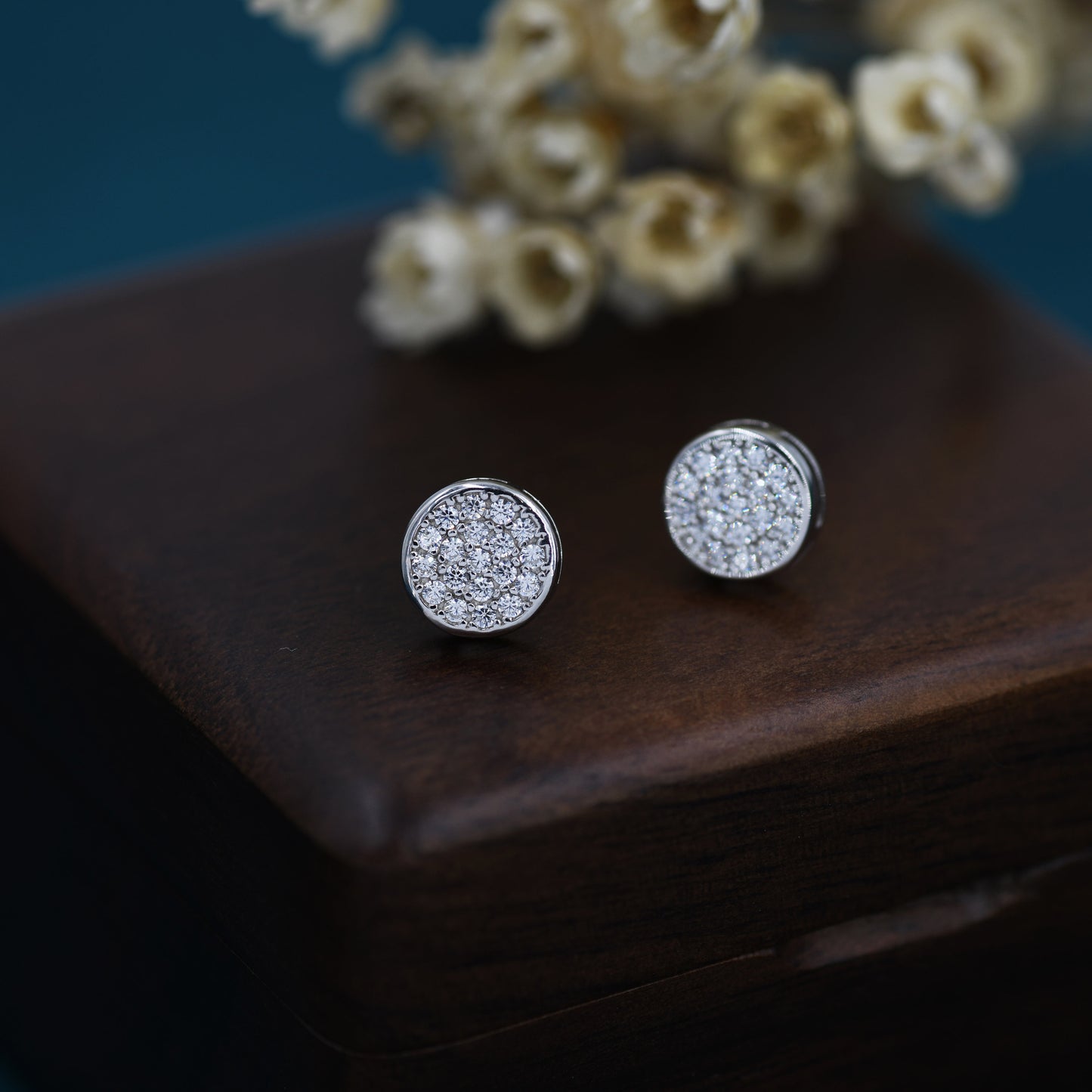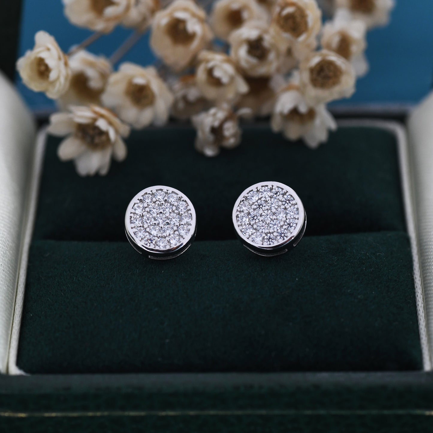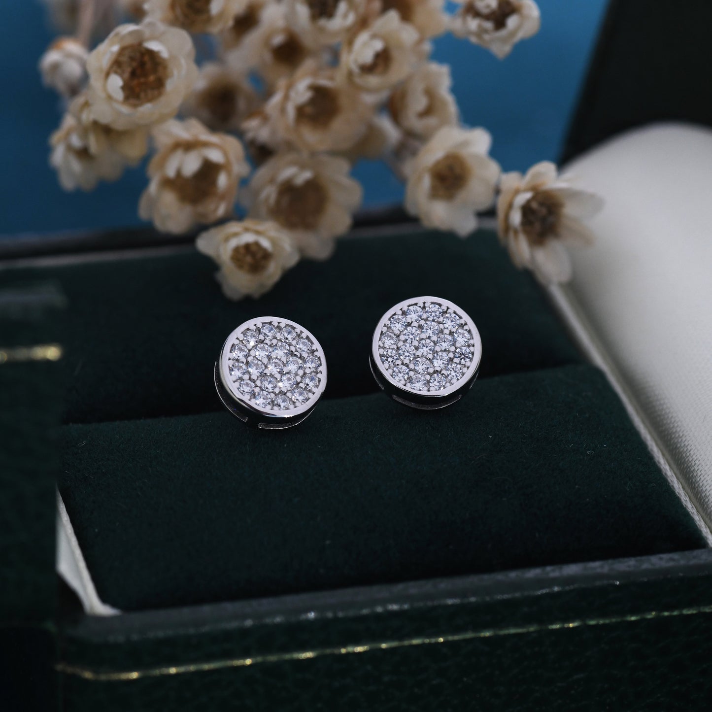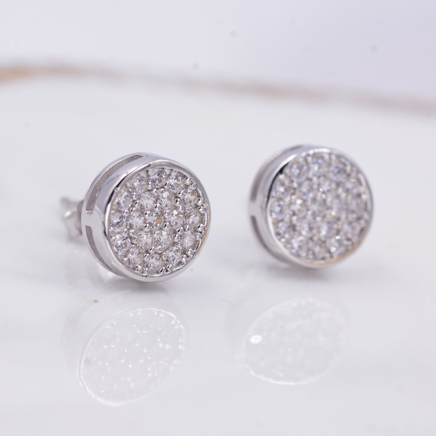 Sterling Silver CZ Crystal Encrusted Disk Stud Earrings, Simple and Elegant.