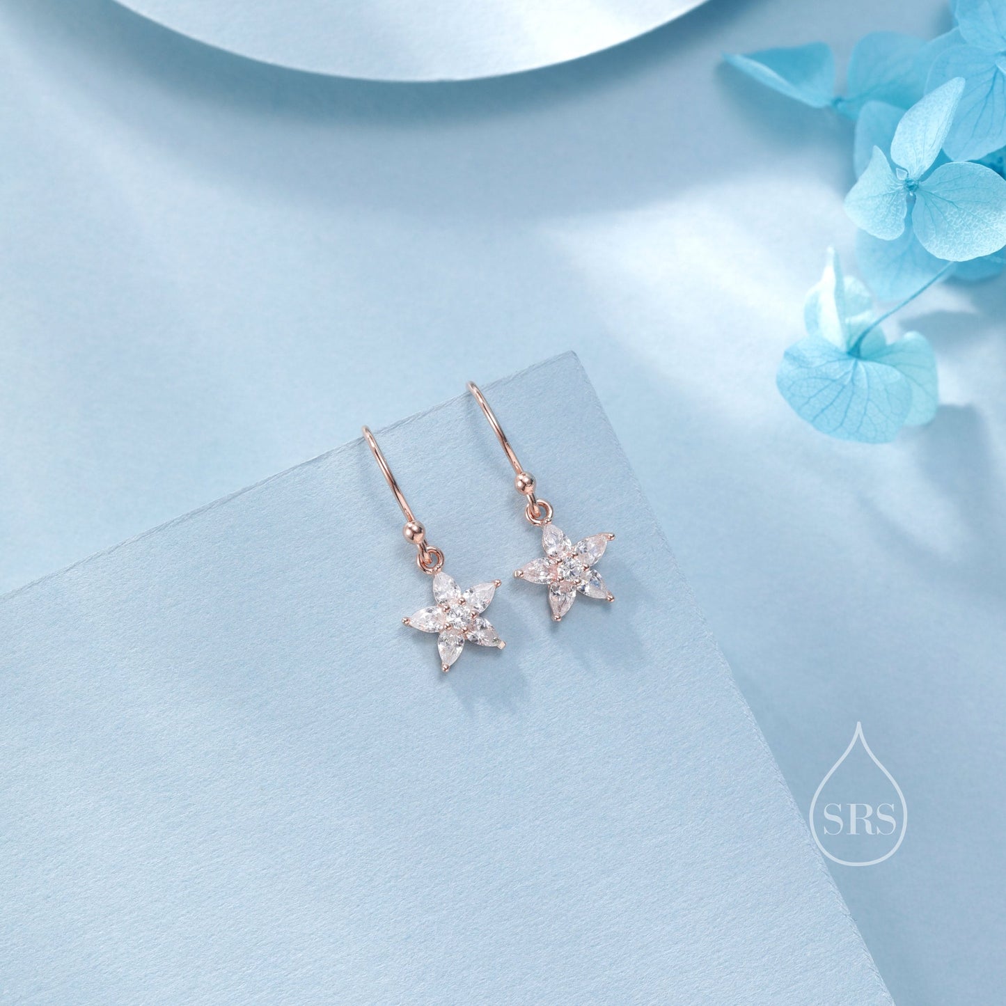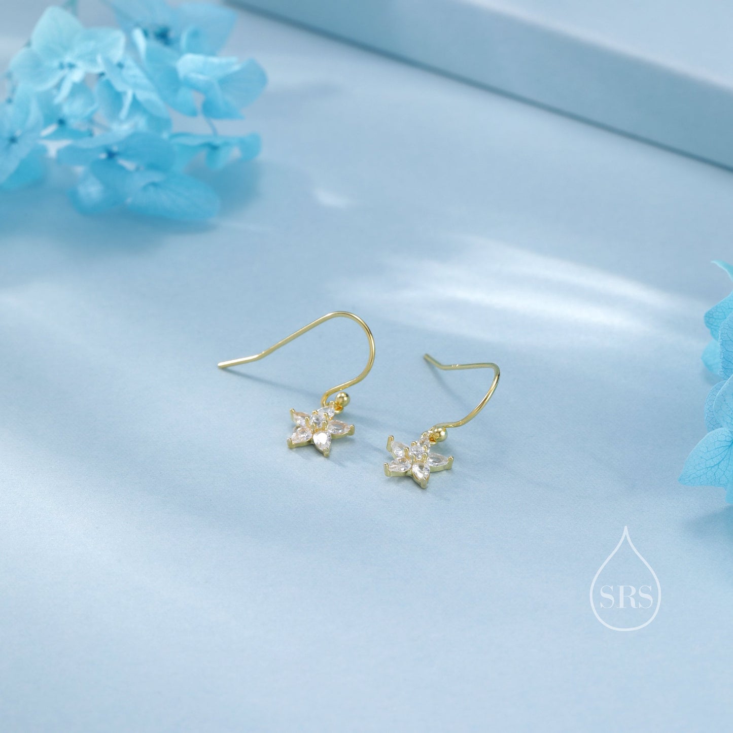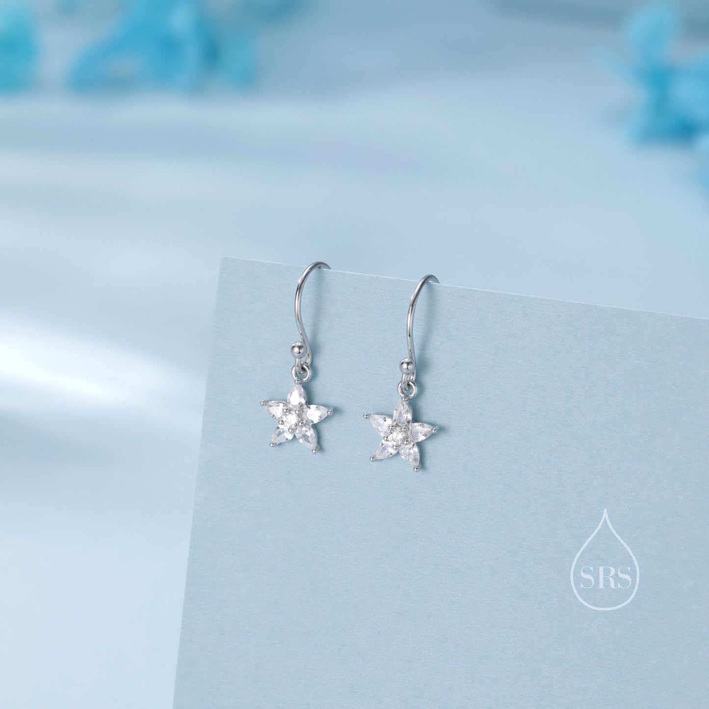 Sterling Silver Dainty CZ Flower Drop Dangle Earrings, Dainty Dangle Daisy Flower Drop Earrings, Silver Forget Me Not Hook Earrings