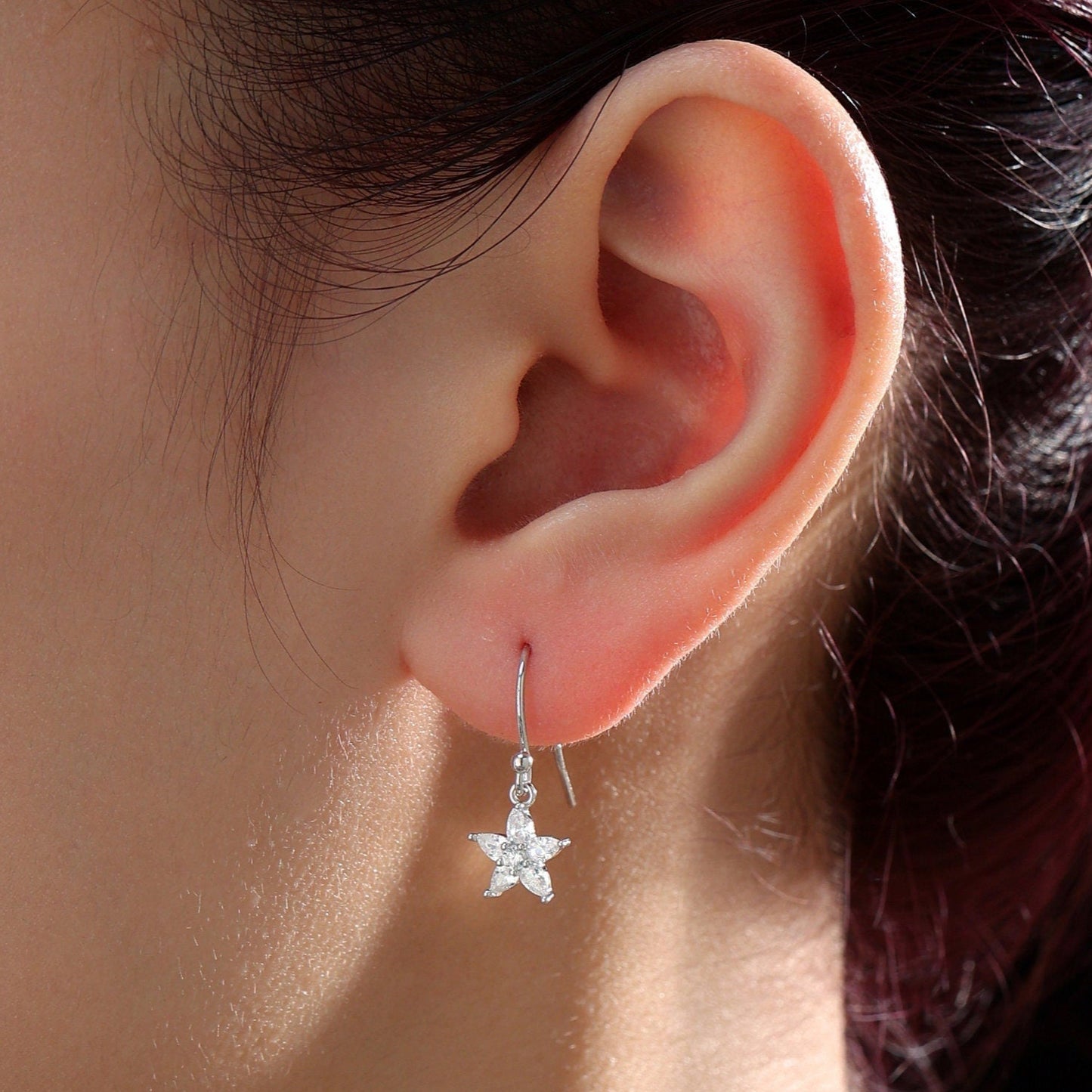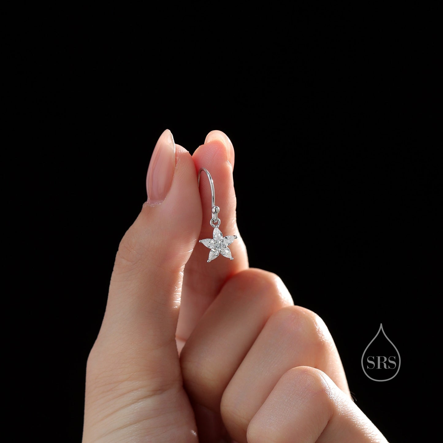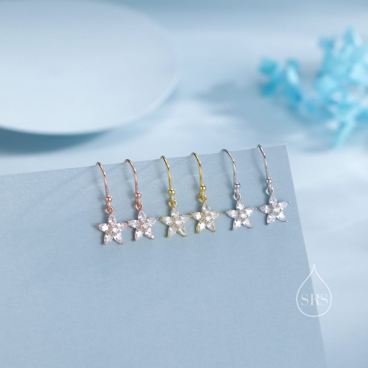 Sterling Silver Dainty CZ Flower Drop Dangle Earrings, Dainty Dangle Daisy Flower Drop Earrings, Silver Forget Me Not Hook Earrings