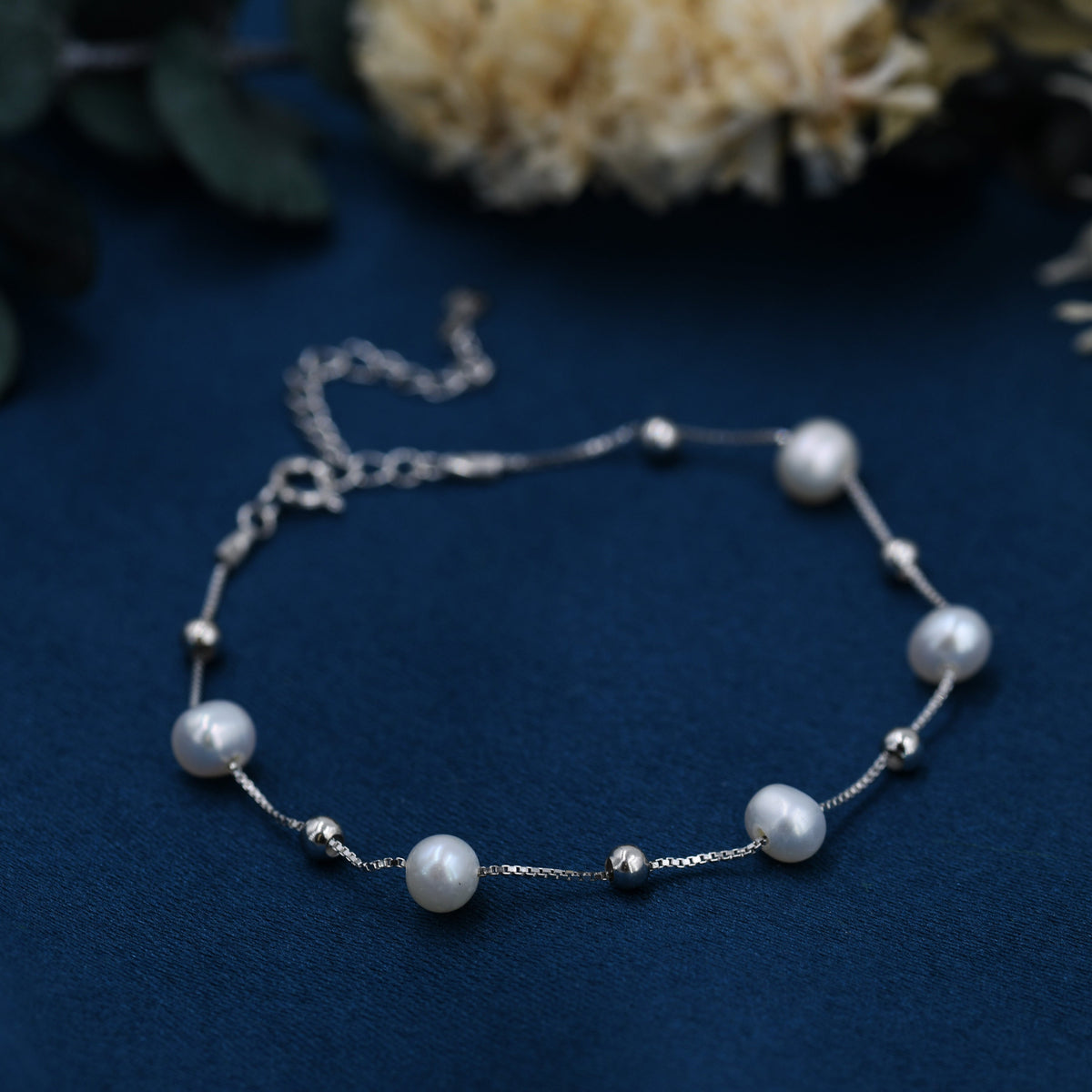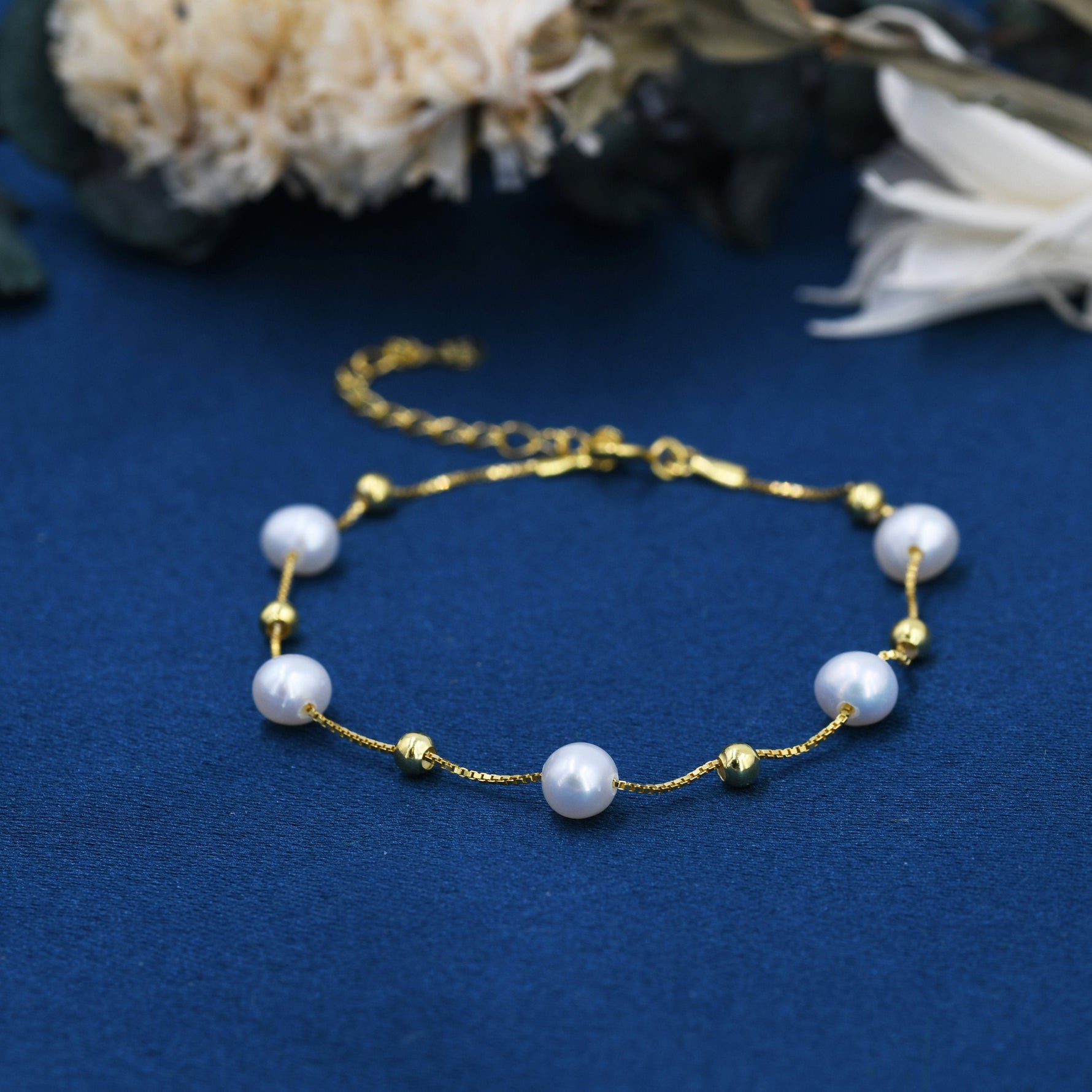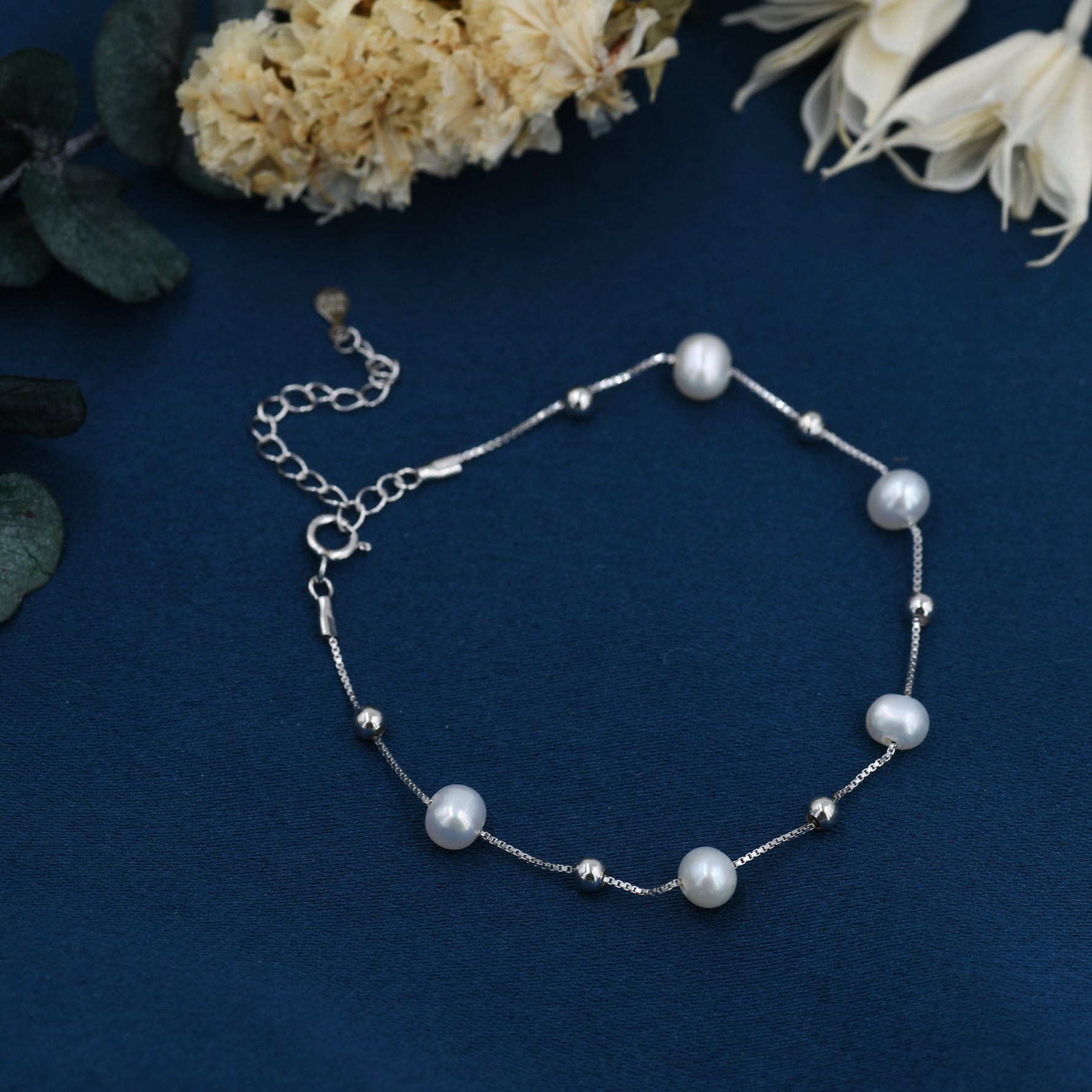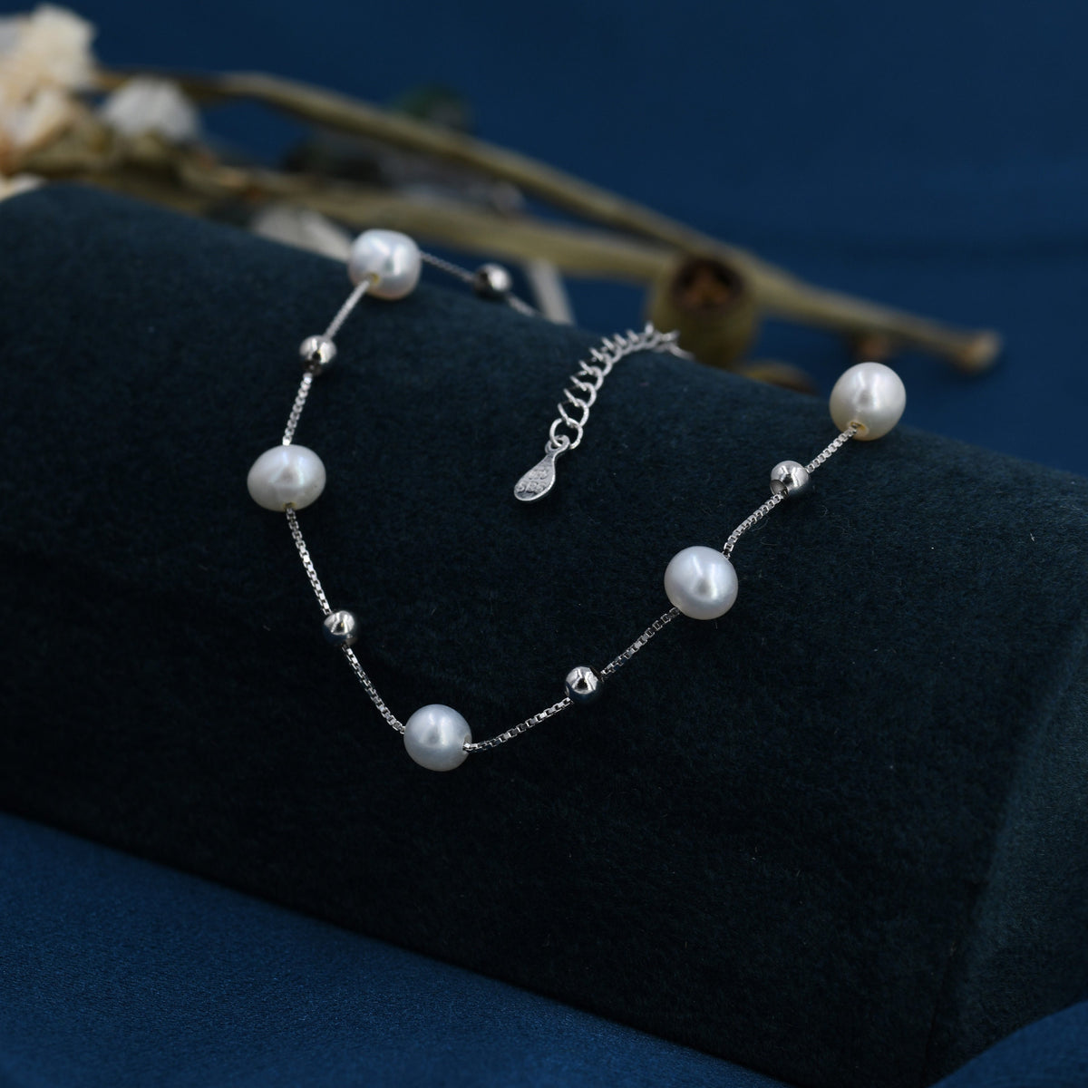 Sterling Silver Delicate Pearl and Silver Ball Beaded Bracelet, Silver or Gold, Genuine Freshwater Pearls, Natural Pearl Bracelet