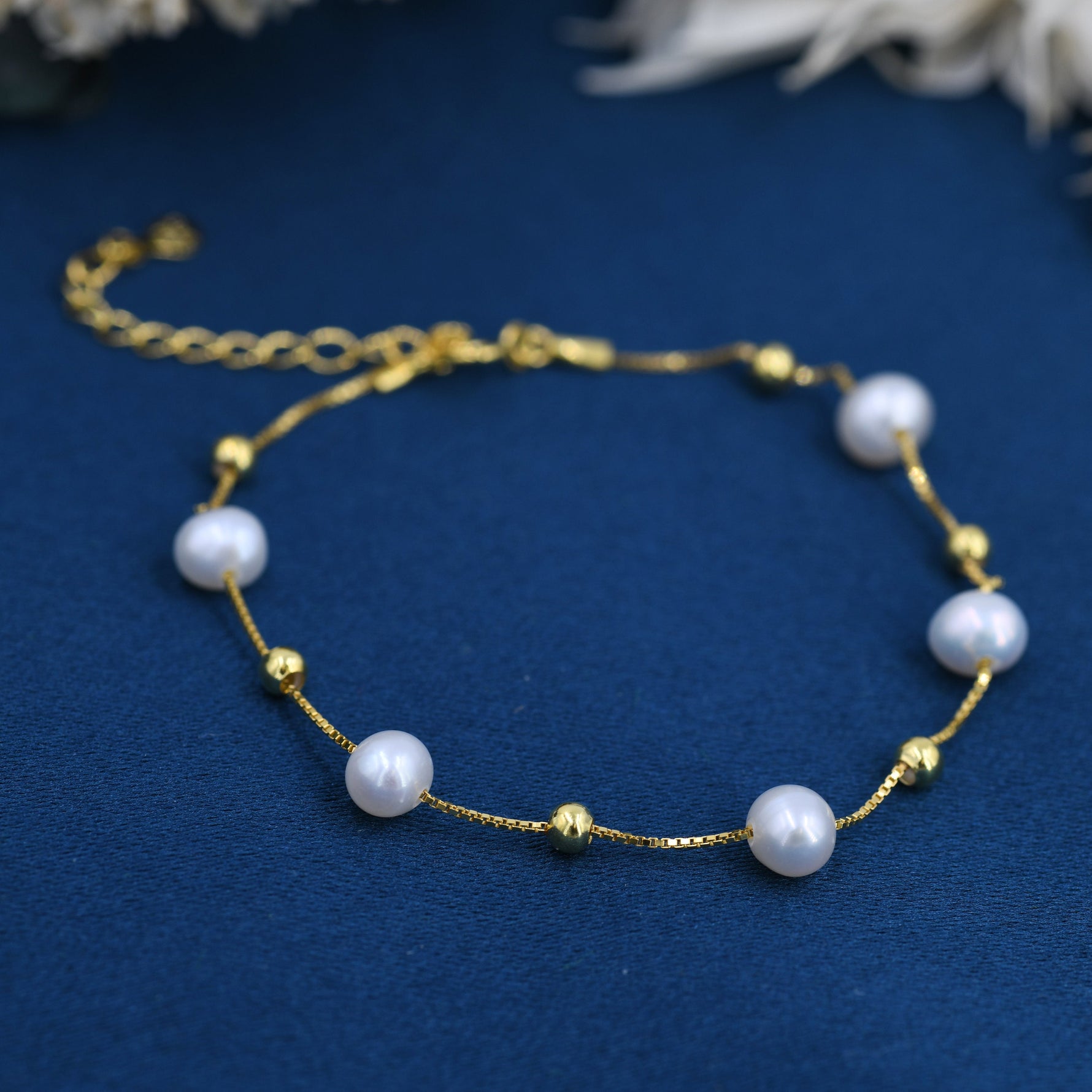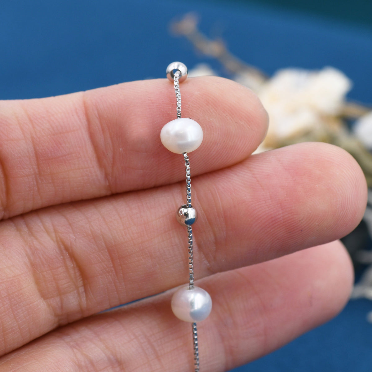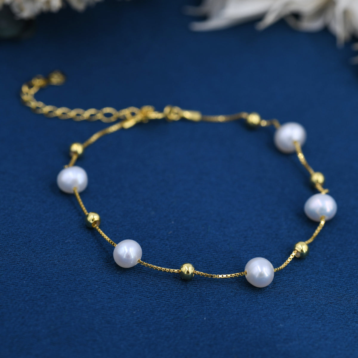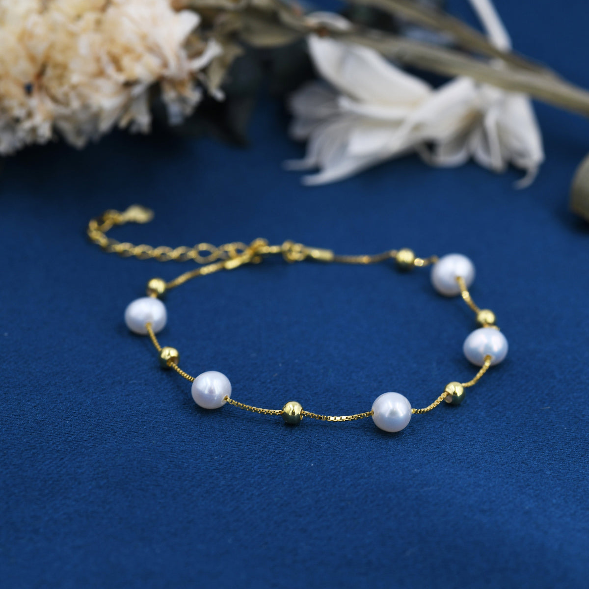 Sterling Silver Delicate Pearl and Silver Ball Beaded Bracelet, Silver or Gold, Genuine Freshwater Pearls, Natural Pearl Bracelet