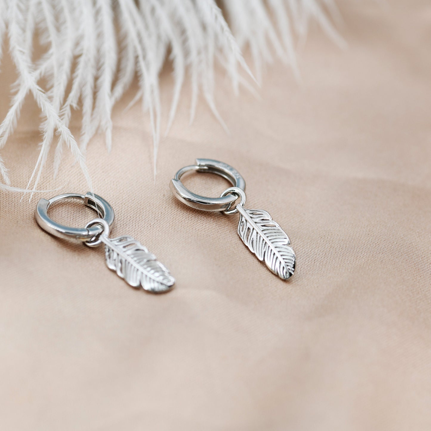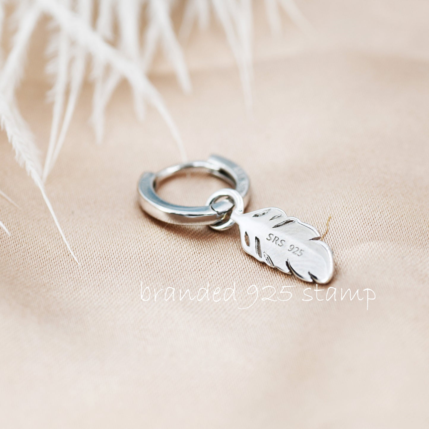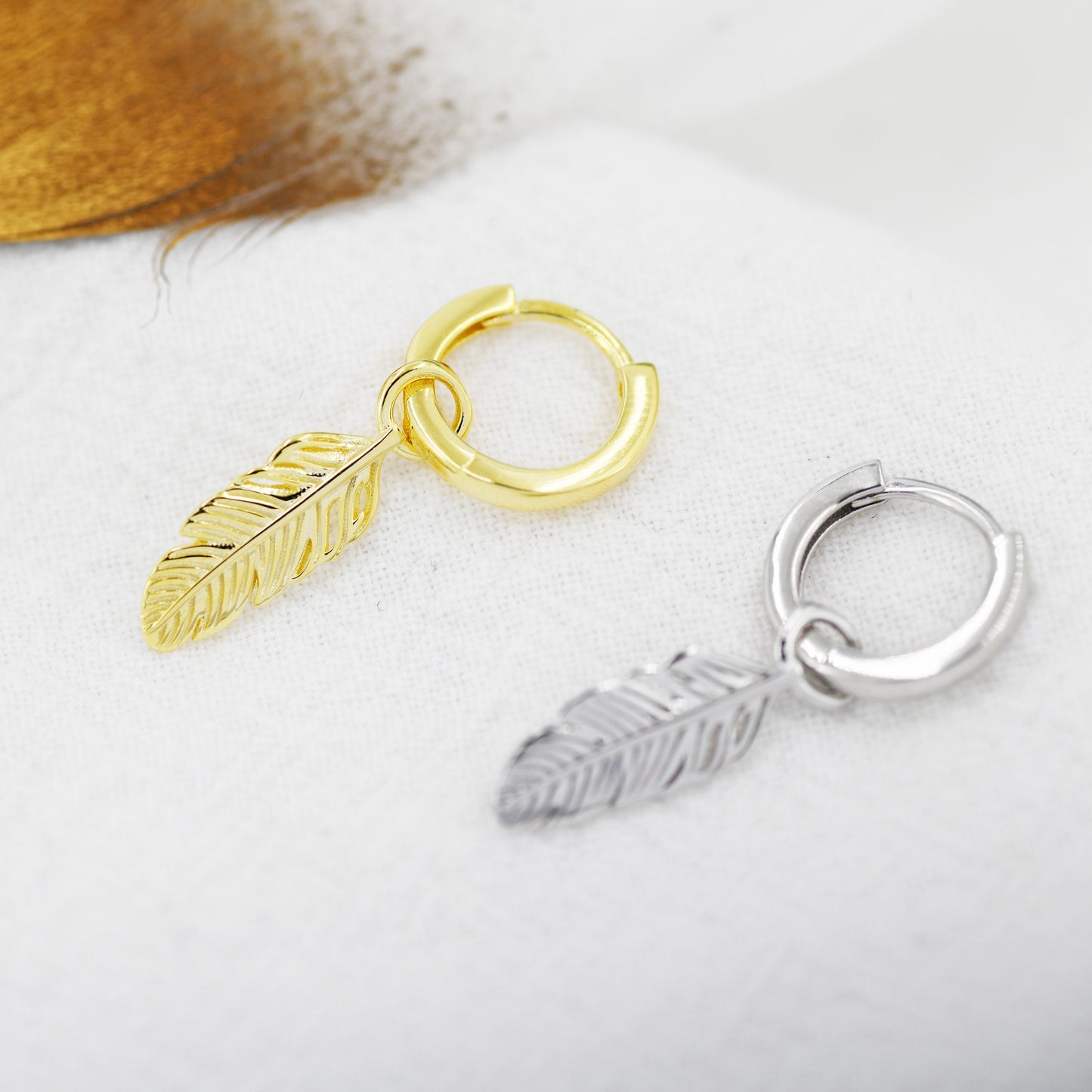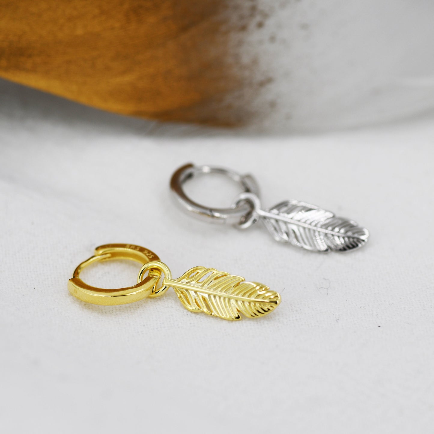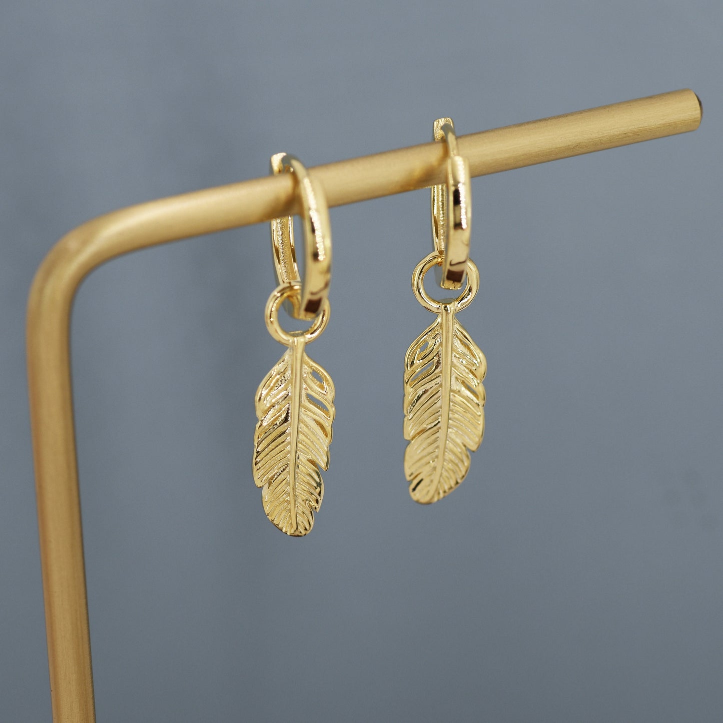 Sterling Silver Feather Hoop Earrings, Detachable Feather Dangle Hoop Earrings, Silver or Gold, Interchangeable Charms