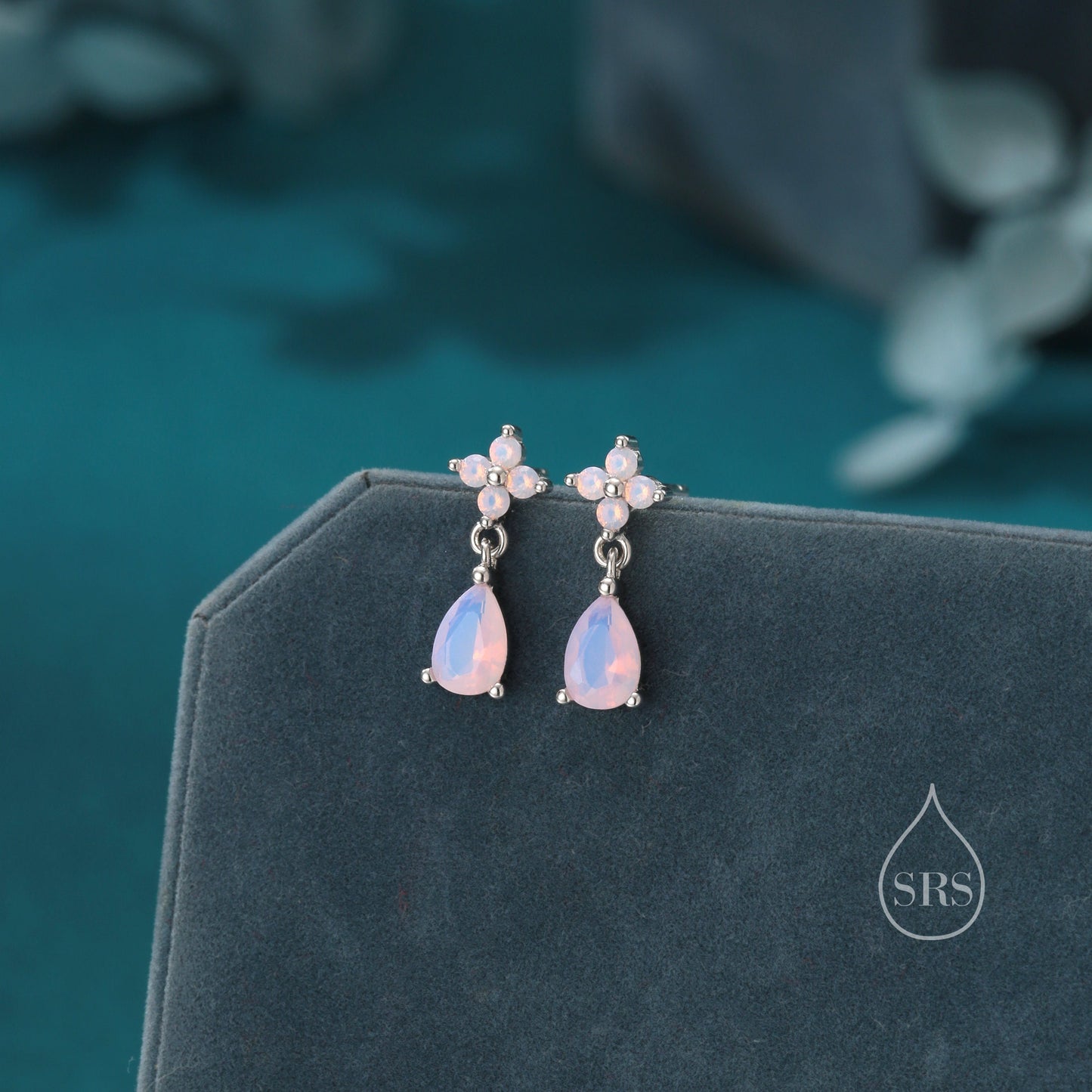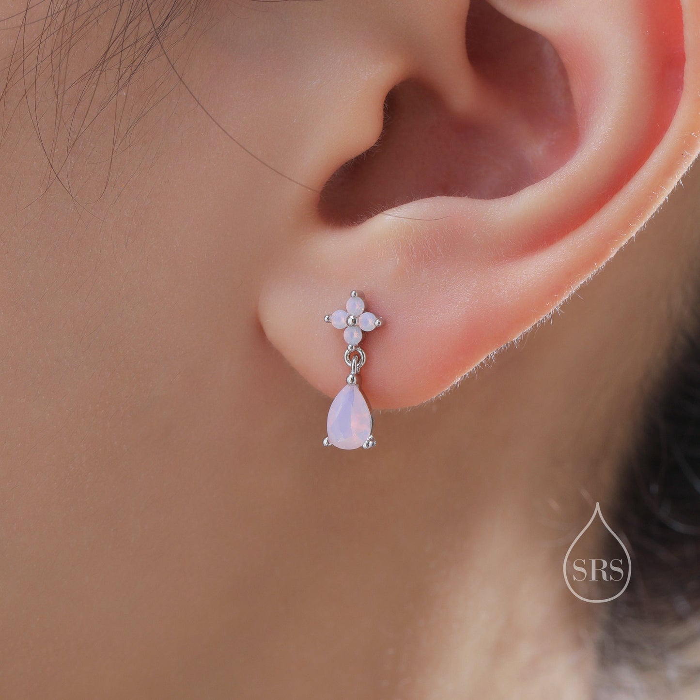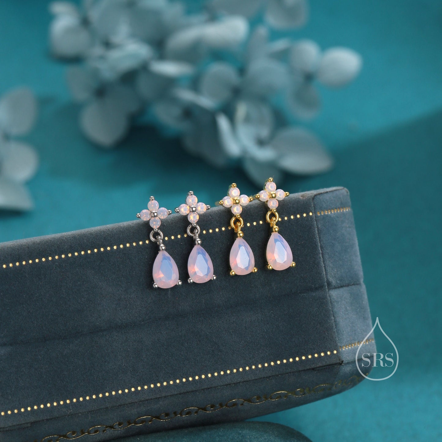 Sterling Silver Four CZ and Droplet Stud Earrings with Opal Pink CZs, Silver or Gold, Hydrangea CZ Earrings with Pong Set Dangle Dropet