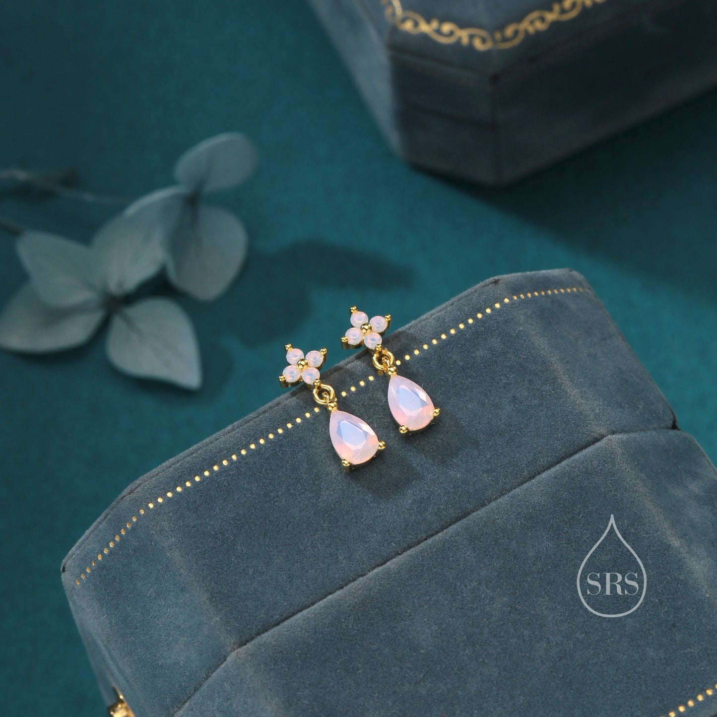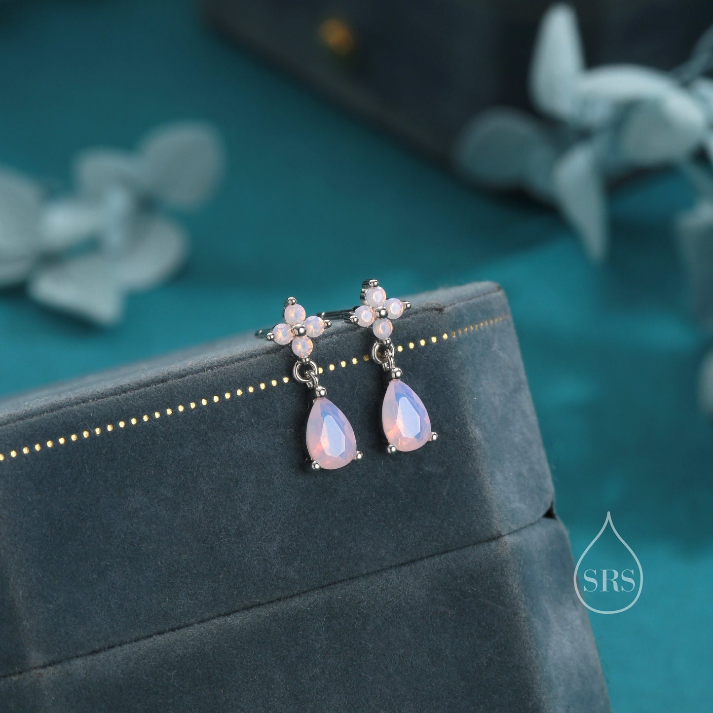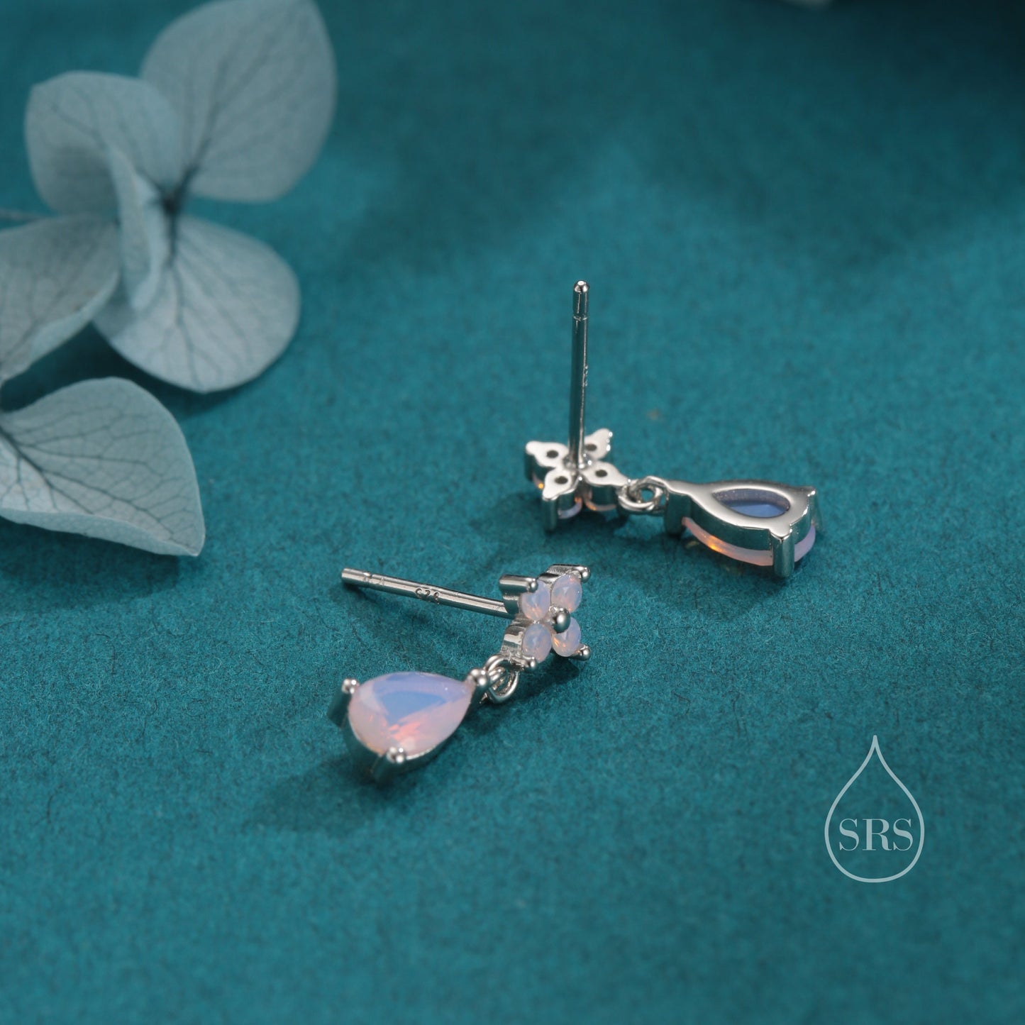 Sterling Silver Four CZ and Droplet Stud Earrings with Opal Pink CZs, Silver or Gold, Hydrangea CZ Earrings with Pong Set Dangle Dropet