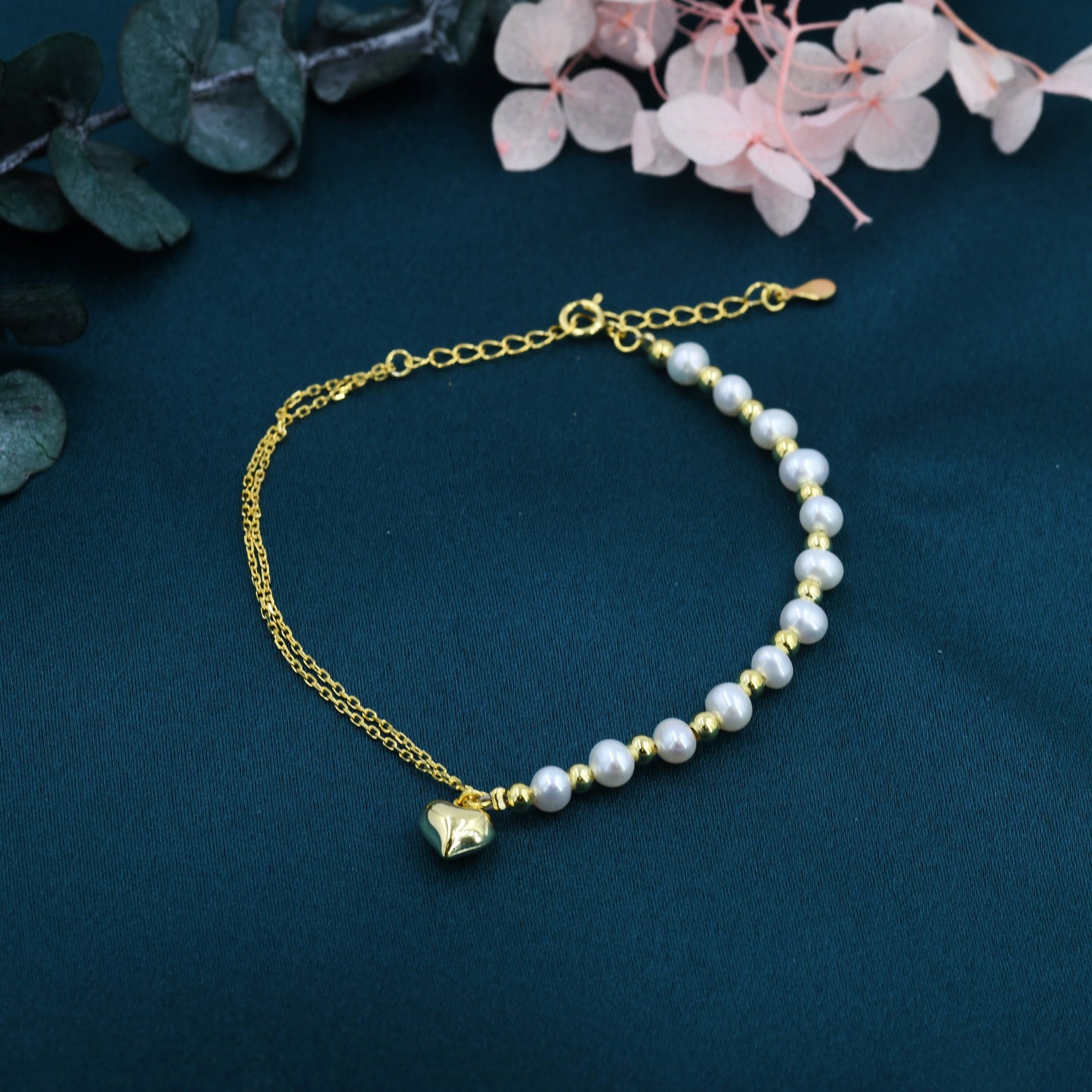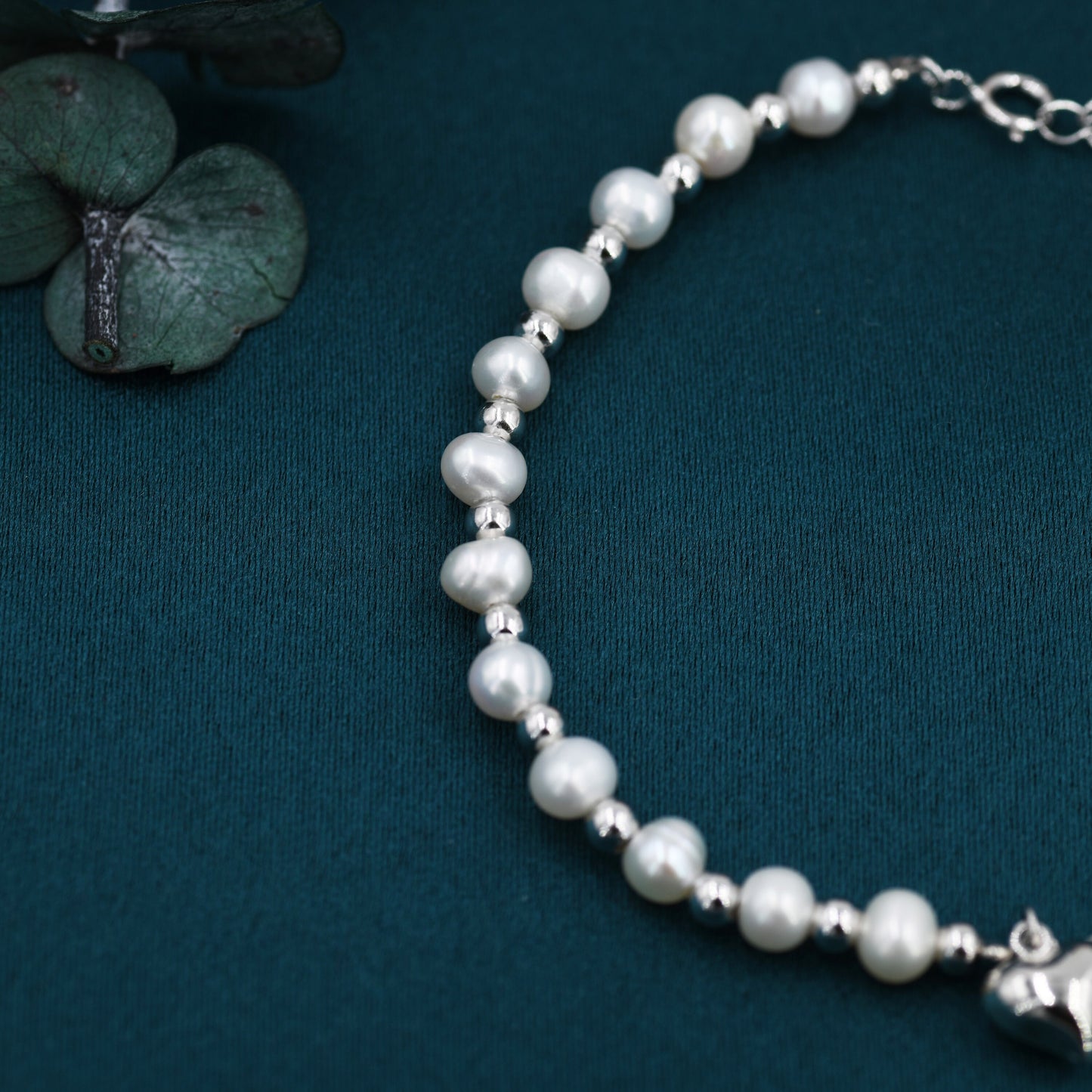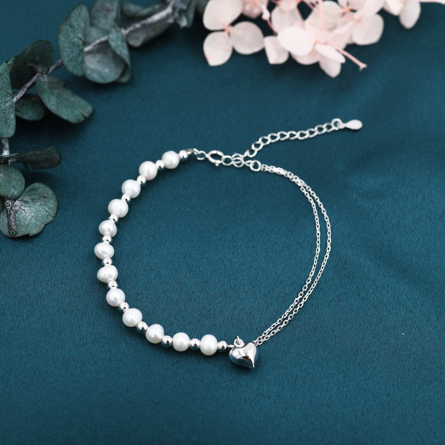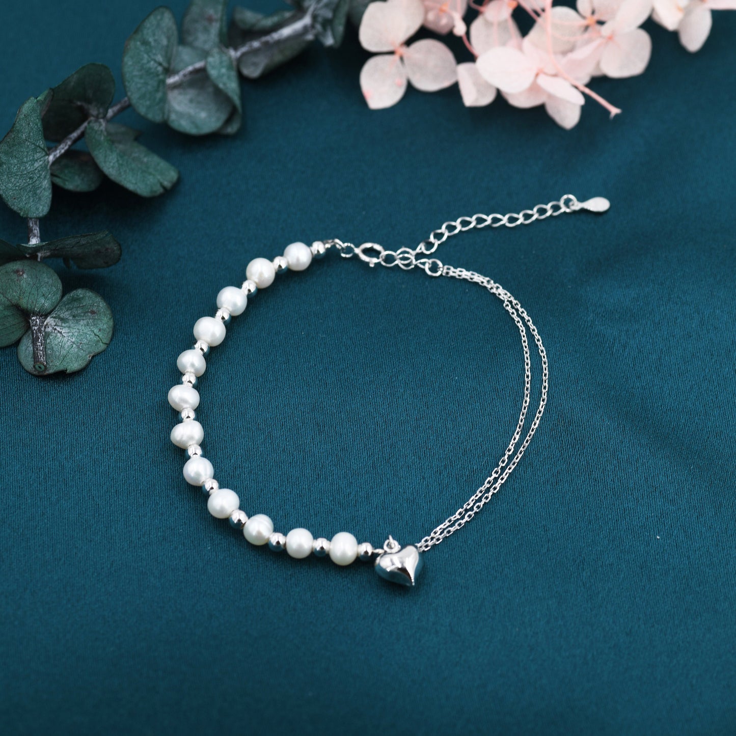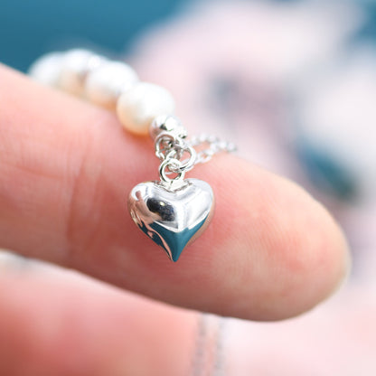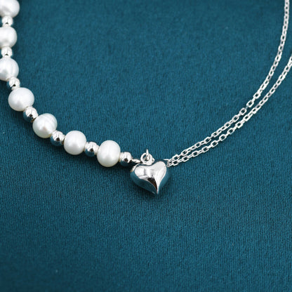 Sterling Silver Freshwater Pearl and Double Strand Beaded Bracelet with a Heart Charm, Silver or Gold, Genuine Pearls, Natural Pearl