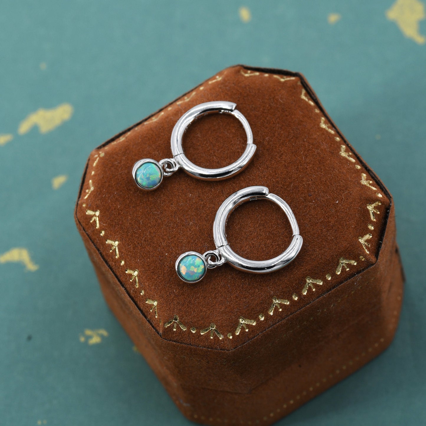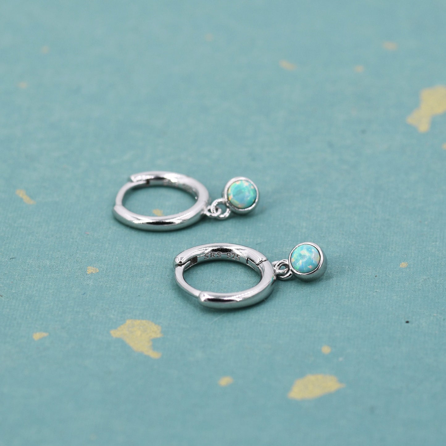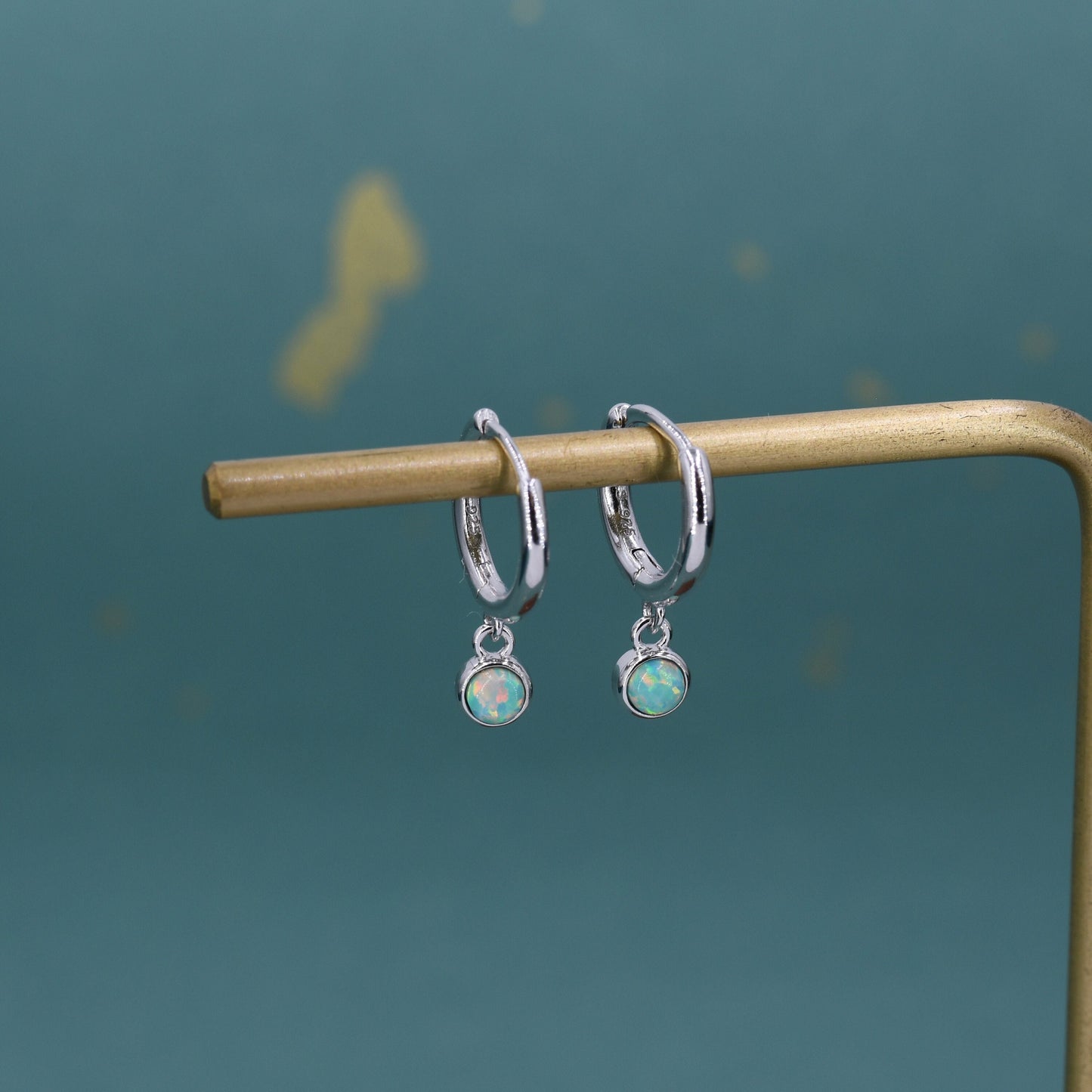 Sterling Silver Dangling 3mm Green Opal Hoop Earrings, Aqua Green Opal Charm Dangle Hoop Earrings, Silver or Gold, Lab Opal Hoops.