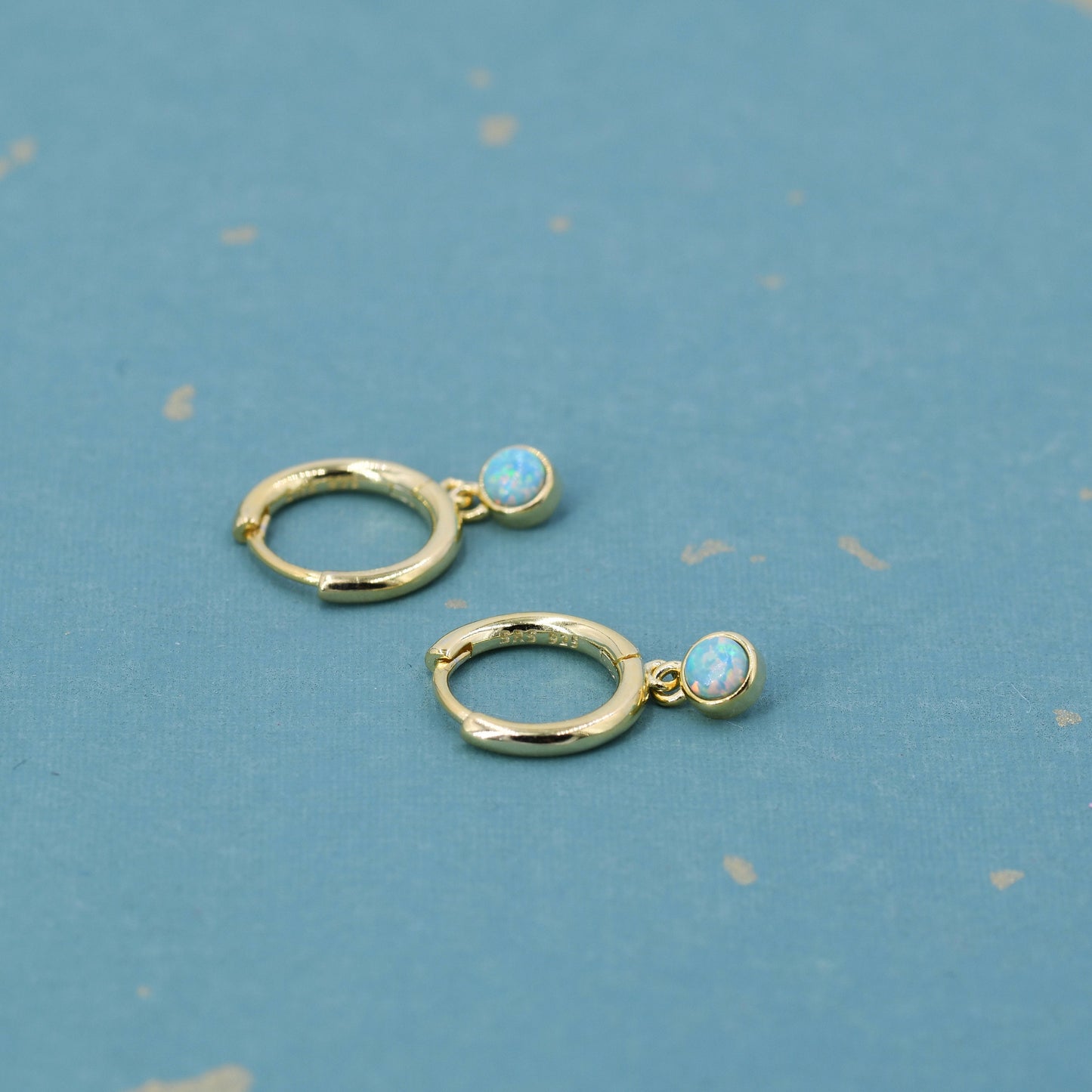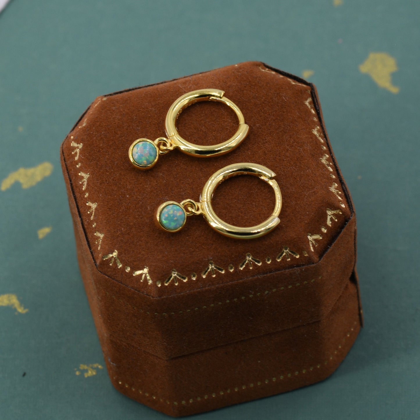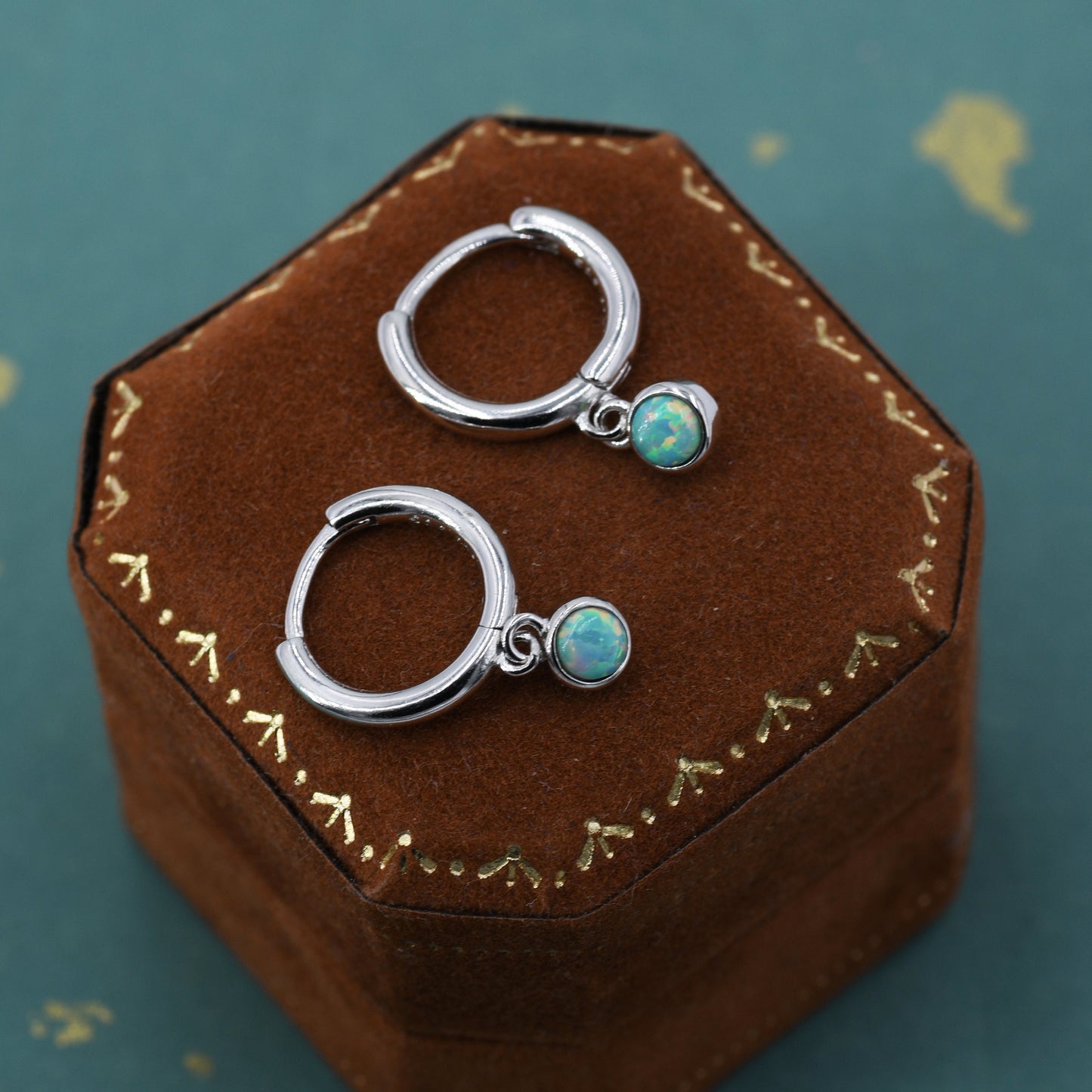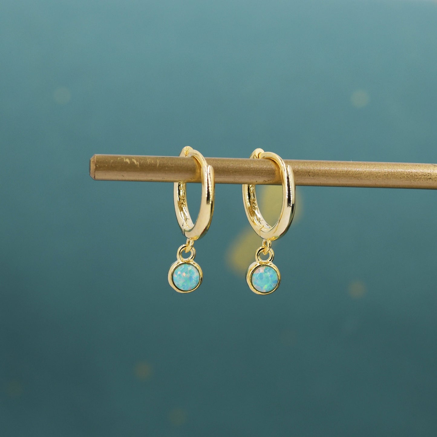 Sterling Silver Dangling 3mm Green Opal Hoop Earrings, Aqua Green Opal Charm Dangle Hoop Earrings, Silver or Gold, Lab Opal Hoops.