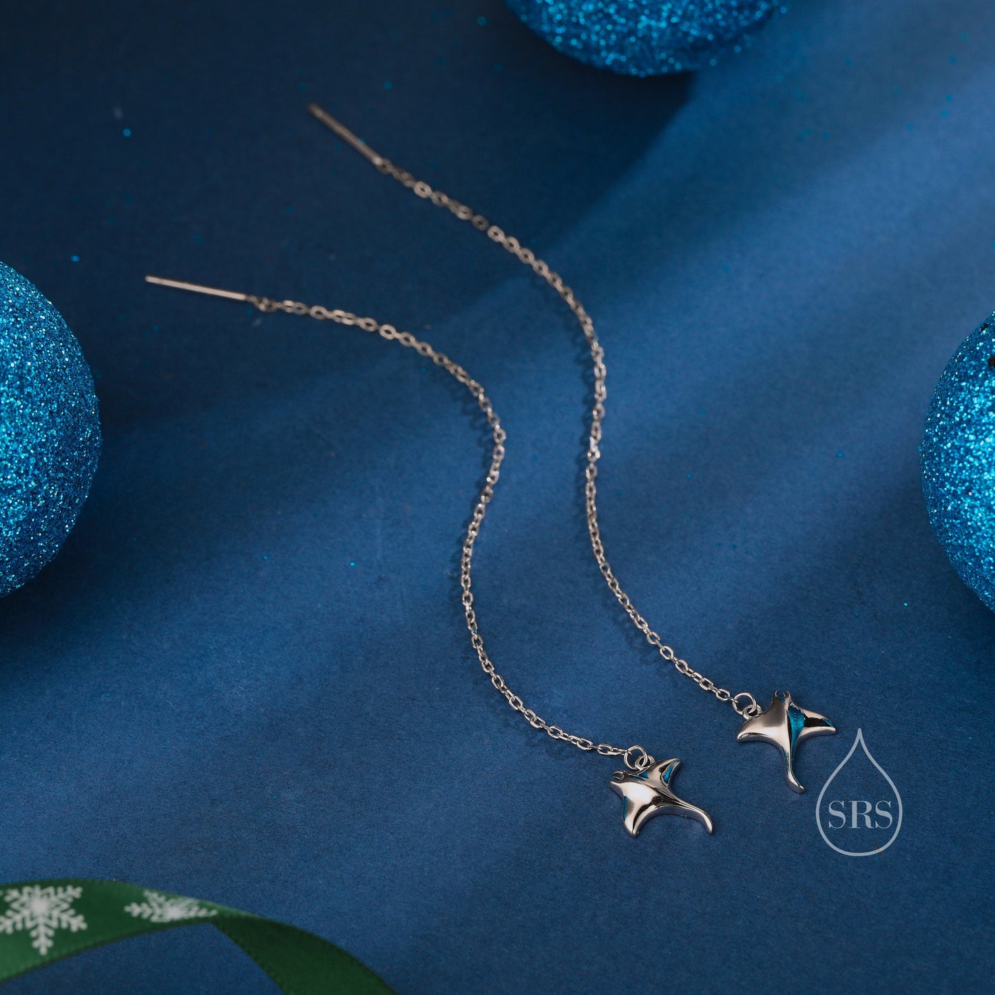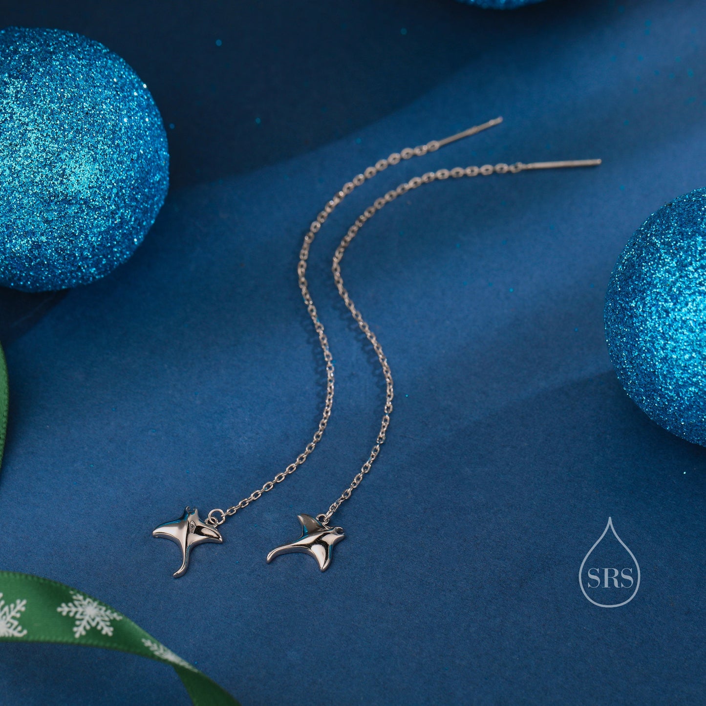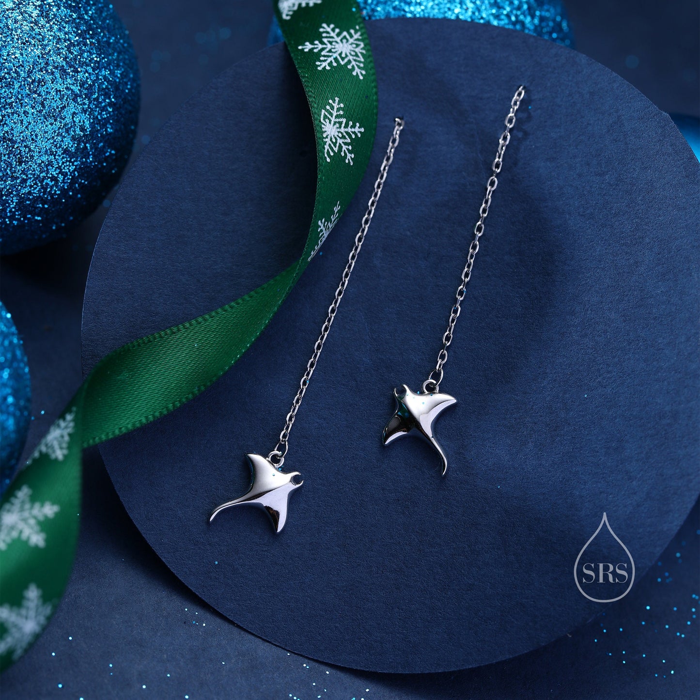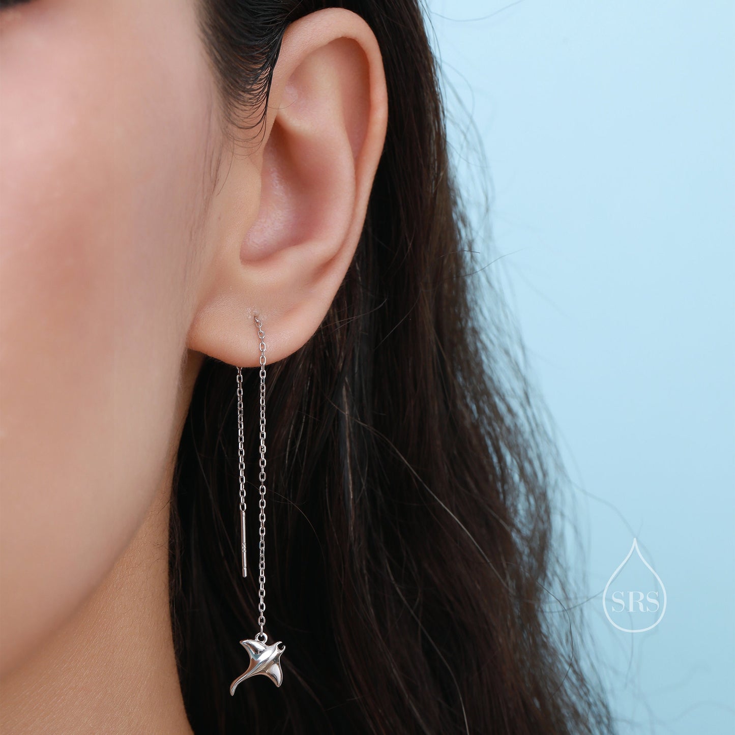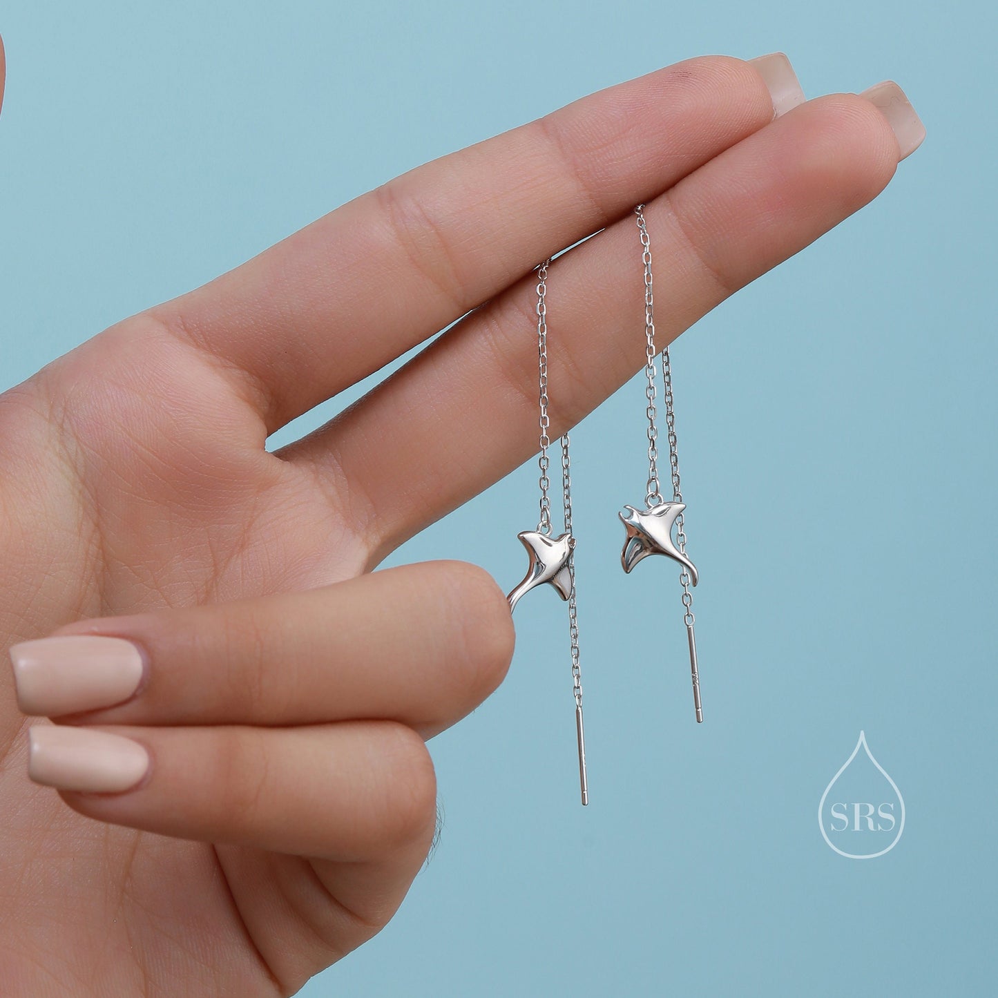 Sterling Silver Manta Ray Fish Long Ear Threaders, Stingray Threader Earrings, Dainty Fish Dangle Earrings