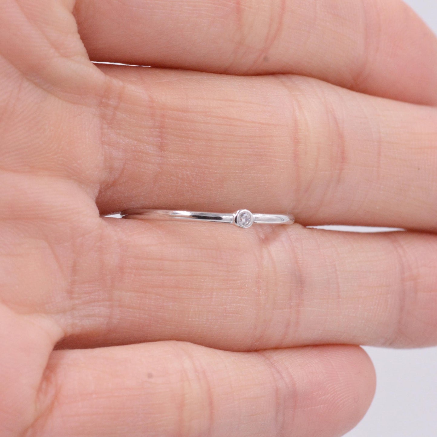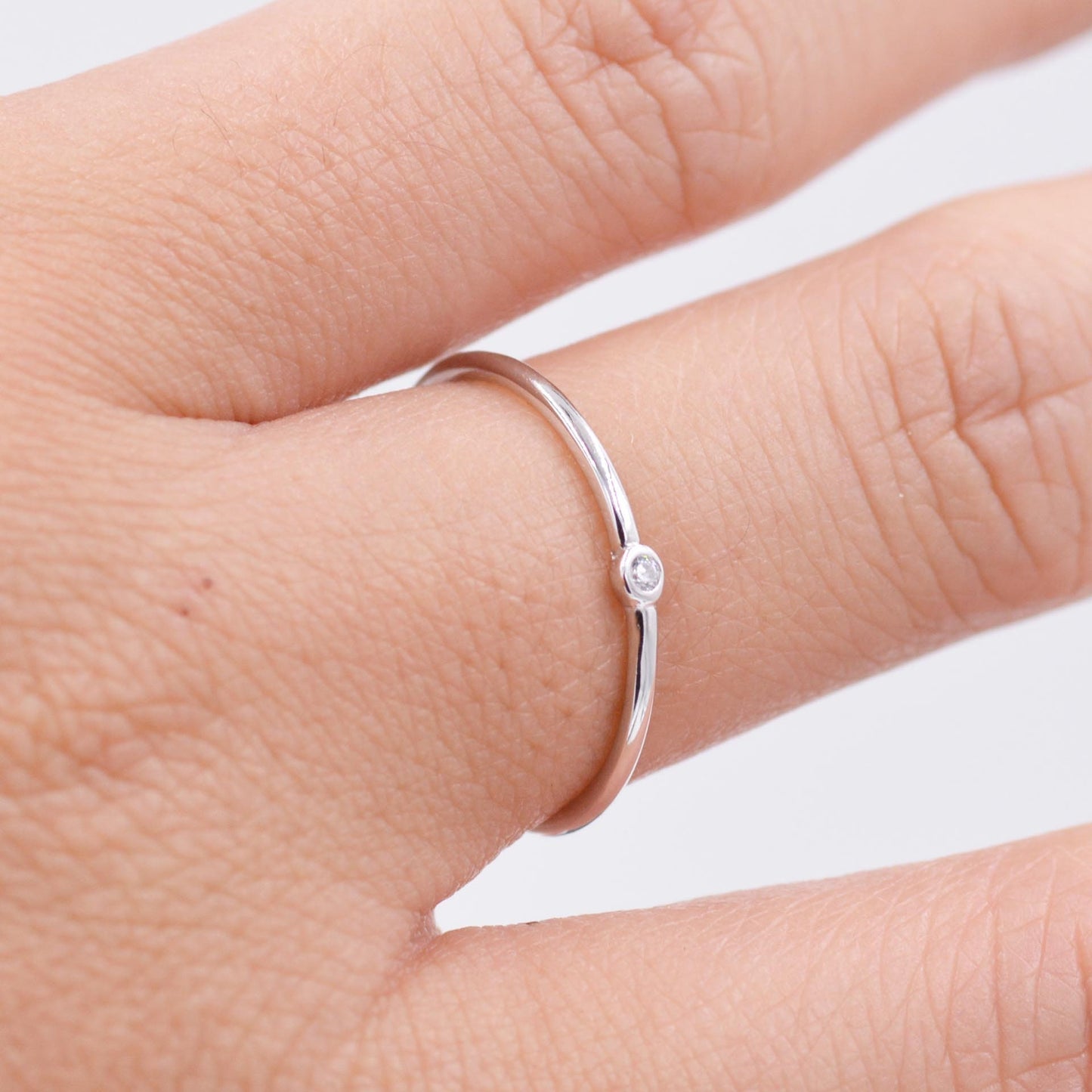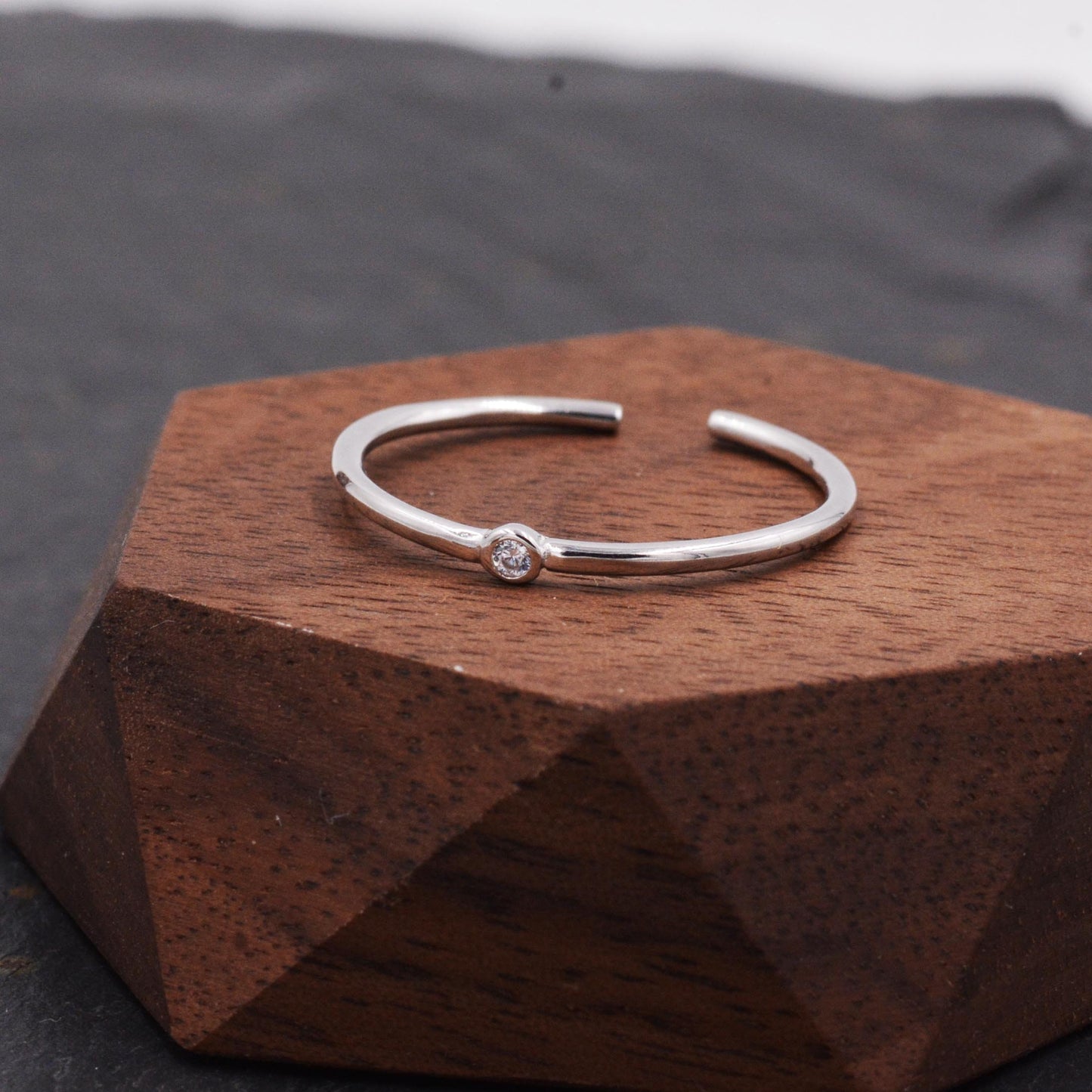 Sterling Silver Minimalist Skinny Ring, Stacking Ring, Single CZ Crystal, Simulated Diamond Ring. Adjustable Size. E94