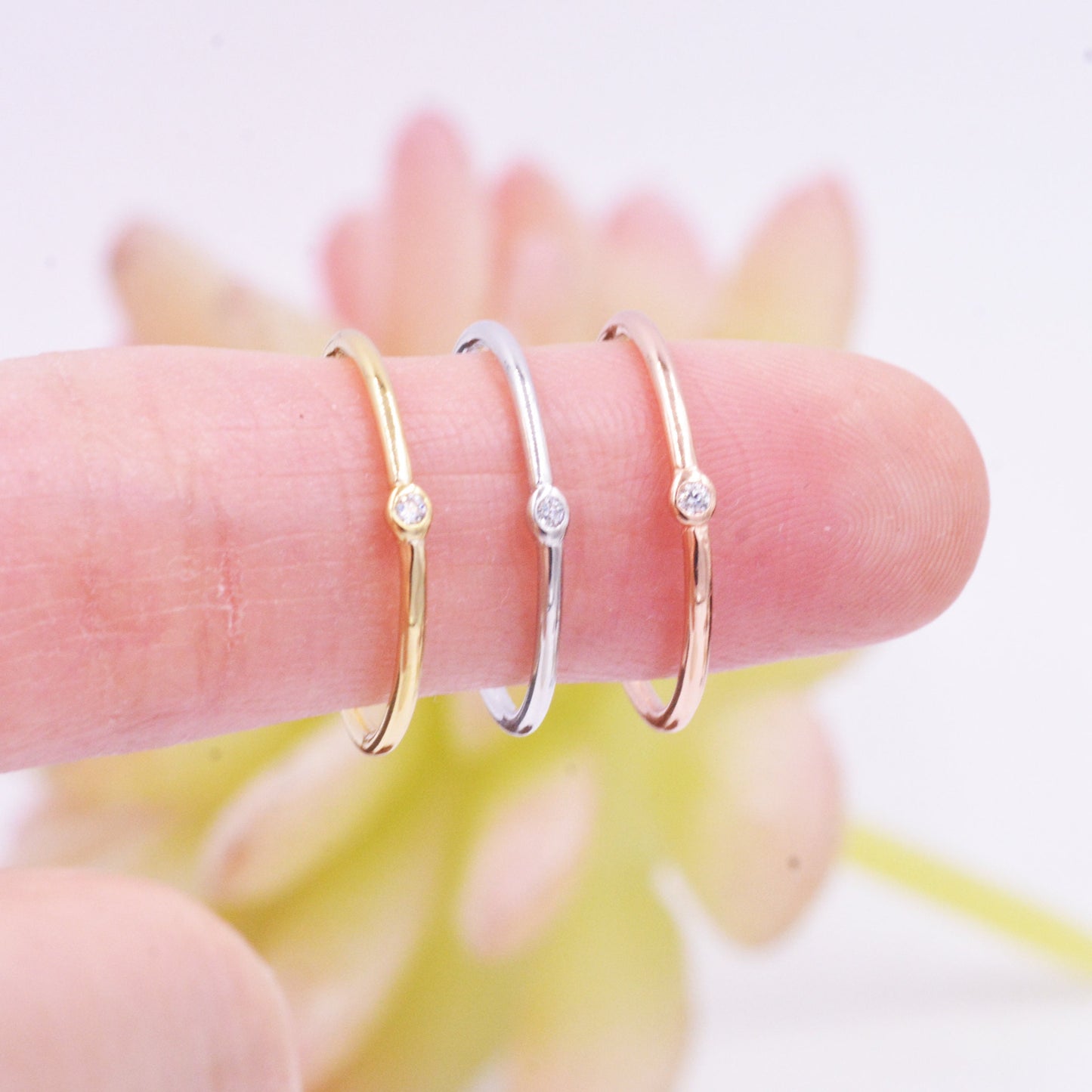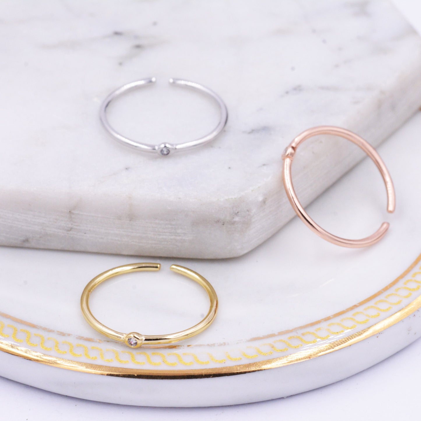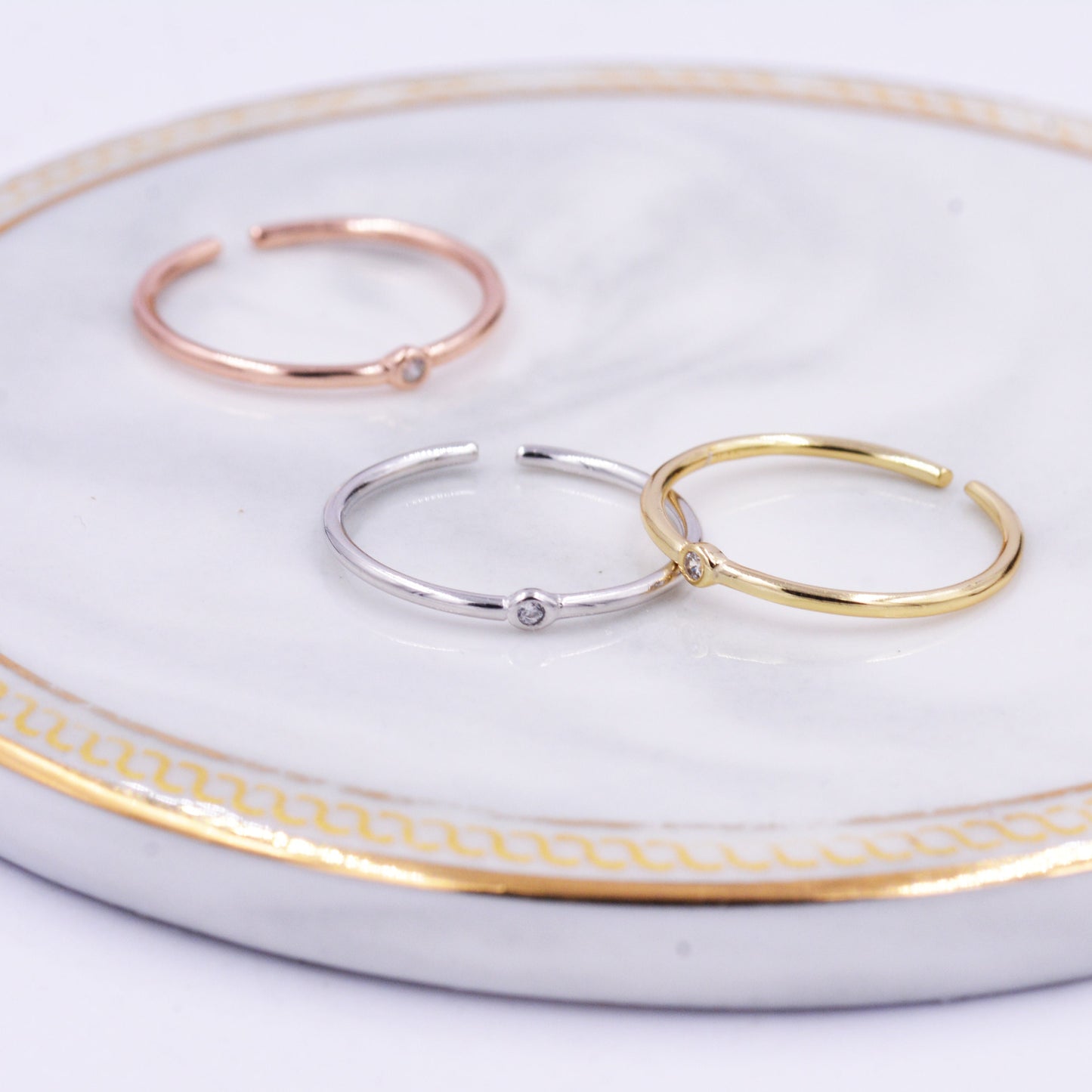 Sterling Silver Minimalist Skinny Ring, Stacking Ring, Single CZ Crystal, Simulated Diamond Ring. Adjustable Size. E94