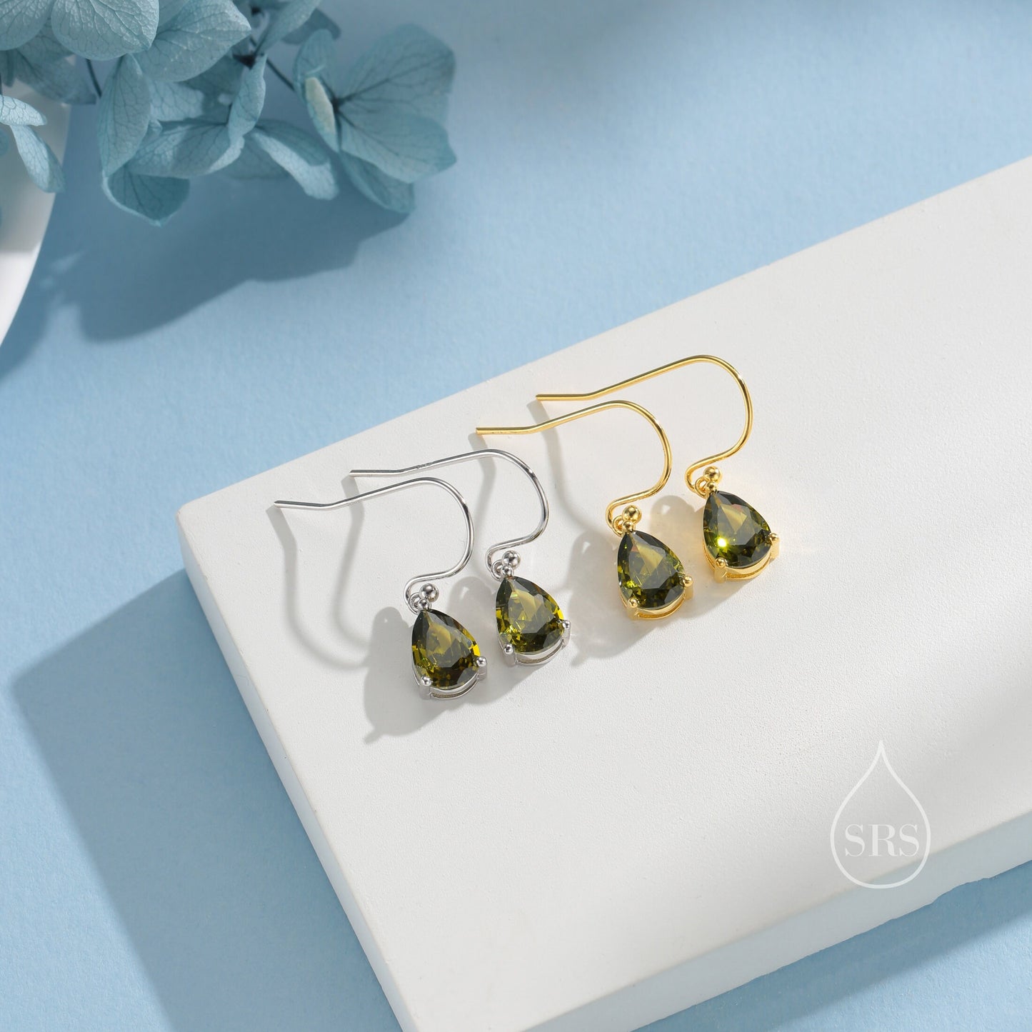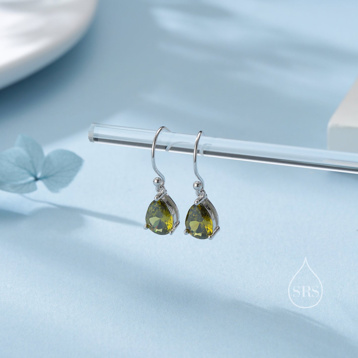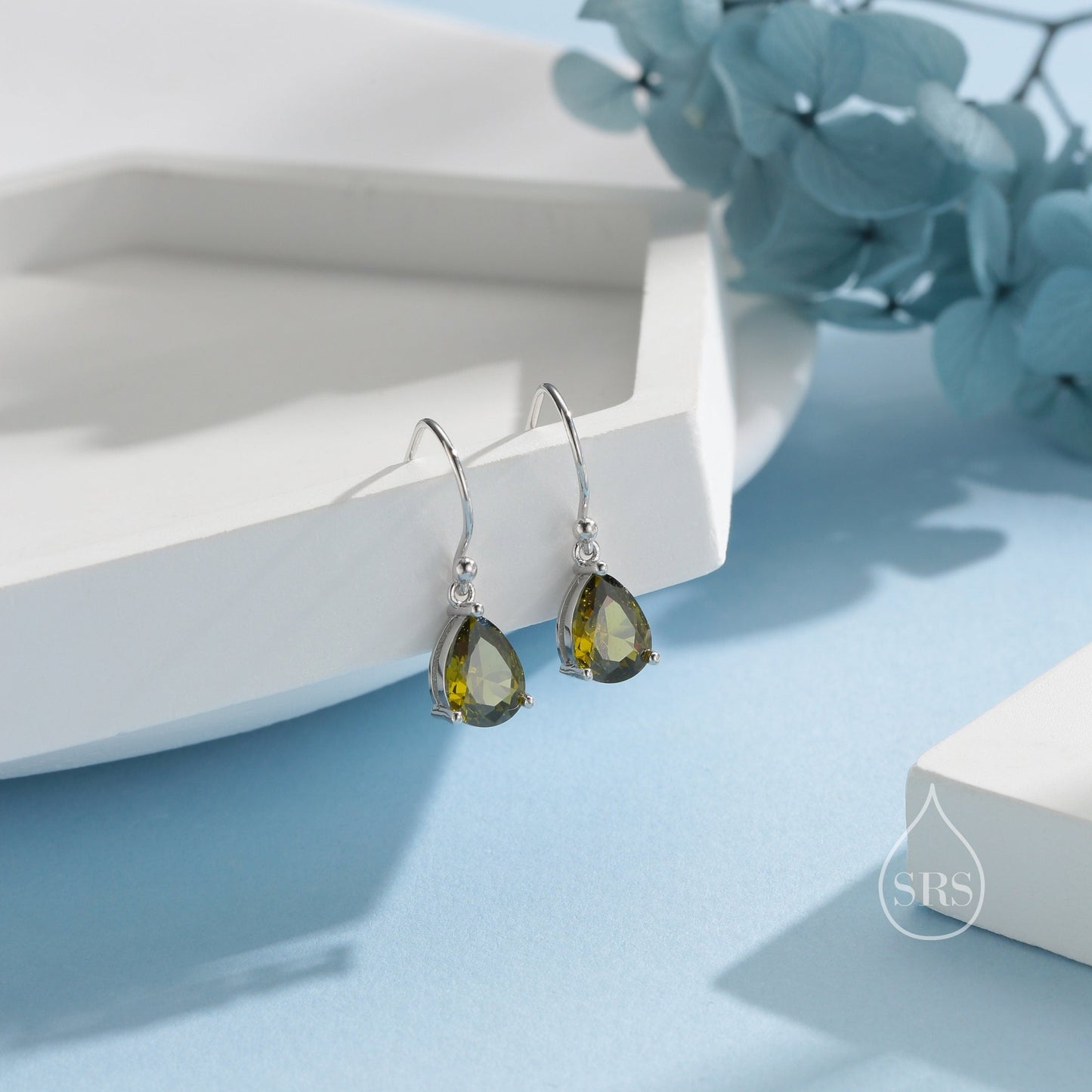 Sterling Silver Olive Green CZ Droplet Drop Earrings in Sterling Silver, Silver or Gold, Pear Shape Cubic Zirconia Hook Earrings