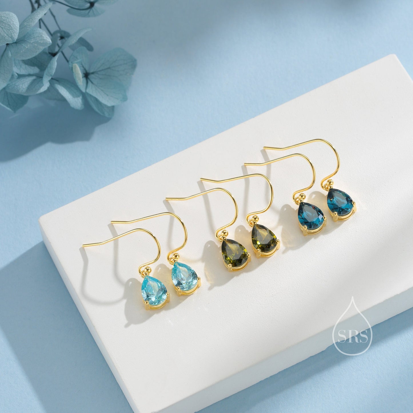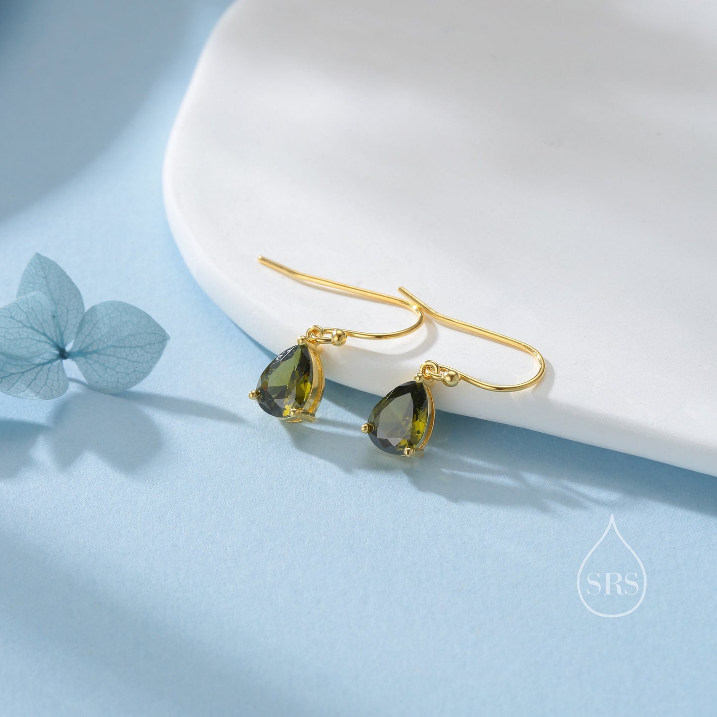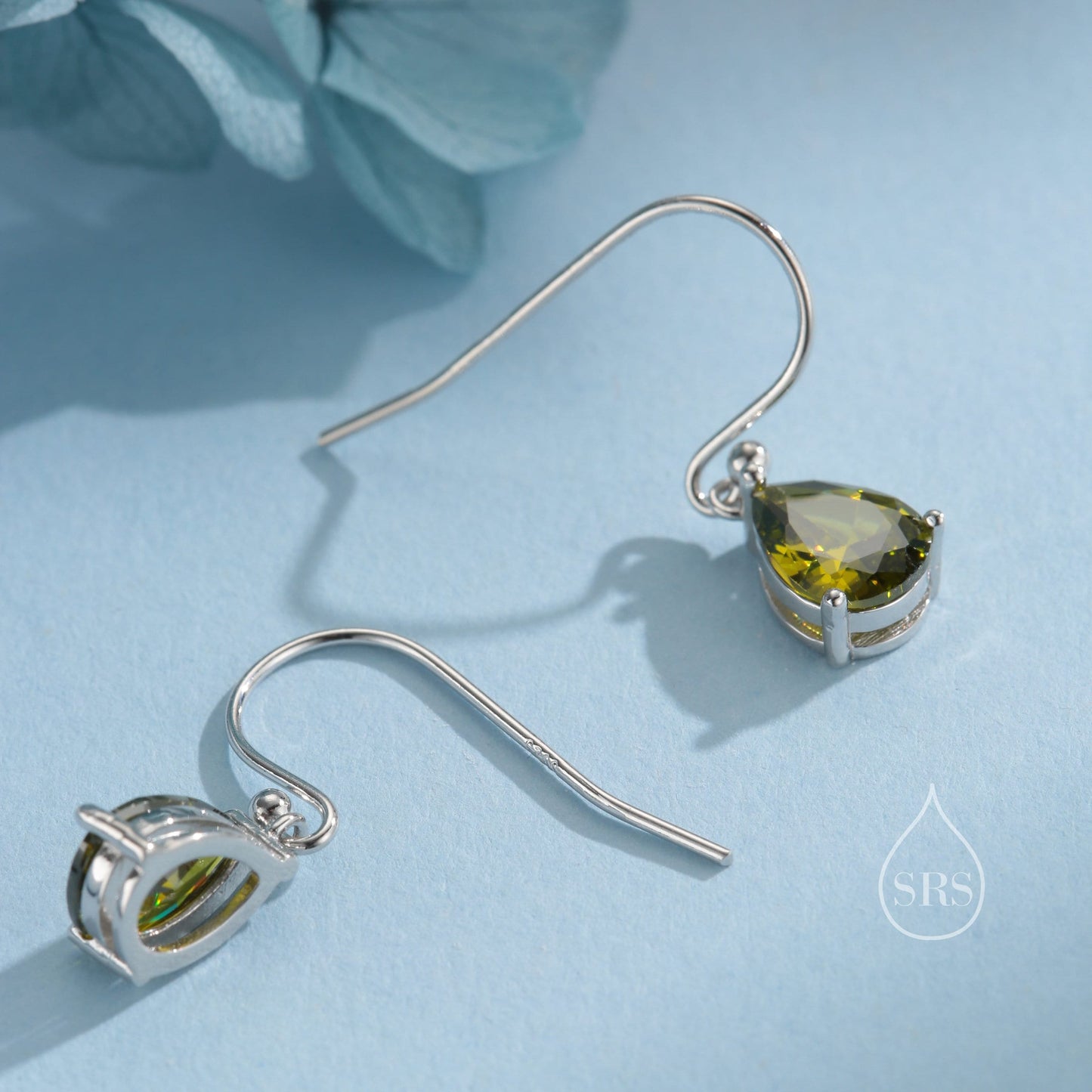 Sterling Silver Olive Green CZ Droplet Drop Earrings in Sterling Silver, Silver or Gold, Pear Shape Cubic Zirconia Hook Earrings
