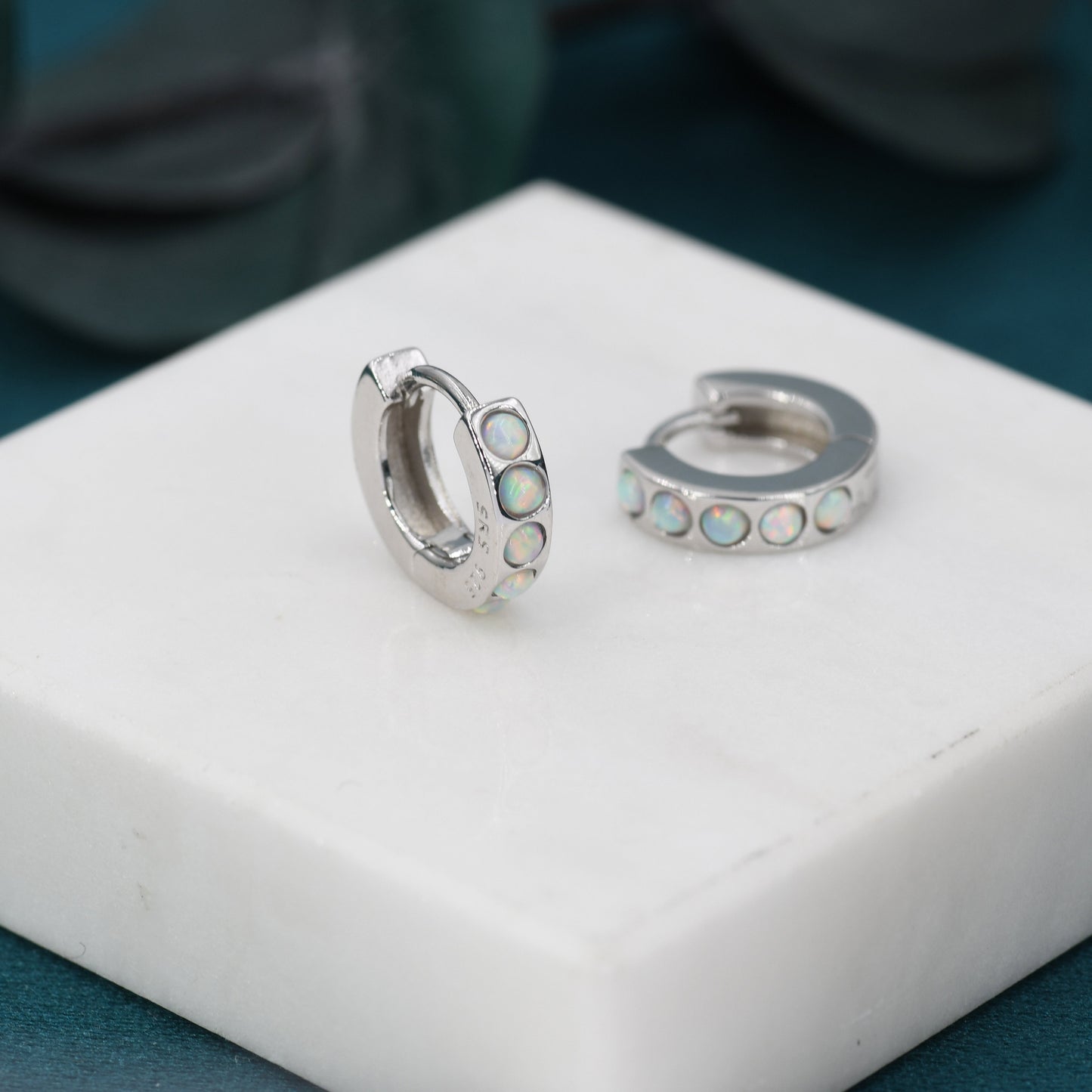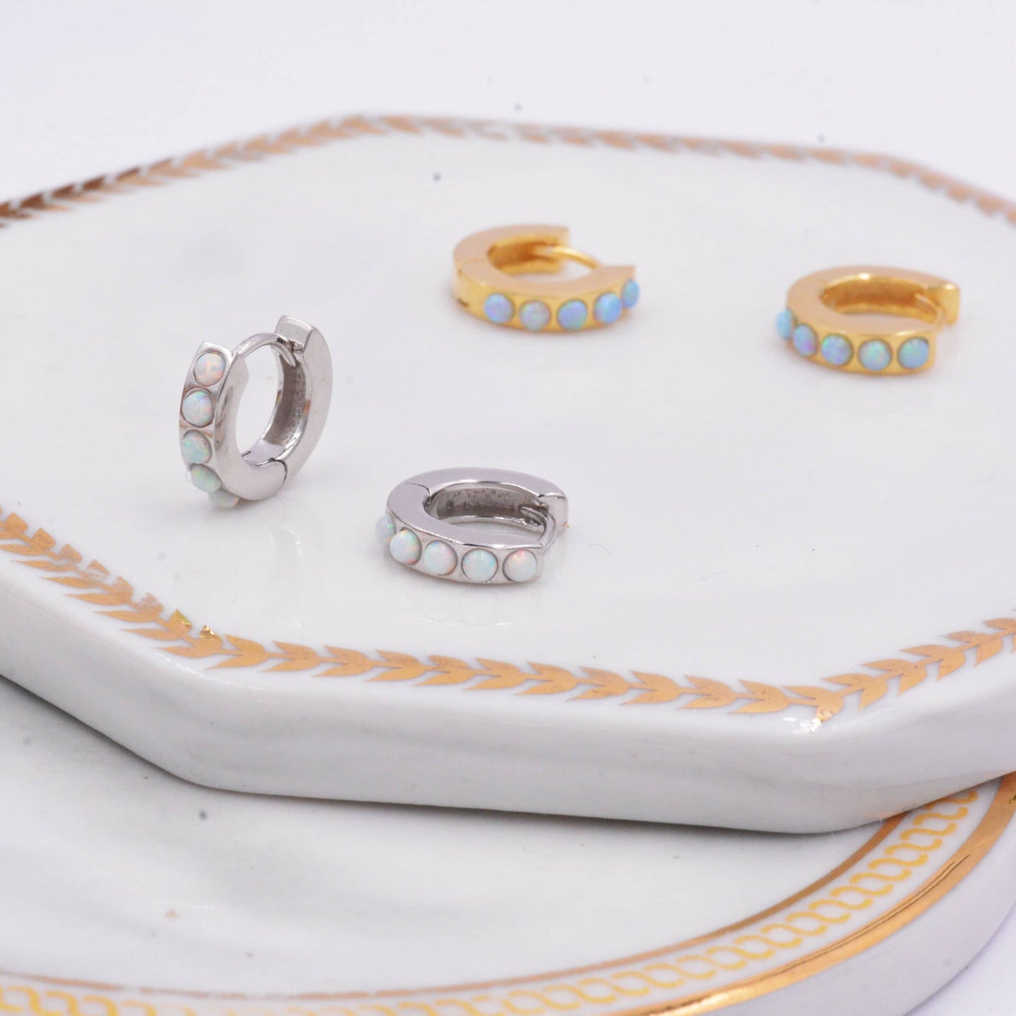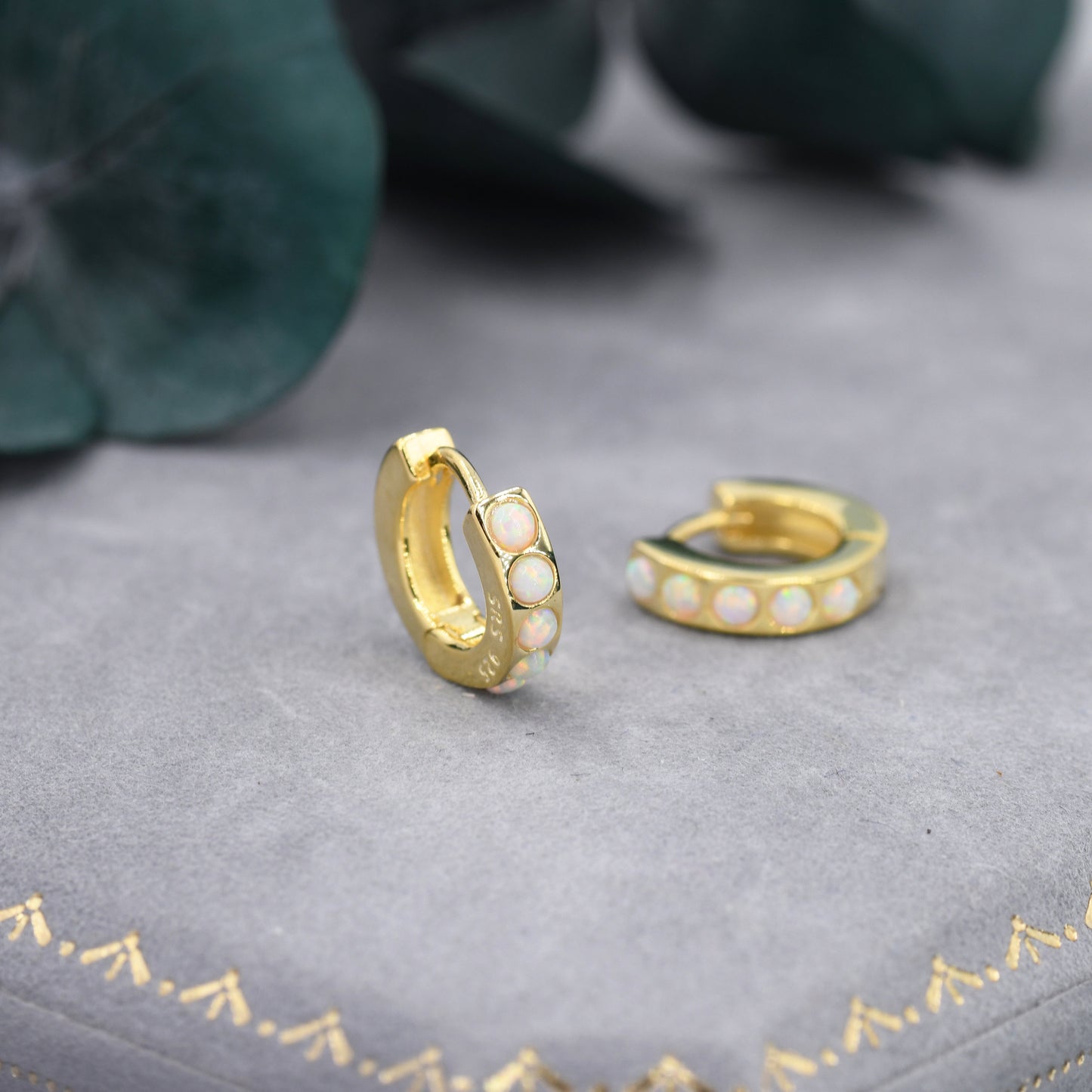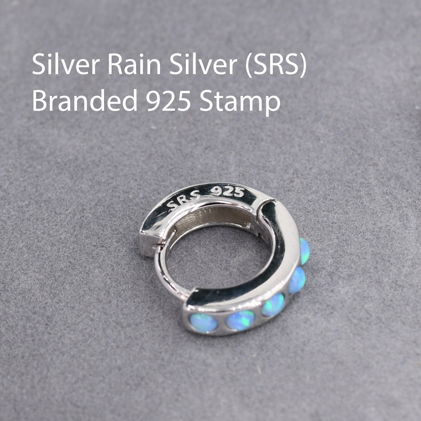 Each hoop has 5 tiny opal cabochons at the front of the hoop, the back of the hoop is plain. The stones are high quality opal stones lab created in Japan.