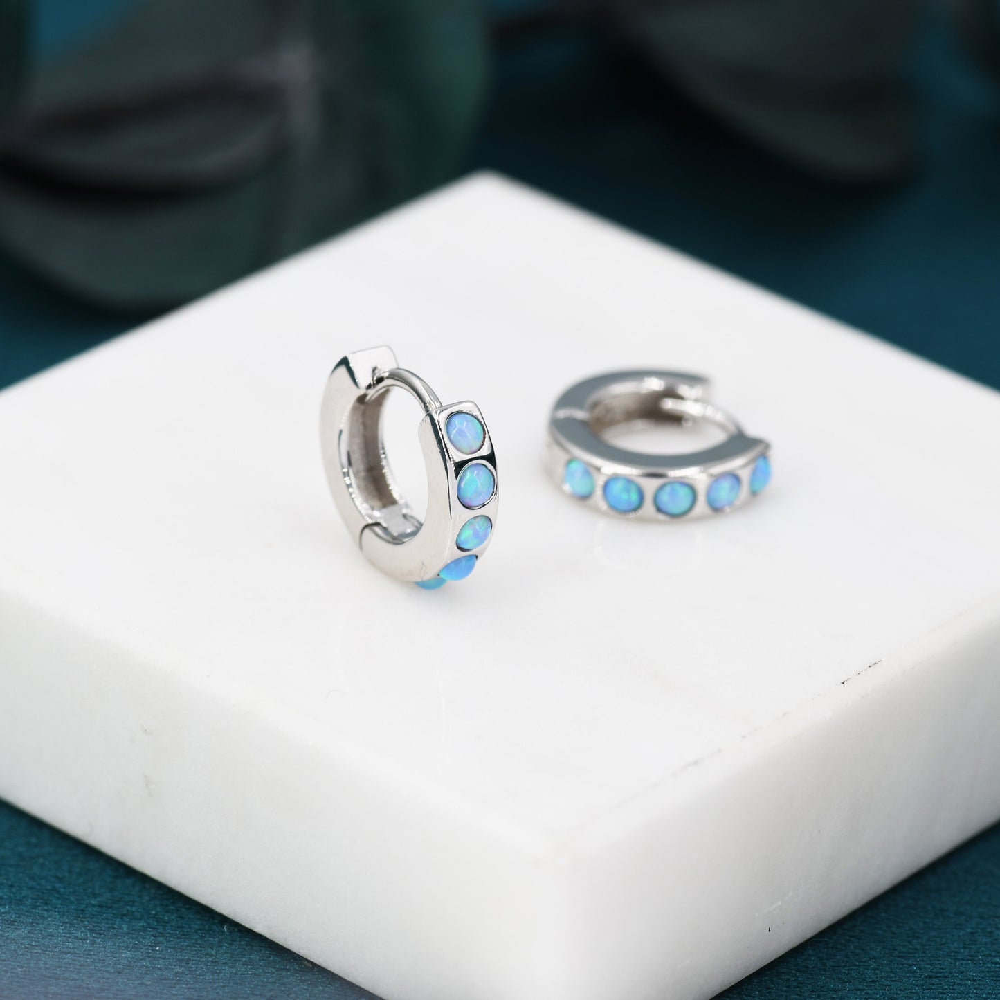 Sterling Silver Opal Huggie Hoop Earrings, Blue and White Opal, Minimalist Geometric Hoop Earrings .