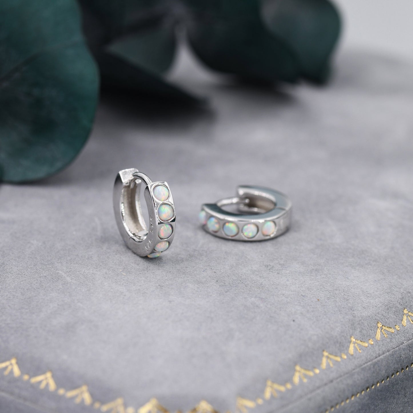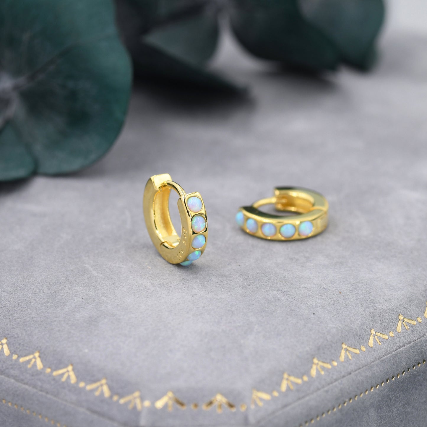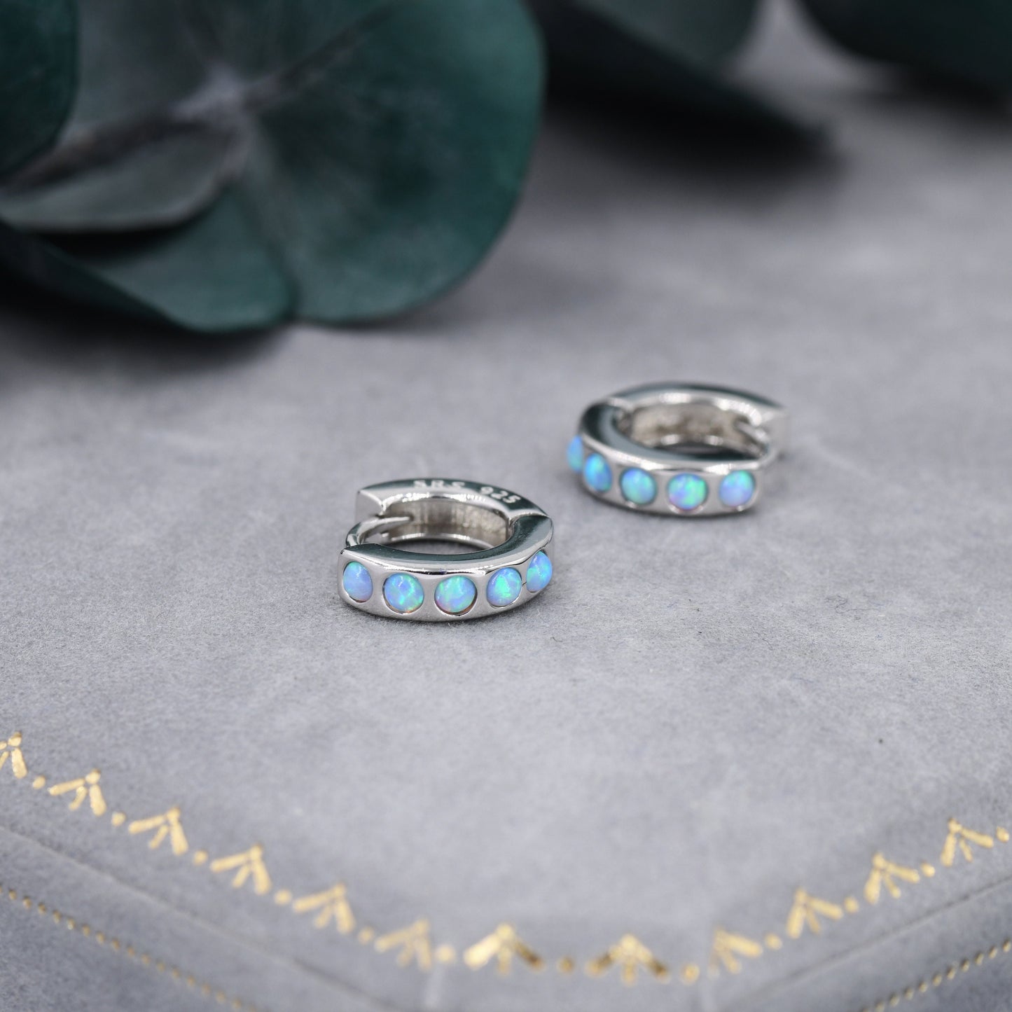 Each hoop has 5 tiny opal cabochons at the front of the hoop, the back of the hoop is plain. The stones are high quality opal stones lab created in Japan.