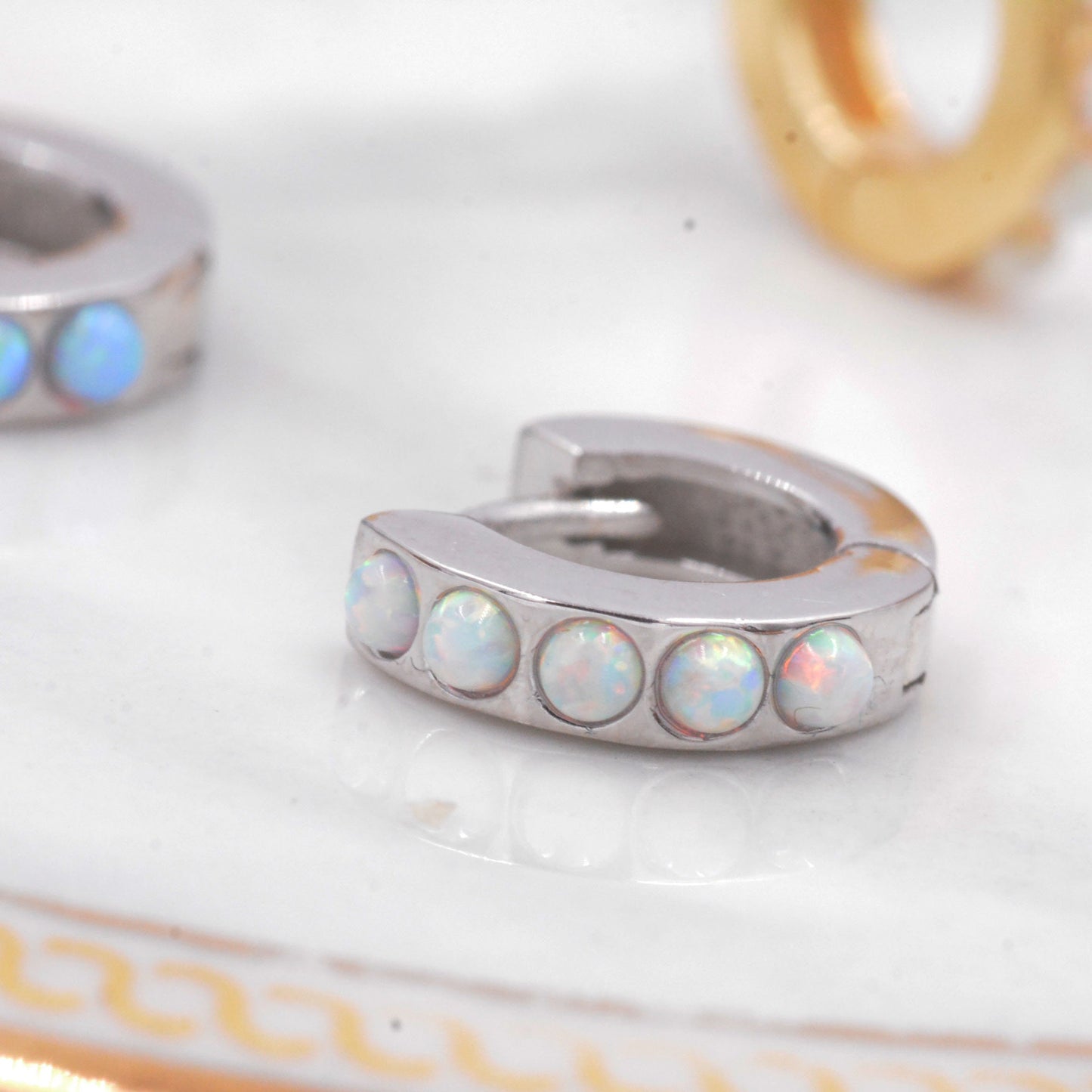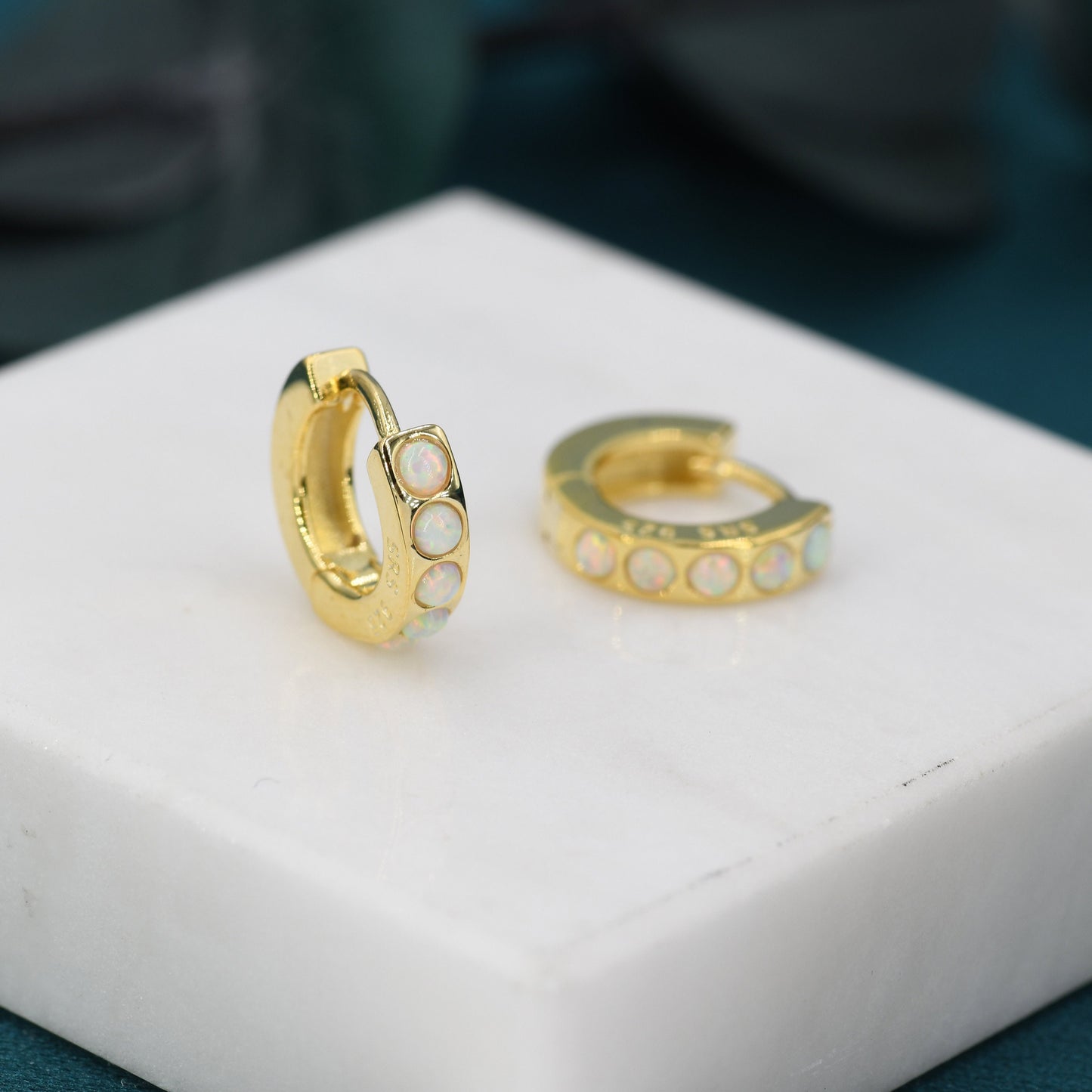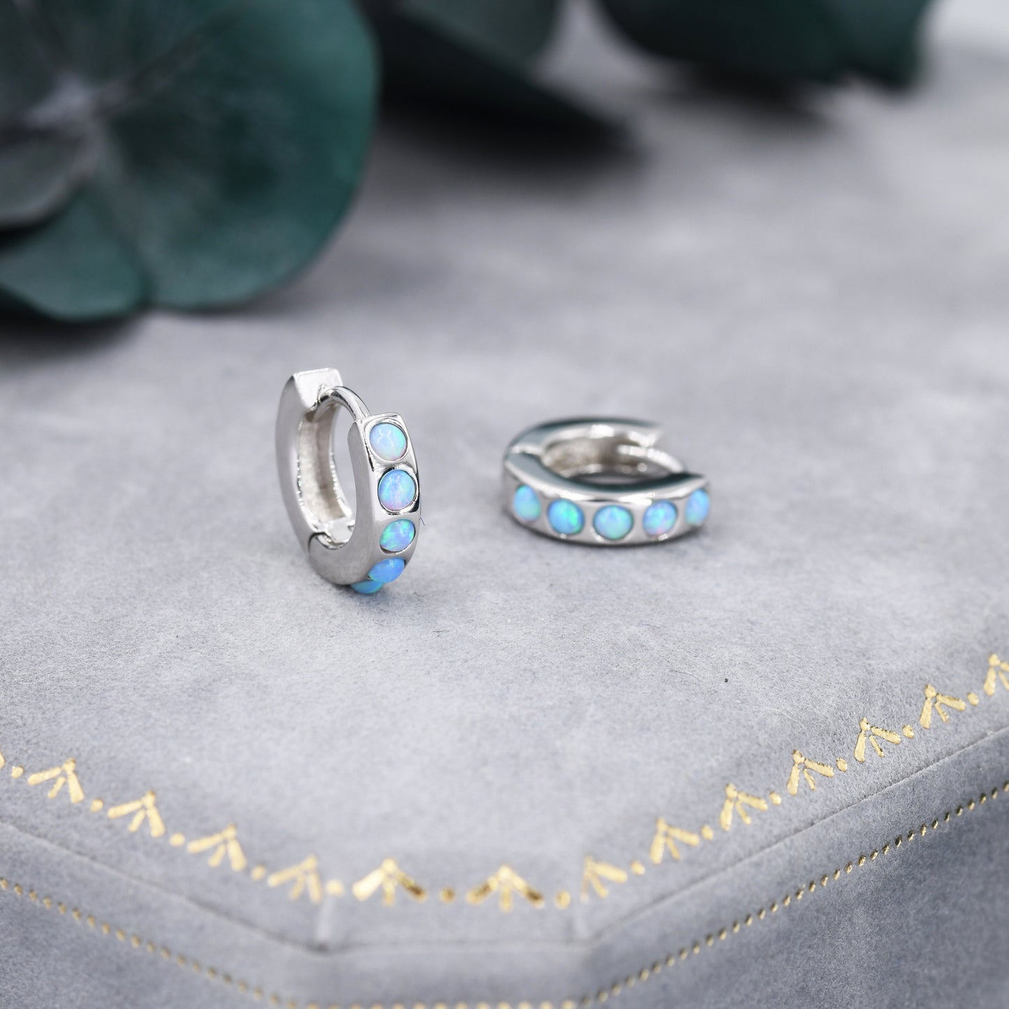 Each hoop has 5 tiny opal cabochons at the front of the hoop, the back of the hoop is plain. The stones are high quality opal stones lab created in Japan.