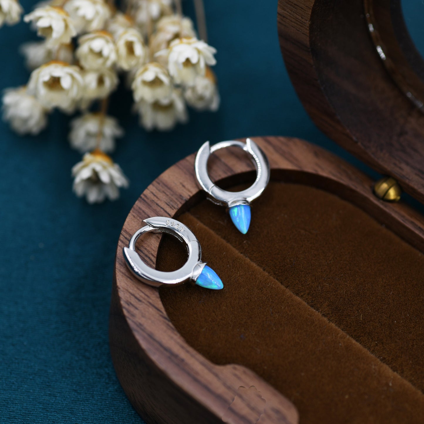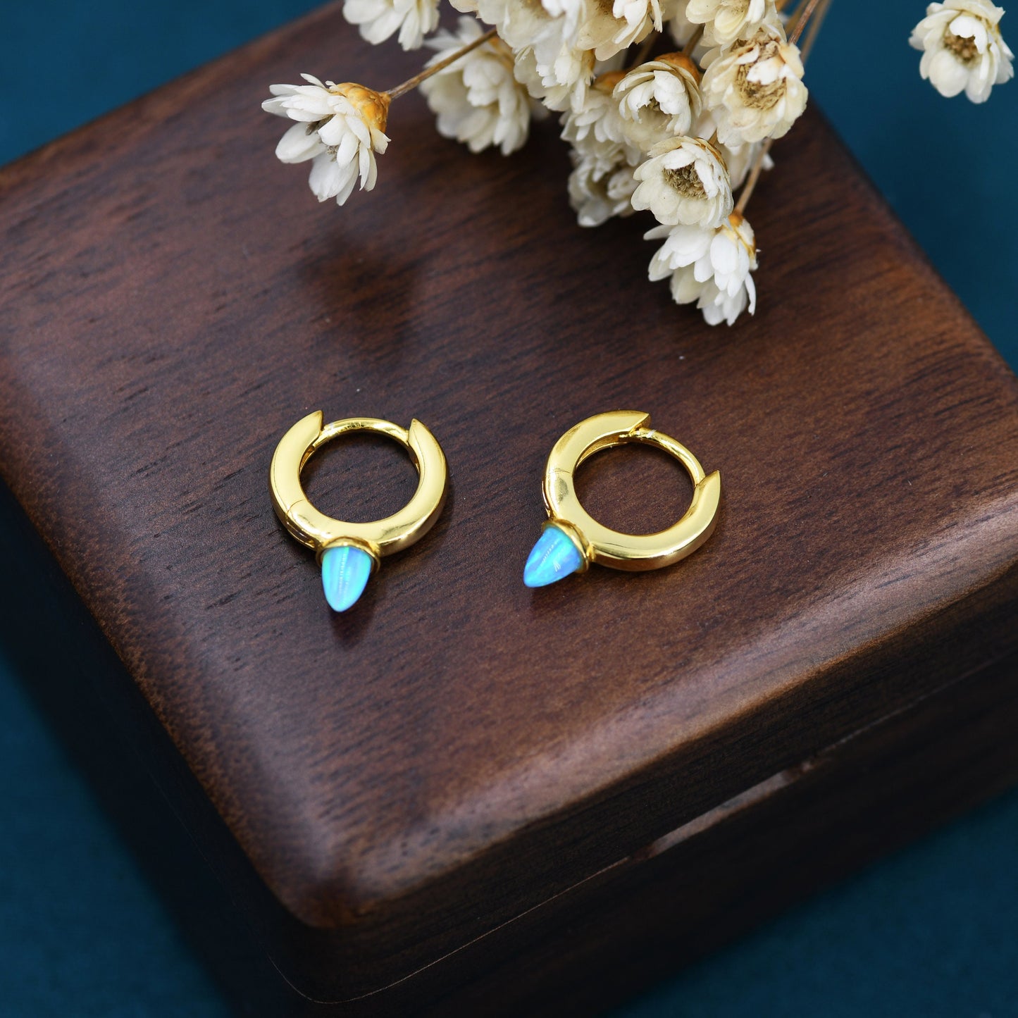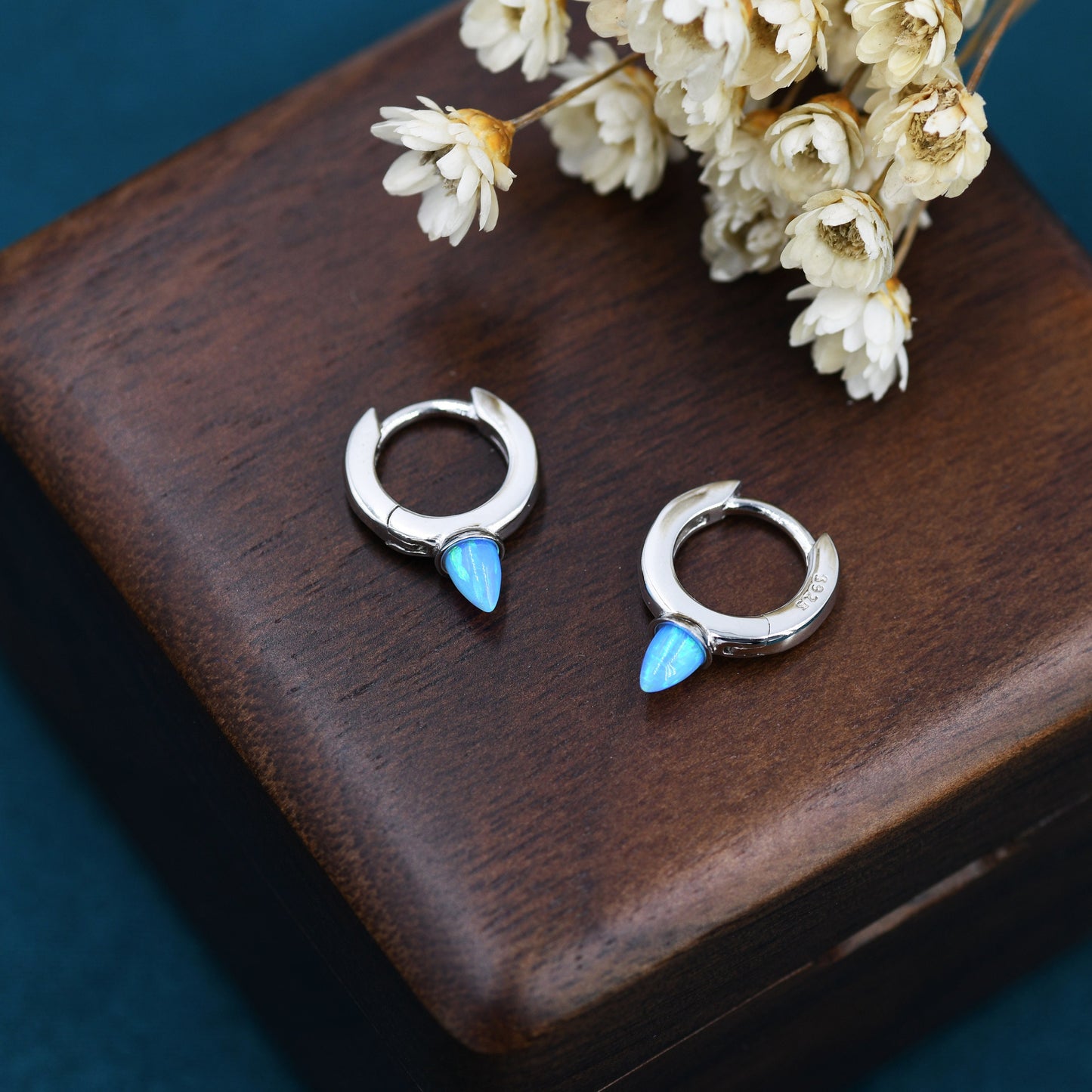 Sterling Silver Opal Spike Huggie Hoop Earrings, Blue and White Opal, Gold or Silver Minimalist Geometric Hoop Earrings