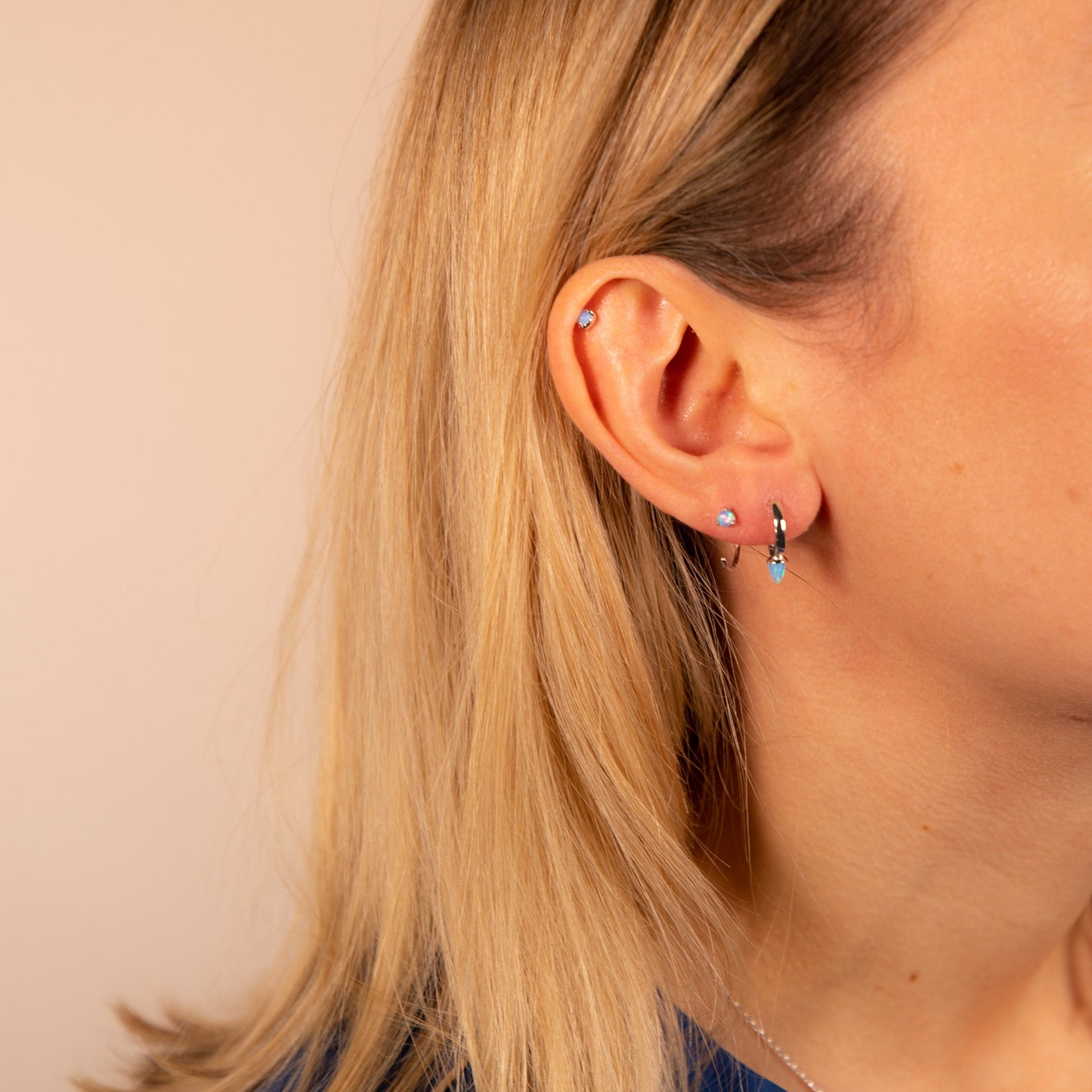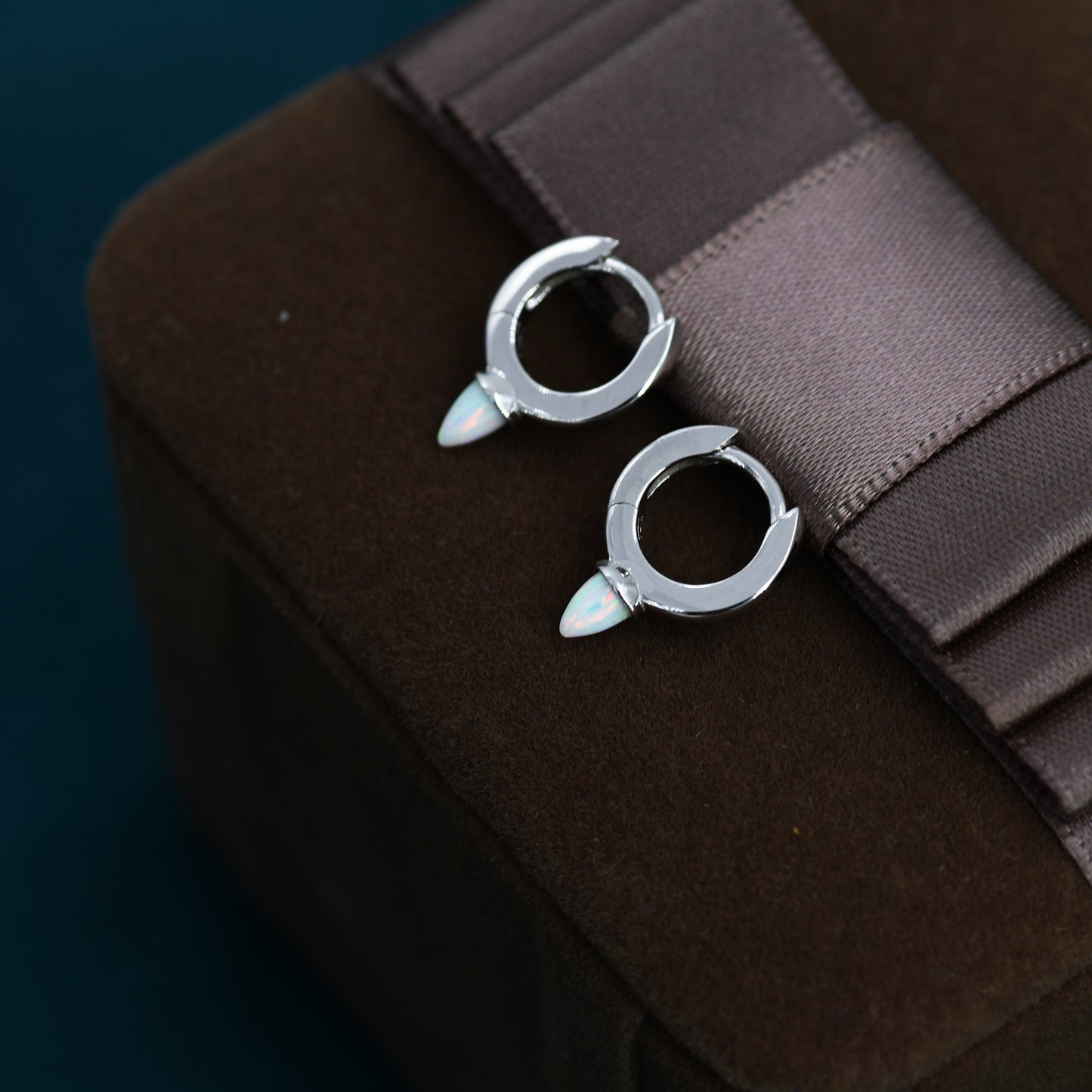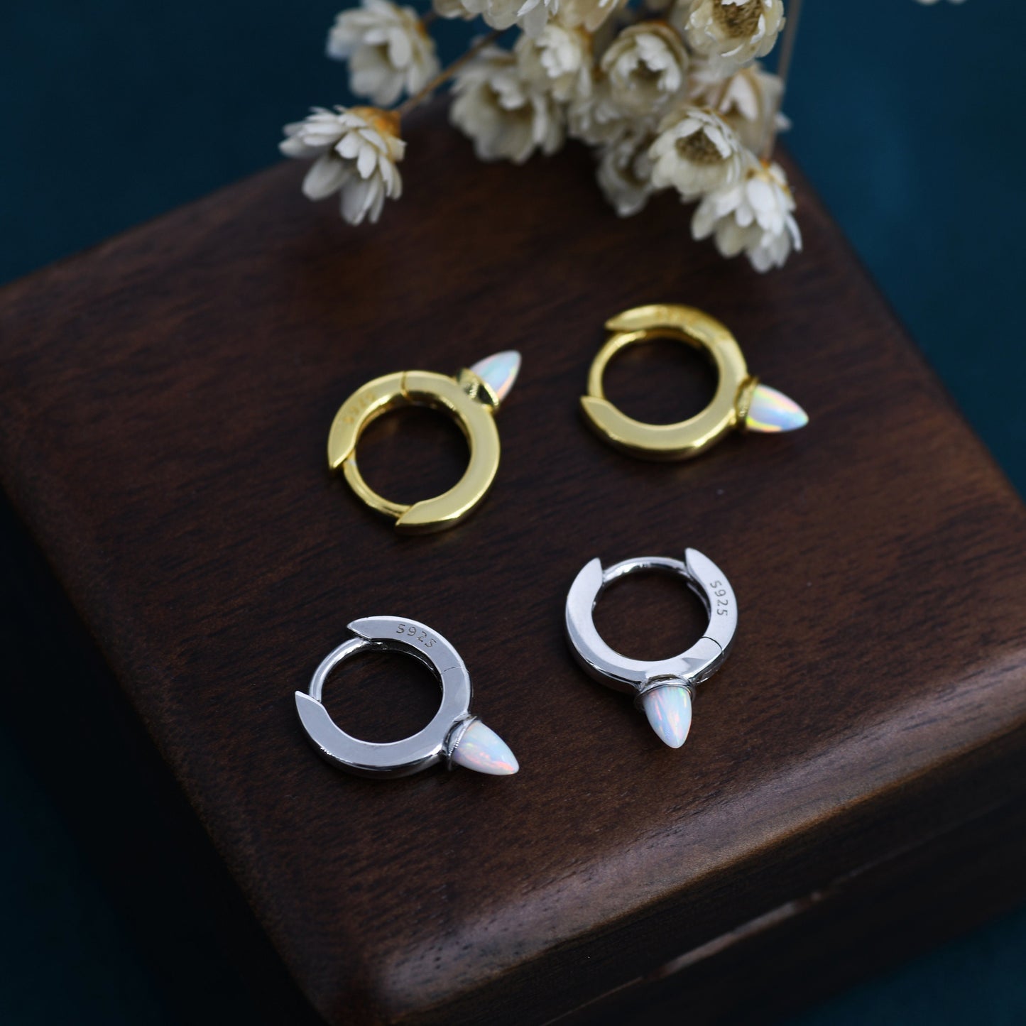 Sterling Silver Opal Spike Huggie Hoop Earrings, Blue and White Opal, Gold or Silver Minimalist Geometric Hoop Earrings