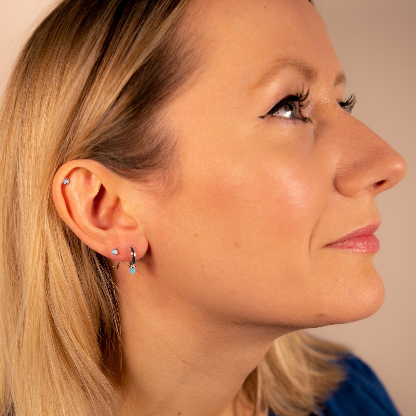 Sterling Silver Opal Huggie Hoop Earrings, Blue and White Opal, Minimalist Geometric Hoop Earrings .