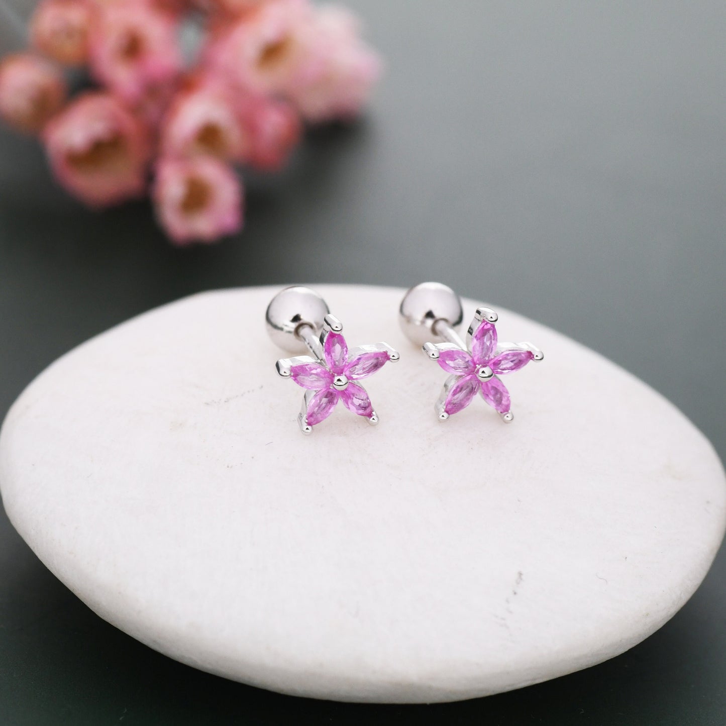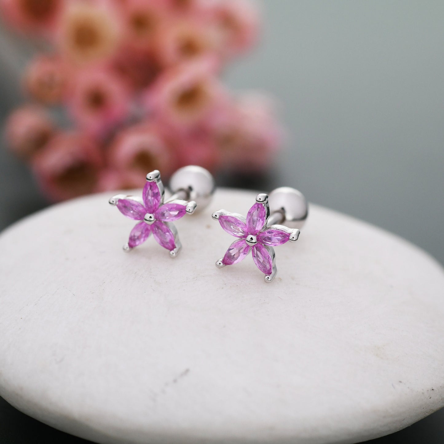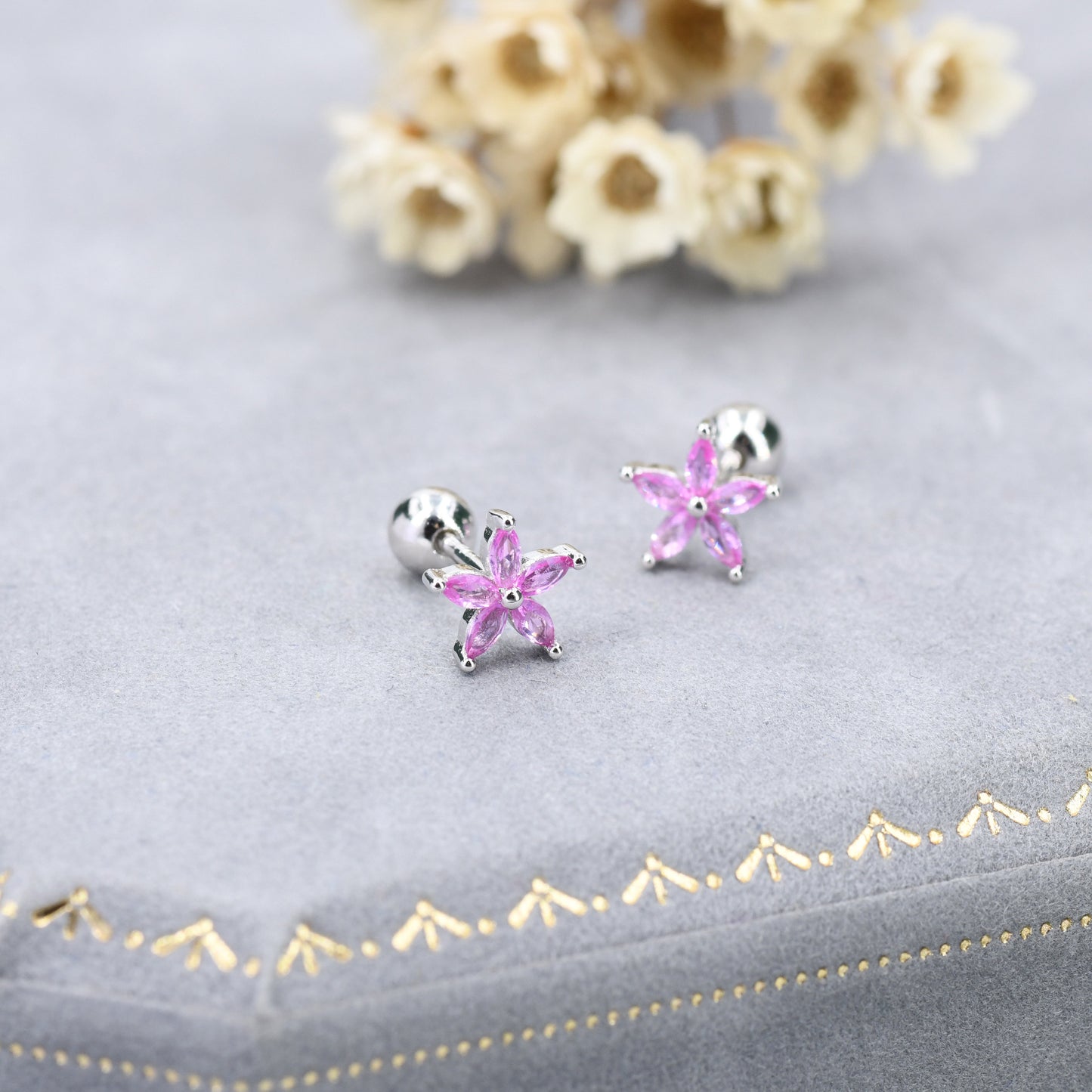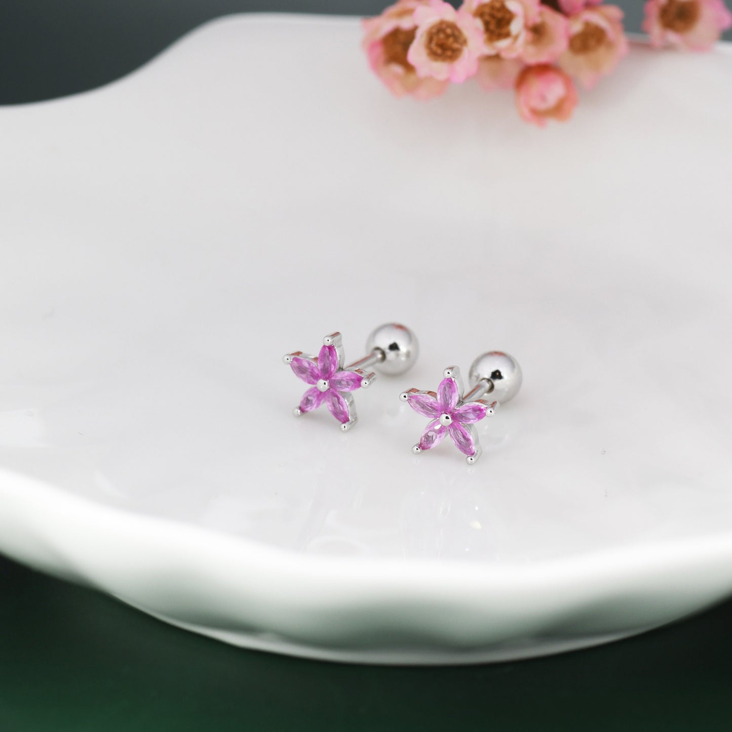 Sterling Silver Pink CZ Flower Barbell Earrings, Marquise CZ Screw Back Earrings, Stacking Earrings