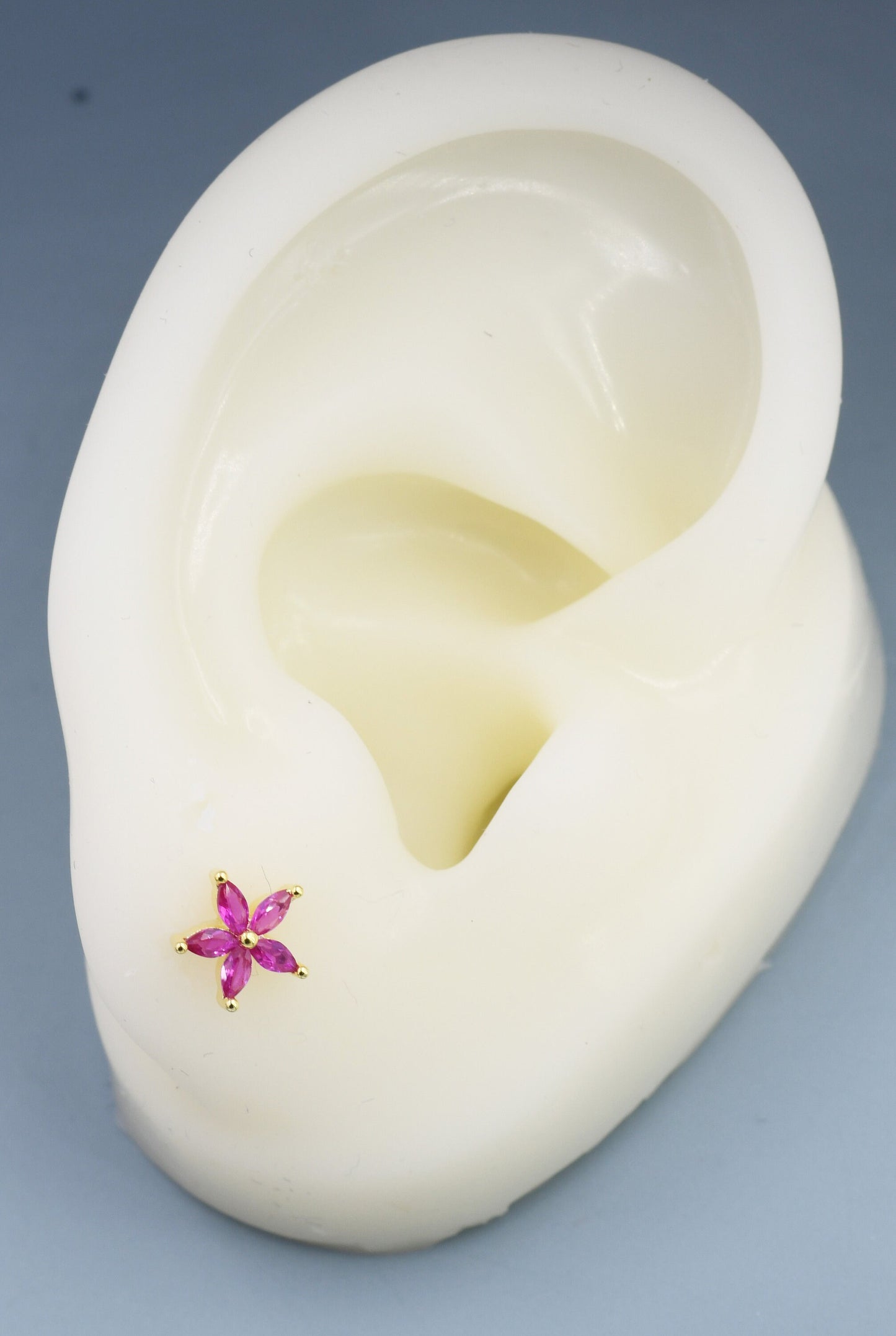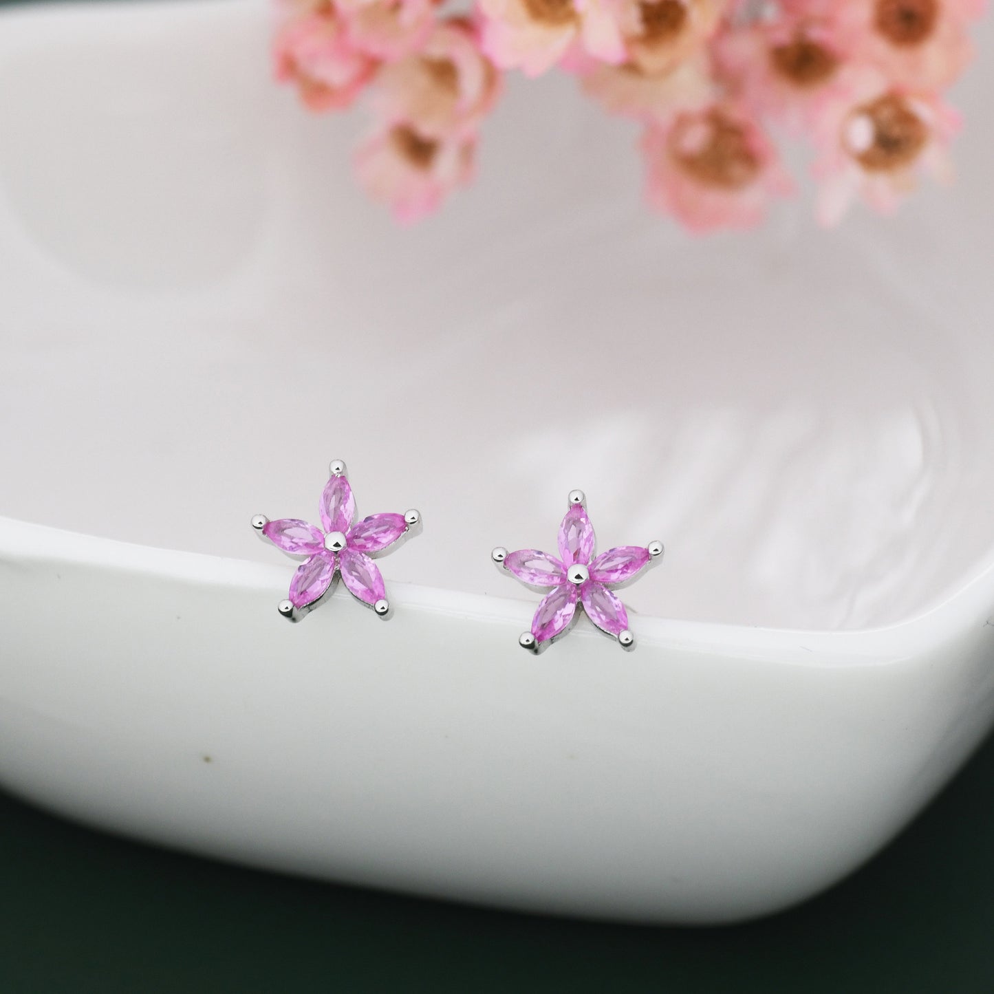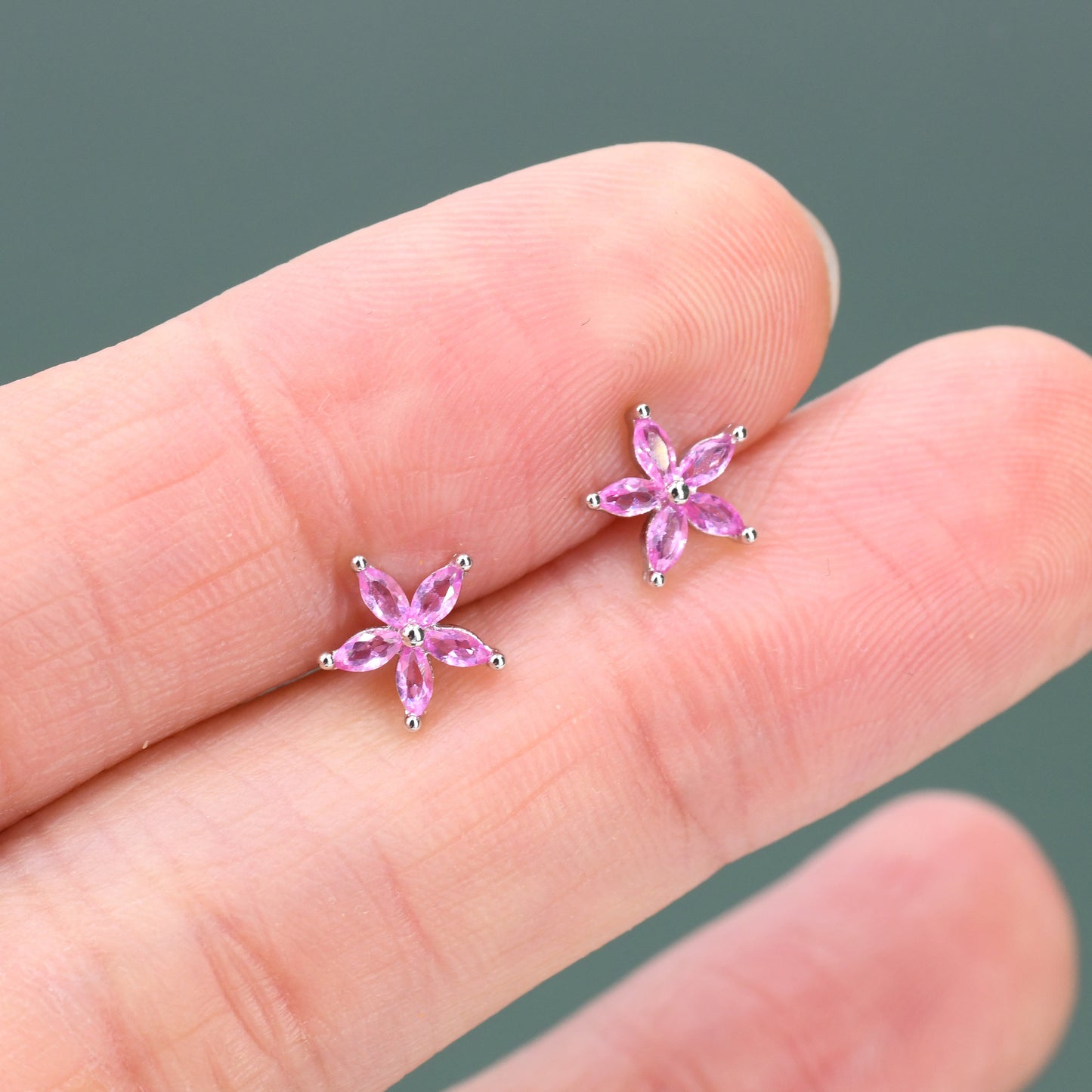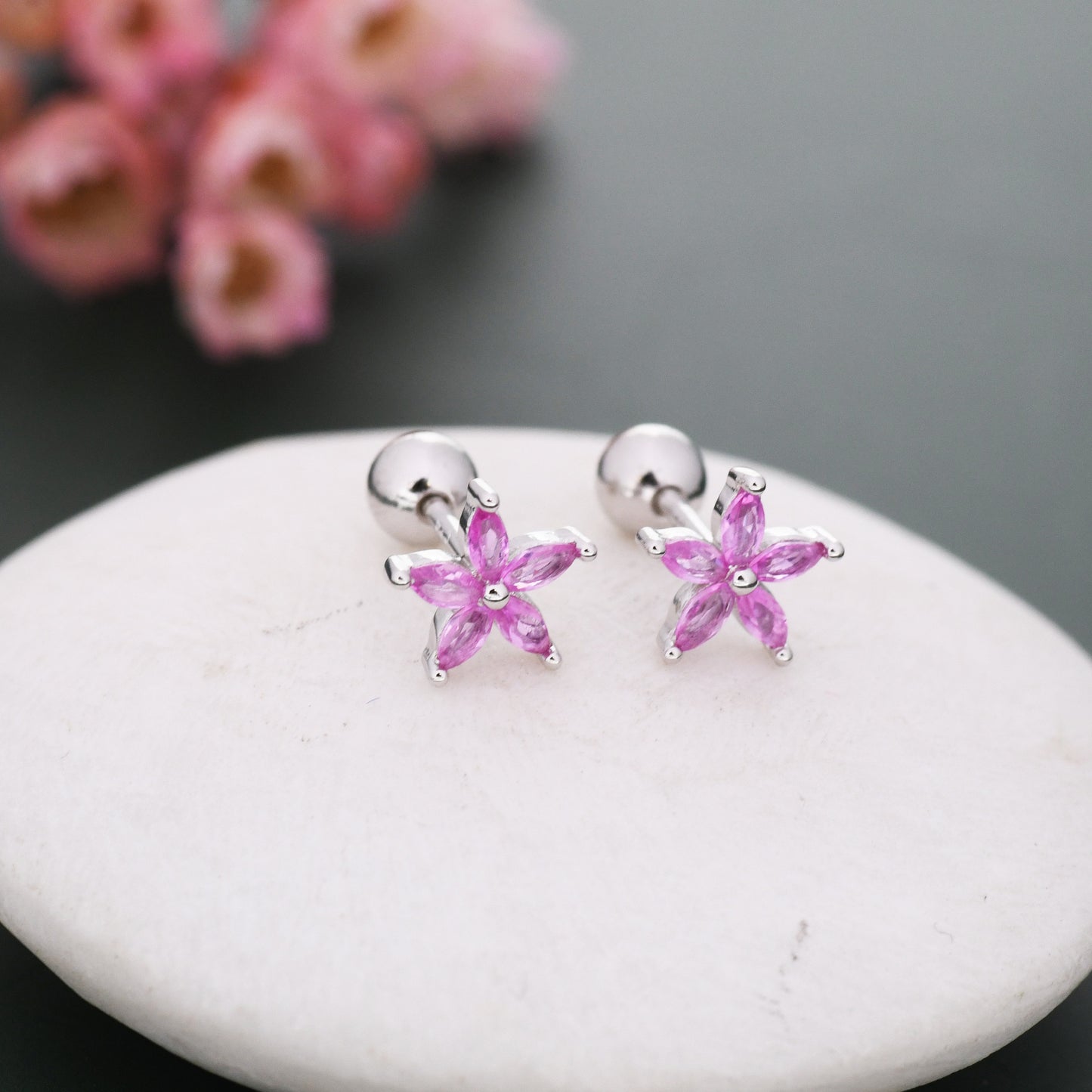 Sterling Silver Pink CZ Flower Barbell Earrings, Marquise CZ Screw Back Earrings, Stacking Earrings