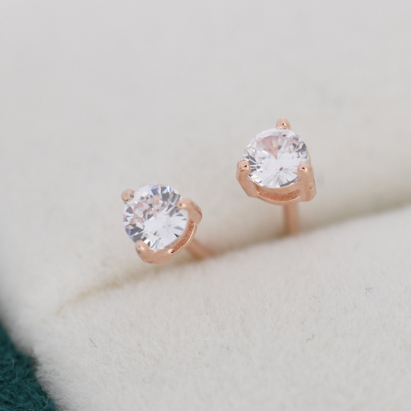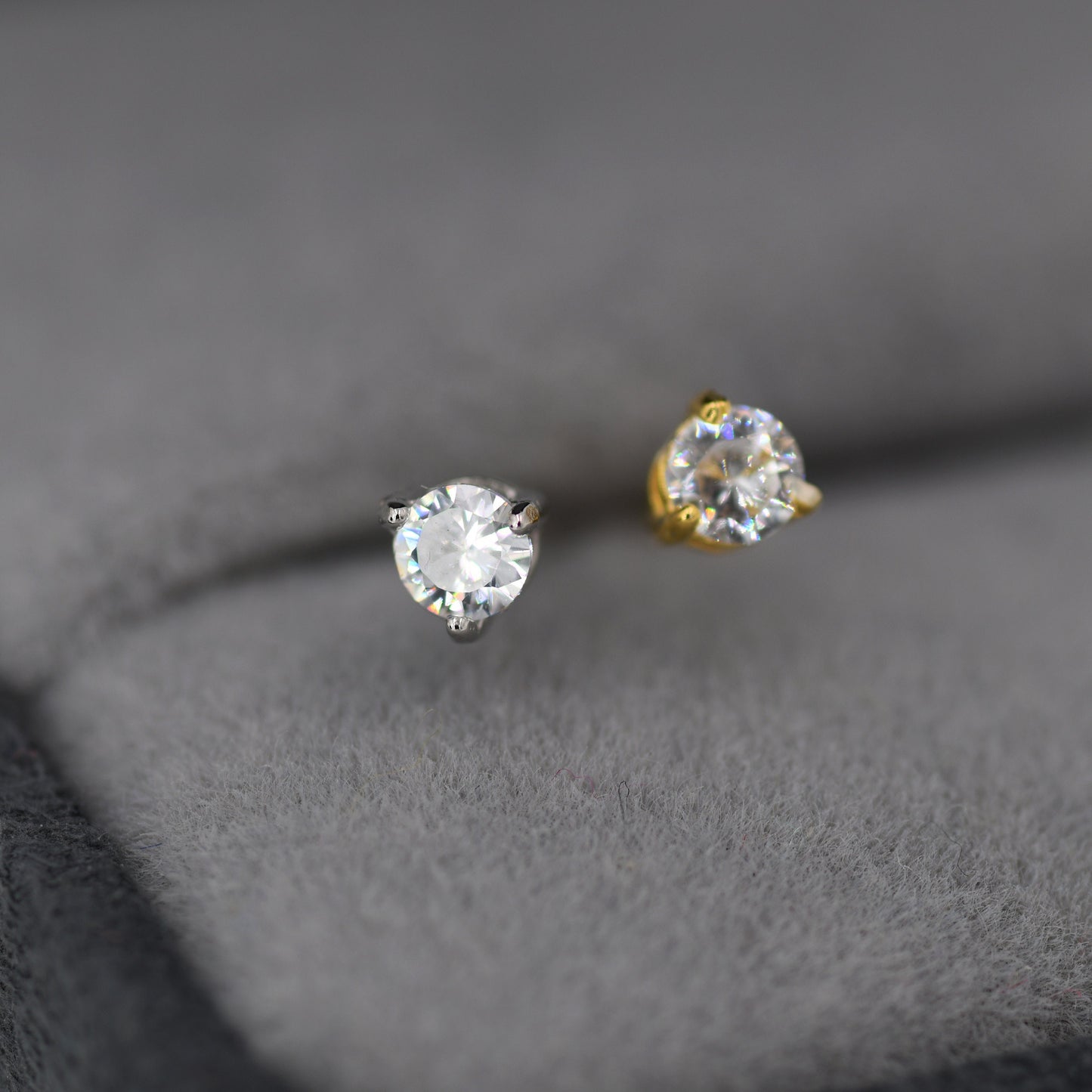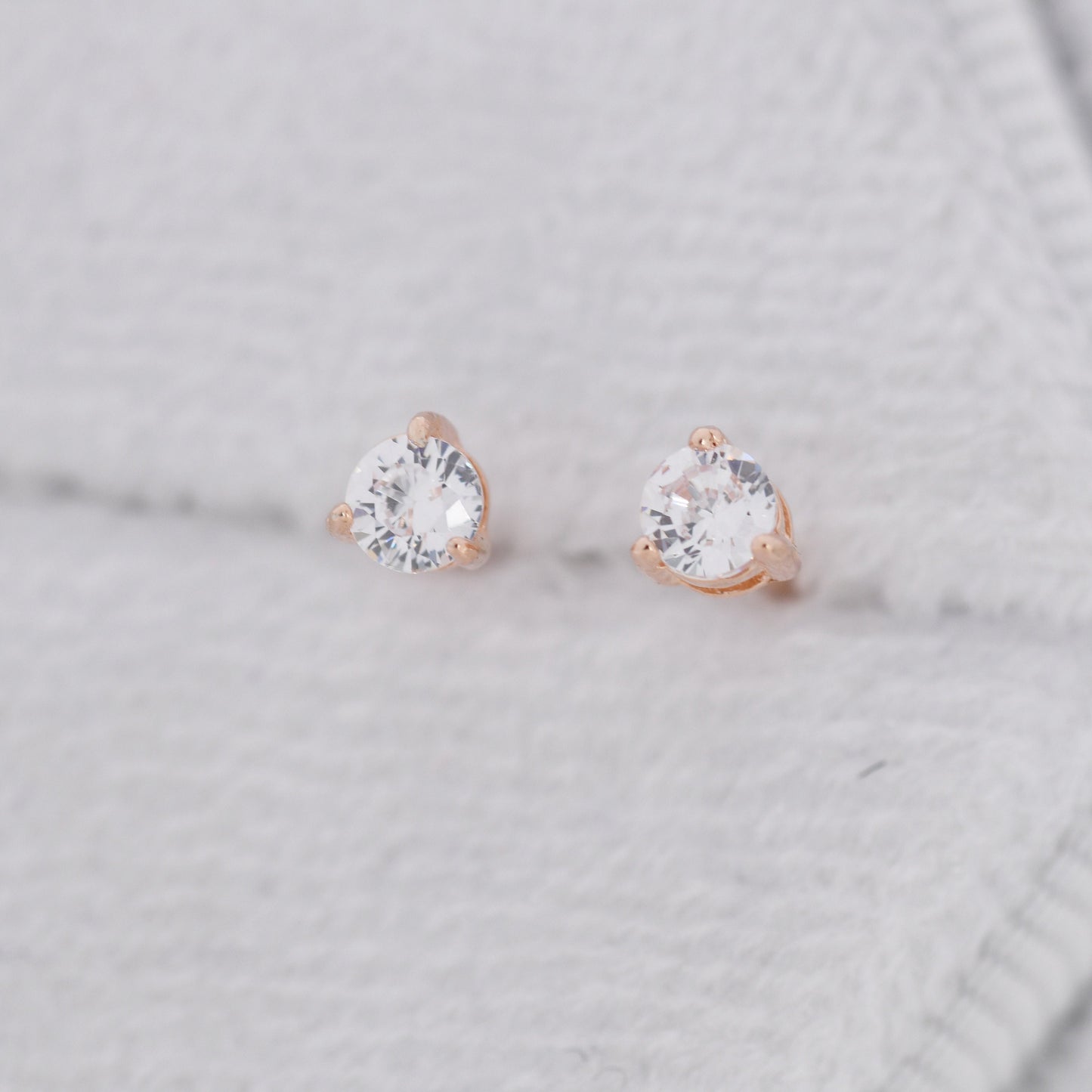 Sterling Silver Three Prong CZ Stud Earrings in Sterling Silver, Silver or Gold or Rose Gold, 3mm CZ, Diamond Stud