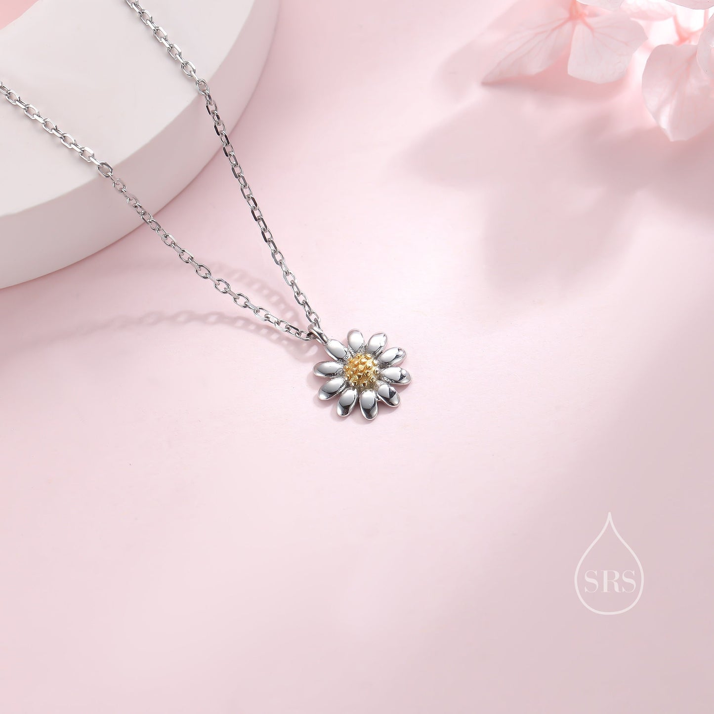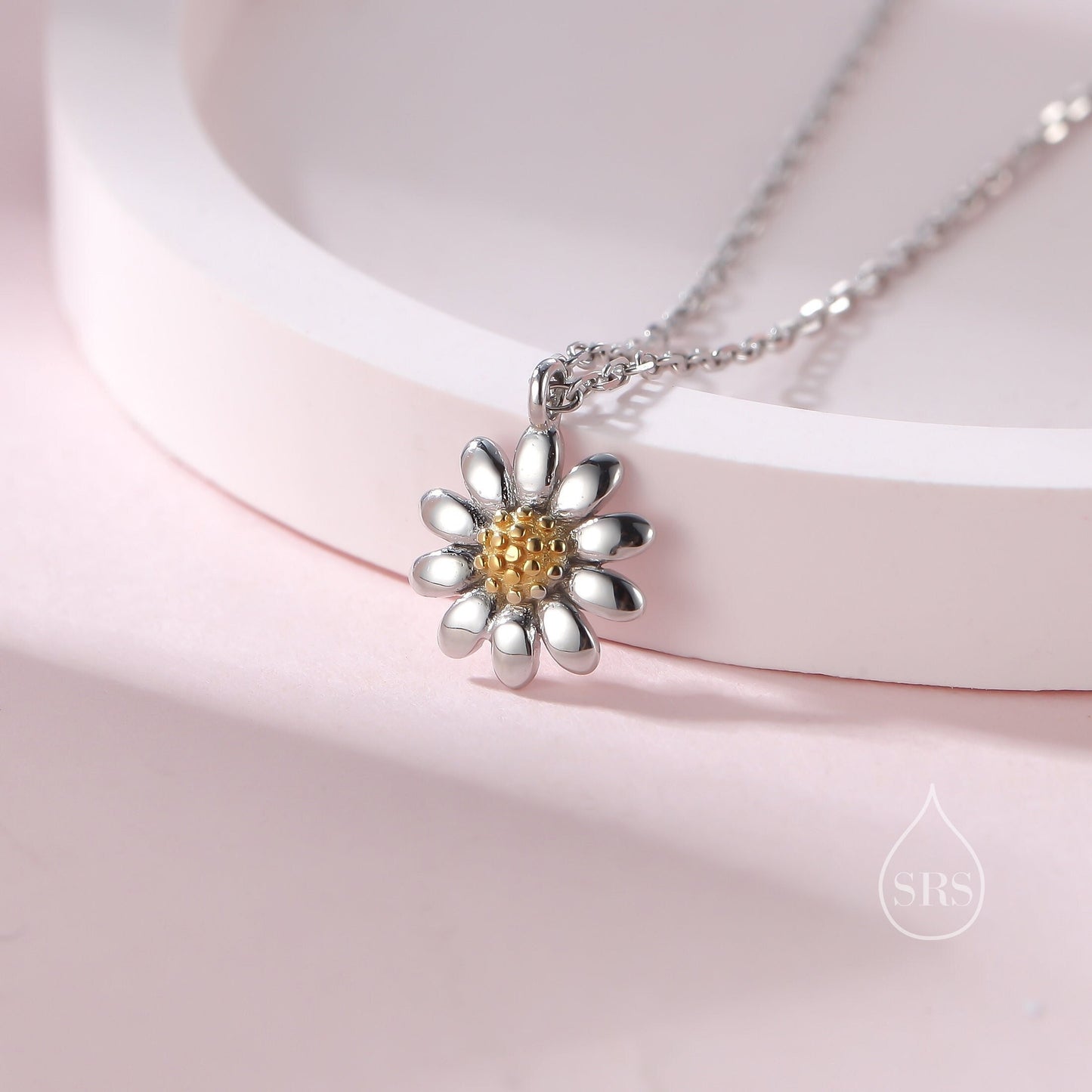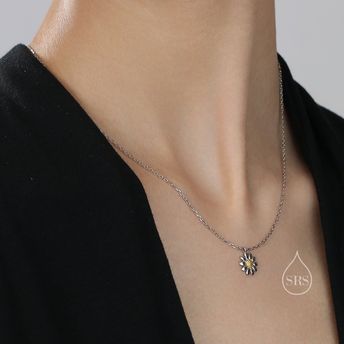 Sterling Silver Tiny Little Daisy Flower Pendant Necklace, Flower Necklace, Daisy Necklace, Two Tone Flower Pendant Necklace
