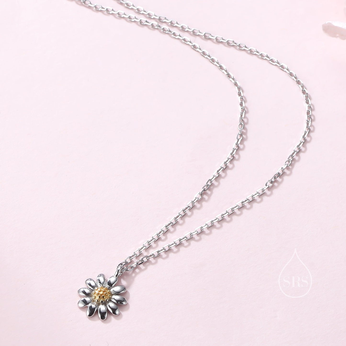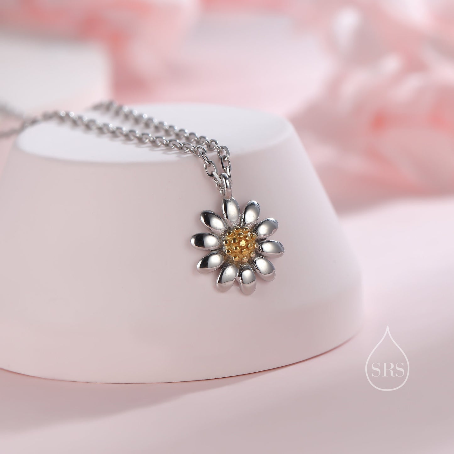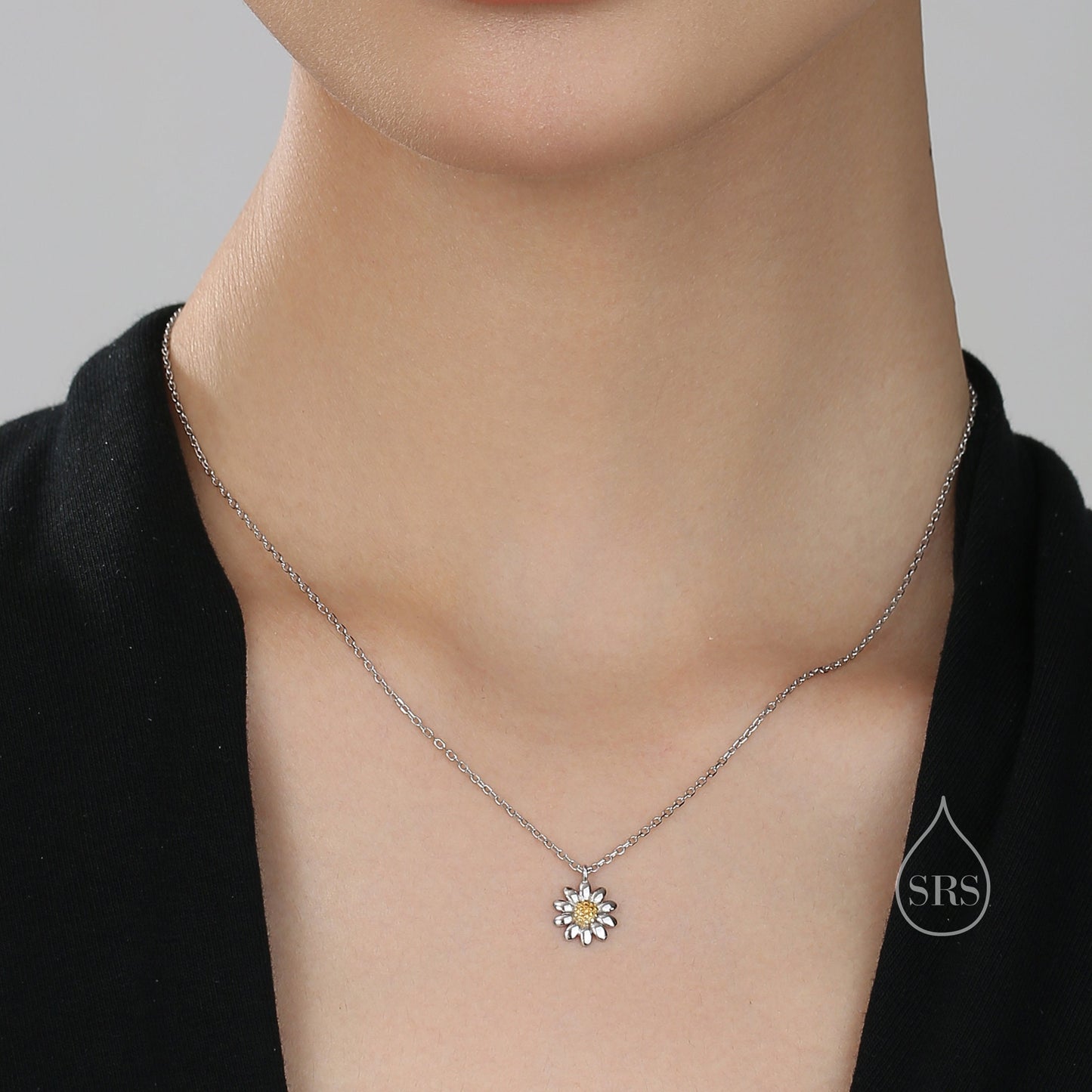 Sterling Silver Tiny Little Daisy Flower Pendant Necklace, Flower Necklace, Daisy Necklace, Two Tone Flower Pendant Necklace